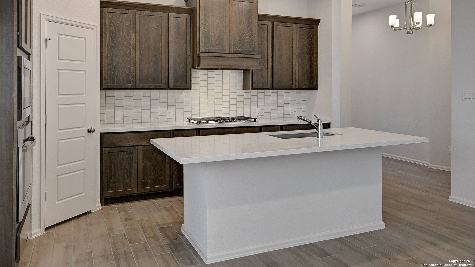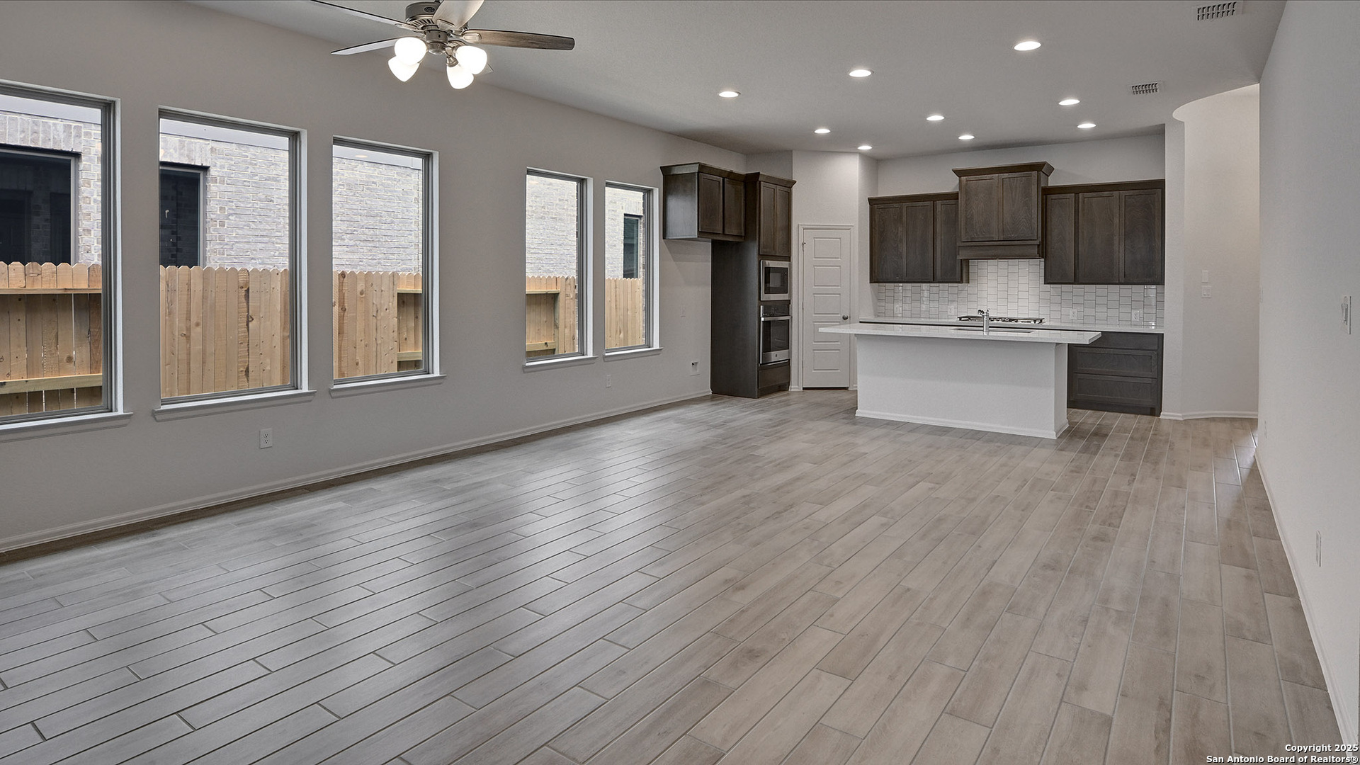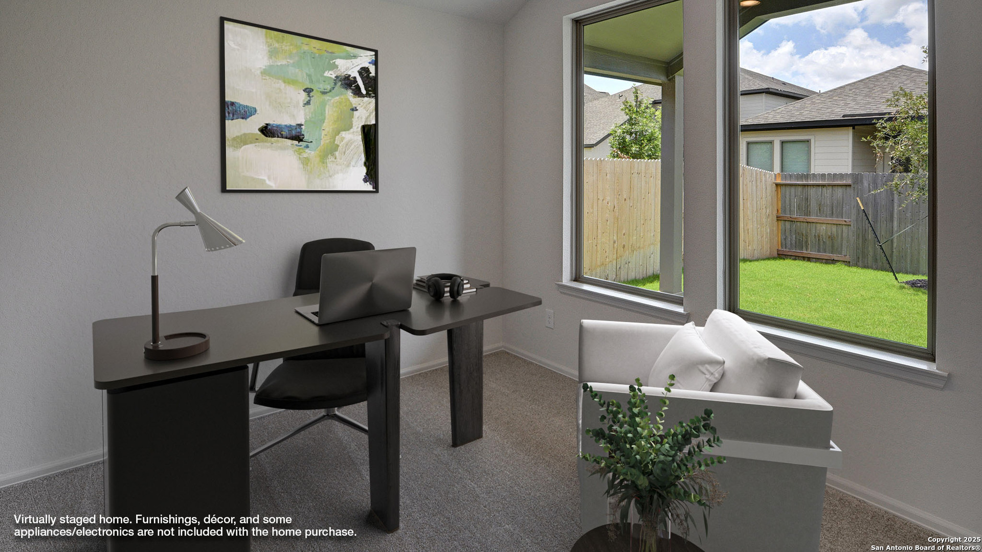 Entry with 11-foot rotunda ceiling leads to open kitchen, dining area and family room. Kitchen features corner walk-in pantry, 5-burner gas cooktop and generous island with built-in seating space. Primary suite includes double-door entry to primary bath with dual vanities, separate glass-enclosed shower and large walk-in closet. Home office with French doors set at back entrance. Large windows, extra closets and mud room add to this spacious three-bedroom home. Covered backyard patio. Two-car garage.