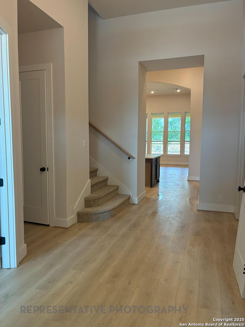 Located on a private Greenbelt homesite backing to a ranch, this 3600 SF home boasts wood floors, enhanced laundry/craftroom, super pantry with cabinetry, upstairs gameroom and entertainment room downstairs, home office, full 3 car garage bay, slide in cooktop/oven and many more upgrades. Home estimated completion November 2025.