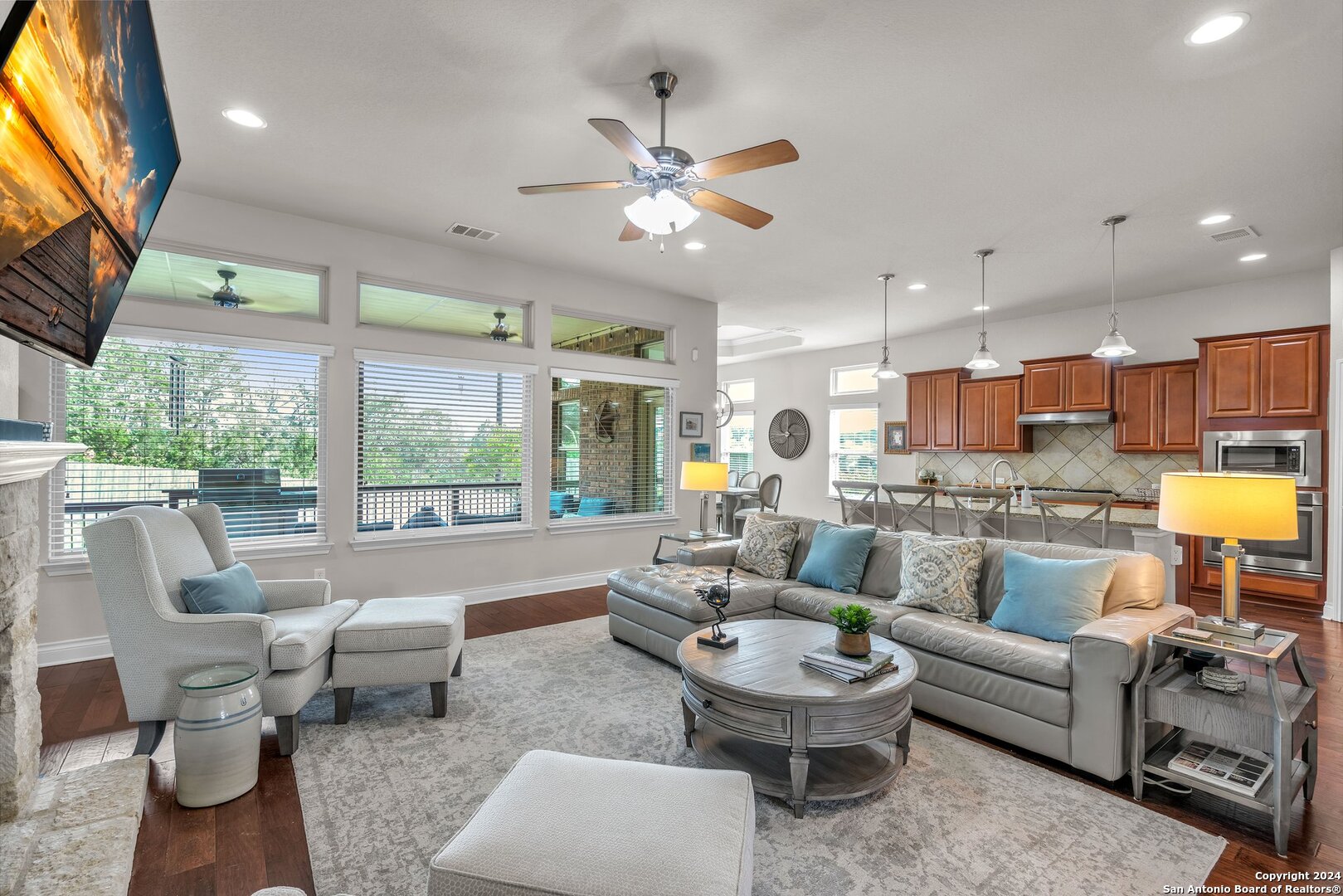 Stunning New Braunfels Home with Scenic Views on Nearly a Quarter Acre! This exquisite open-concept home, located west of I-35, boasts a breathtaking view and is filled with luxurious upgrades. Step inside to discover a beautiful stone fireplace, engineered hardwood floors, and high ceilings throughout. The impressive kitchen features custom cabinetry, a large island, built-in double oven, and a gas cooktop-perfect for the culinary enthusiast. Experience true custom design with a convenient laundry room attached to the master closet. A wall of large windows invites natural light and offers a picturesque view of the extended covered patio, overlooking a serene greenbelt. The spacious backyard is ideal for entertaining guests or enjoying evenings outdoors. As you enter and drive through the subdivision, you'll be captivated by the stunning Hill Country views that surround this beautiful neighborhood. Conveniently located near shopping, top-rated schools, medical offices, and downtown New Braunfels, this home offers easy access to all the essentials. Plus, you're just minutes away from the charming town of Gruene. Don't miss the opportunity to make this New Braunfels beauty your new home!