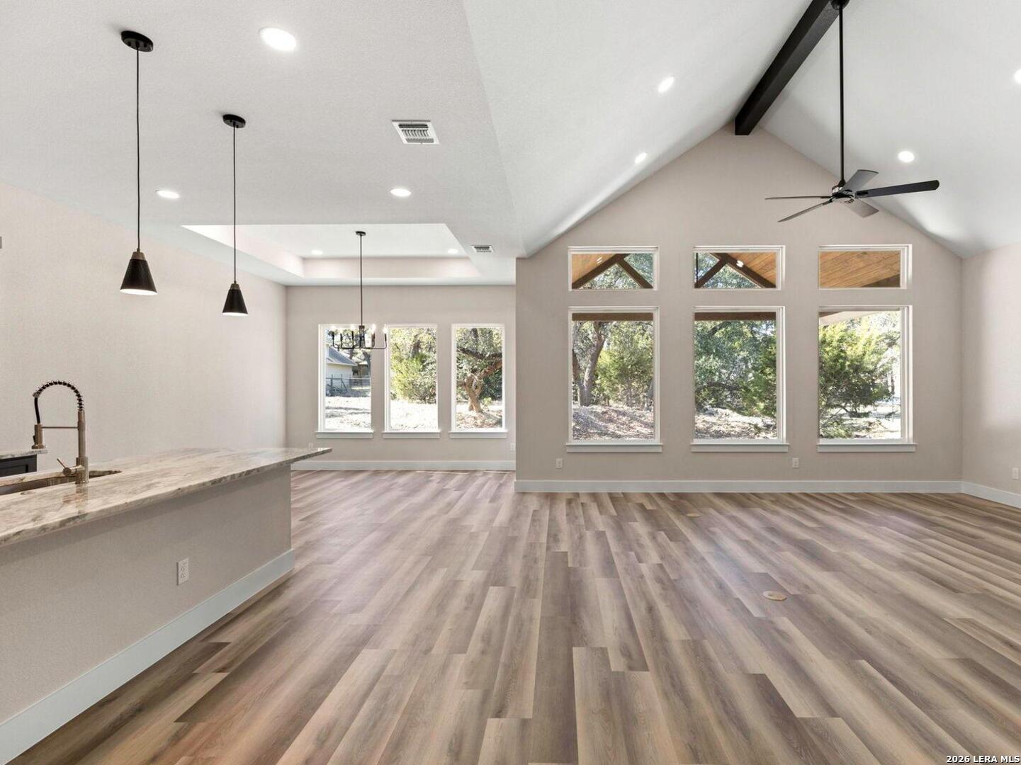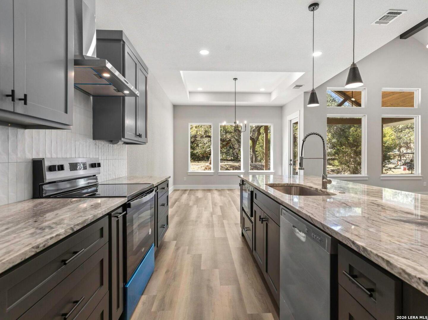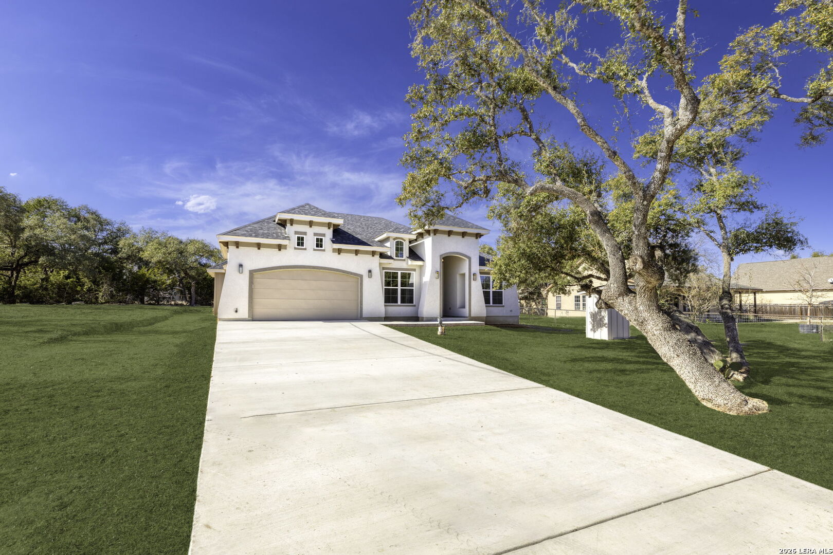 Stunning NEW CONSTRUCTION, single-story luxury home on a half-acre in the heart of the Texas Hill Country. This elegant 4-bedroom, 3-bath residence offers 2,638 square feet of thoughtfully designed living space, blending modern finishes with timeless Hill Country charm. An inviting elongated entry welcomes you with soaring ceilings, natural light, and custom design elements throughout. Two spacious secondary bedrooms share a Jack-and-Jill bath, while a front bedroom with its own full bath offers flexibility for guests, a home office, or multigenerational living. The open-concept living, kitchen, and dining area is ideal for entertaining and everyday living, filled with natural light from oversized windows. The chef's kitchen features granite countertops, a striking metal vent hood, built-in microwave, custom soft-close cabinetry, an oversized walk-in pantry, and a large island with seating.The living room is anchored by a sleek electric fireplace and dramatic ceiling height. The private owner's suite is a true retreat, offering a spacious walk-in closet and spa-like bath with a freestanding soaking tub, dual-entry walk-in shower with dual shower heads, built-in bench, storage niches, double vanity, and oversized mirror. Additional highlights include a mudroom off the two-car garage, a large laundry room with custom cabinetry and counter space, and quality finishes throughout. Enjoy Hill Country living from the covered back porch with beautiful beams, high ceilings, and a ceiling fan-perfect for relaxing while deer and wildlife roam freely. Located in Rivermont, residents enjoy exceptional amenities including Guadalupe River access, a 6-acre river park, pool, pavilion, playground, tennis and basketball courts, picnic areas, and more. Modern luxury, peaceful surroundings, and convenient access to the city, Schedule your showing today!