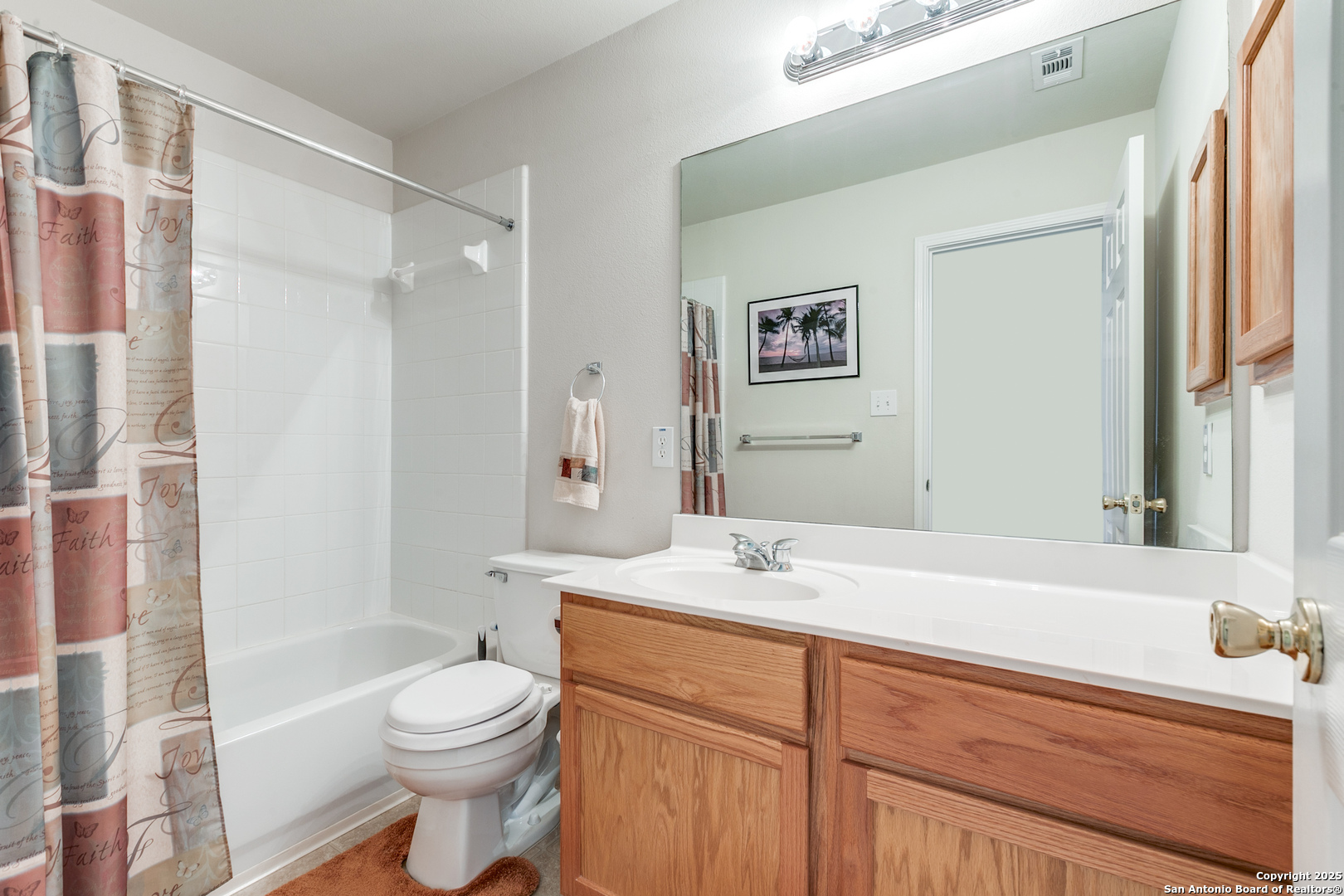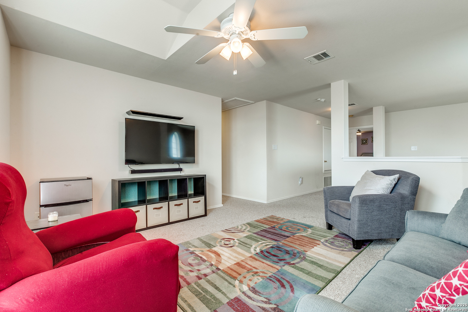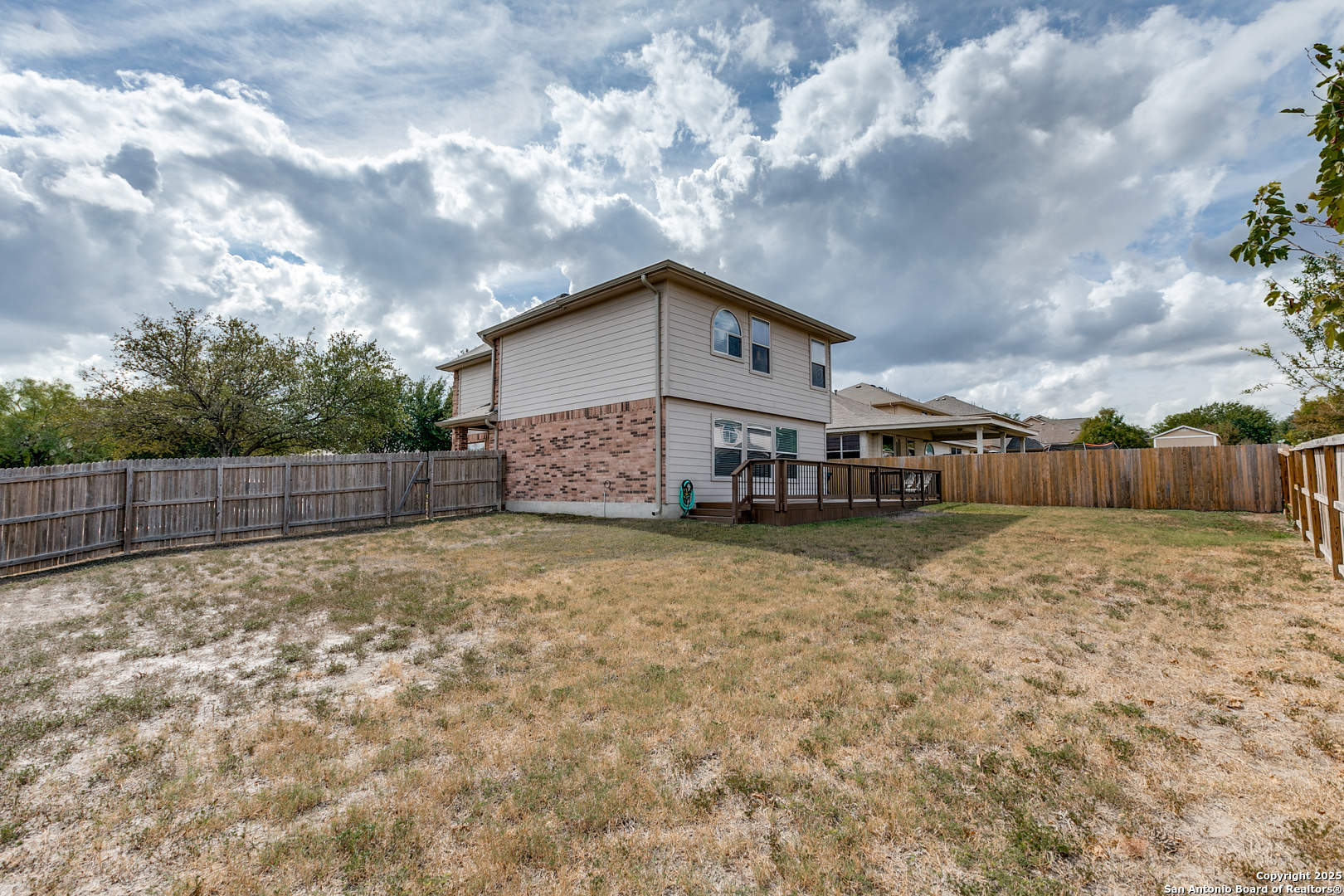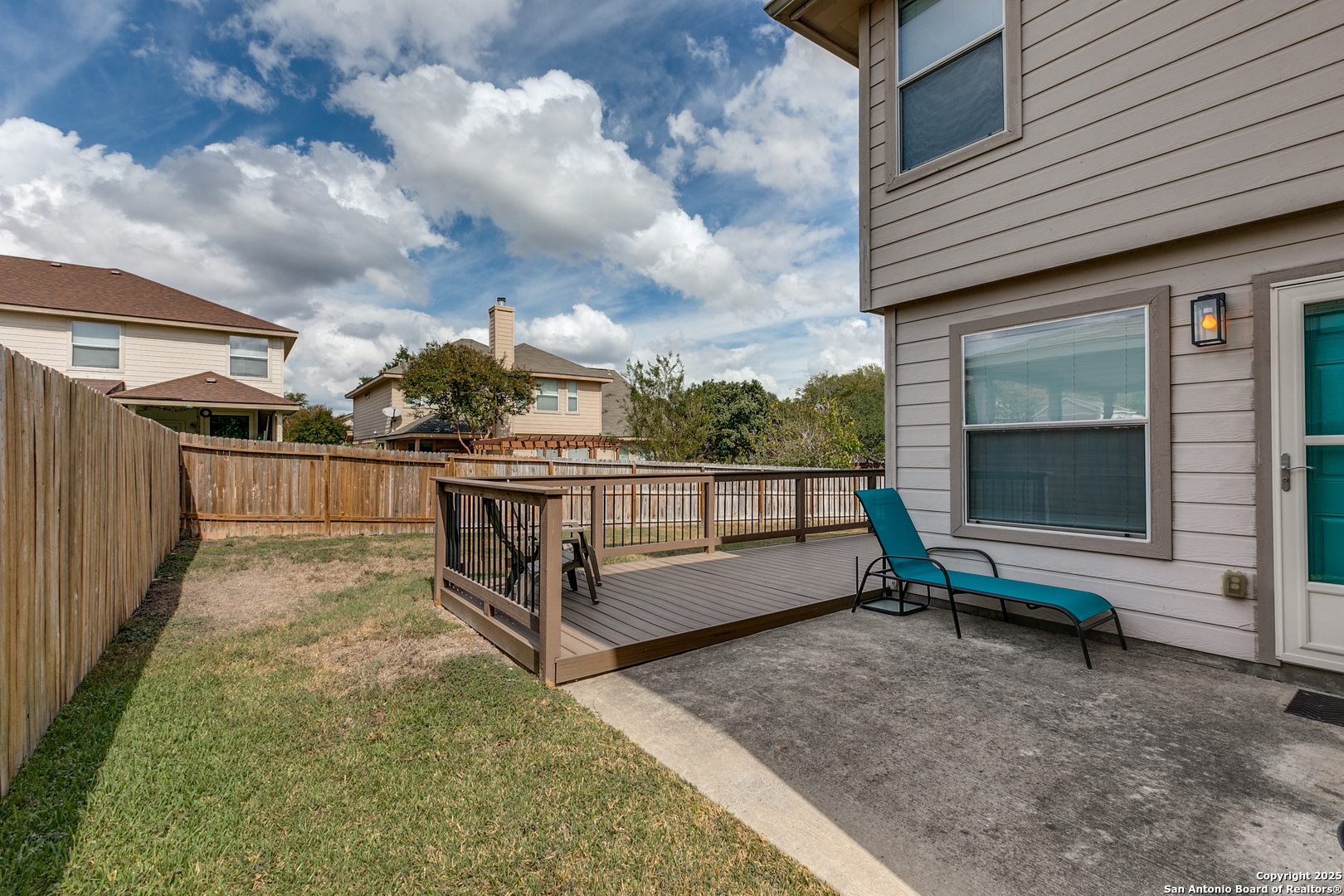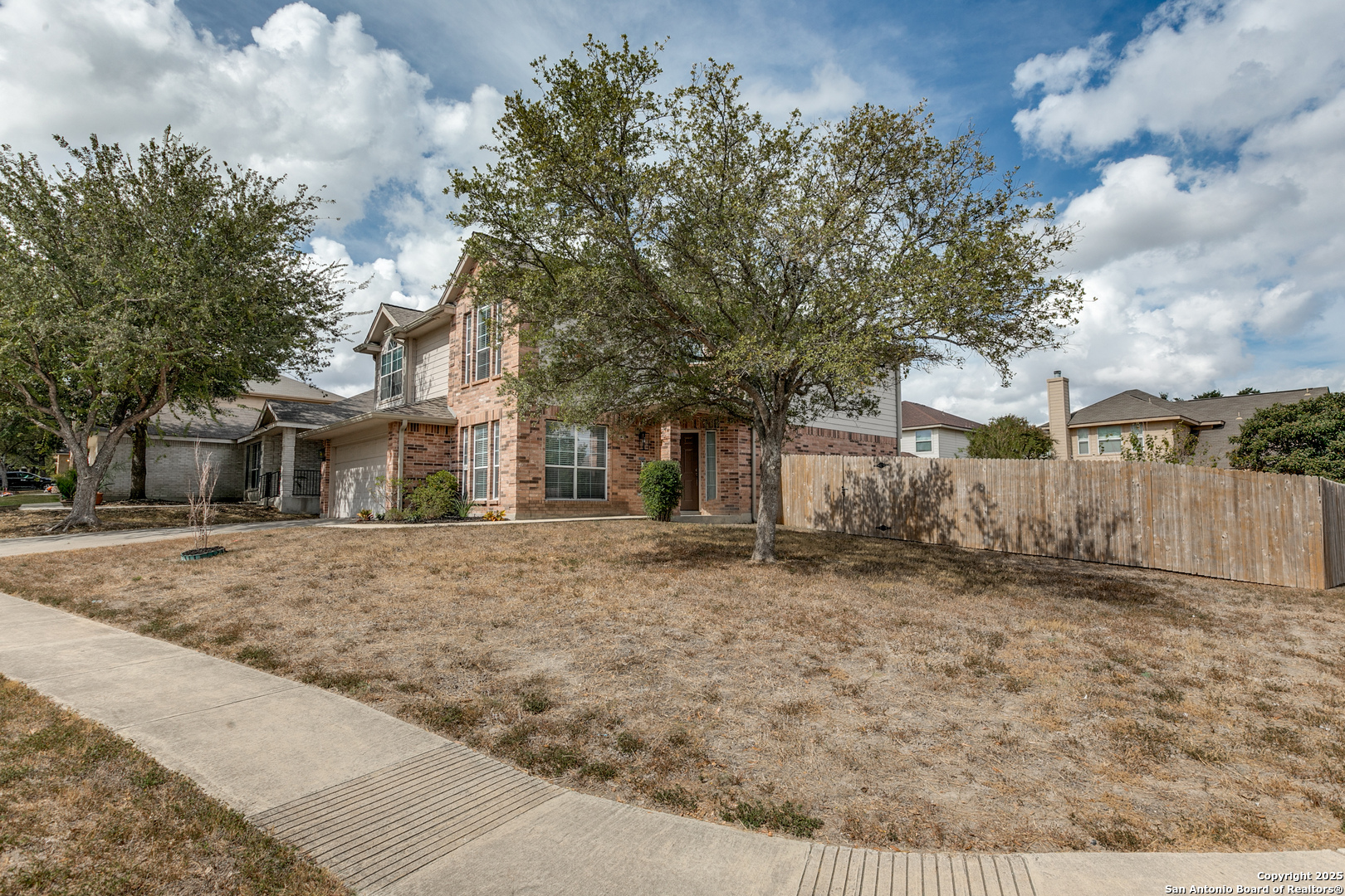Welcome to this beautifully maintained 3-bedroom, 2.5-bath single-family home, perfectly situated on a premium corner lot just outside Loop 1604 and Potranco Road. This inviting property is filled with natural light and features high ceilings in the entryway, creating a bright and open atmosphere from the moment you walk in. The modern kitchen showcases white quartz counter tops, a glass tile back splash, stainless steel appliances, and upgraded light fixtures, ideal for everyday cooking or entertaining. Luxury vinyl plank flooring in wet areas adds both style and durability, while faux wood blinds provide a clean, cohesive look throughout. Enjoy movie nights or family time in the upstairs game room, and take advantage of the spacious backyard complete with a custom composite deck perfect for relaxing or hosting gatherings. Conveniently located close to popular eateries, shopping centers, and major highways, this home offers both comfort and accessibility. Whether you're starting your home ownership journey or looking for a move-in-ready property, this gem is the perfect starter home for any family.