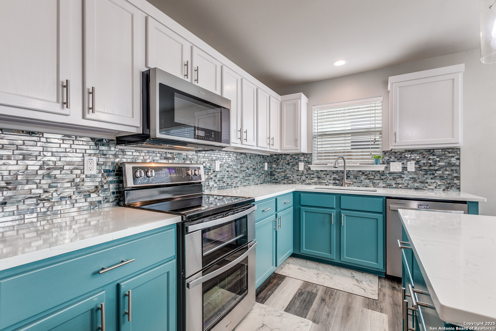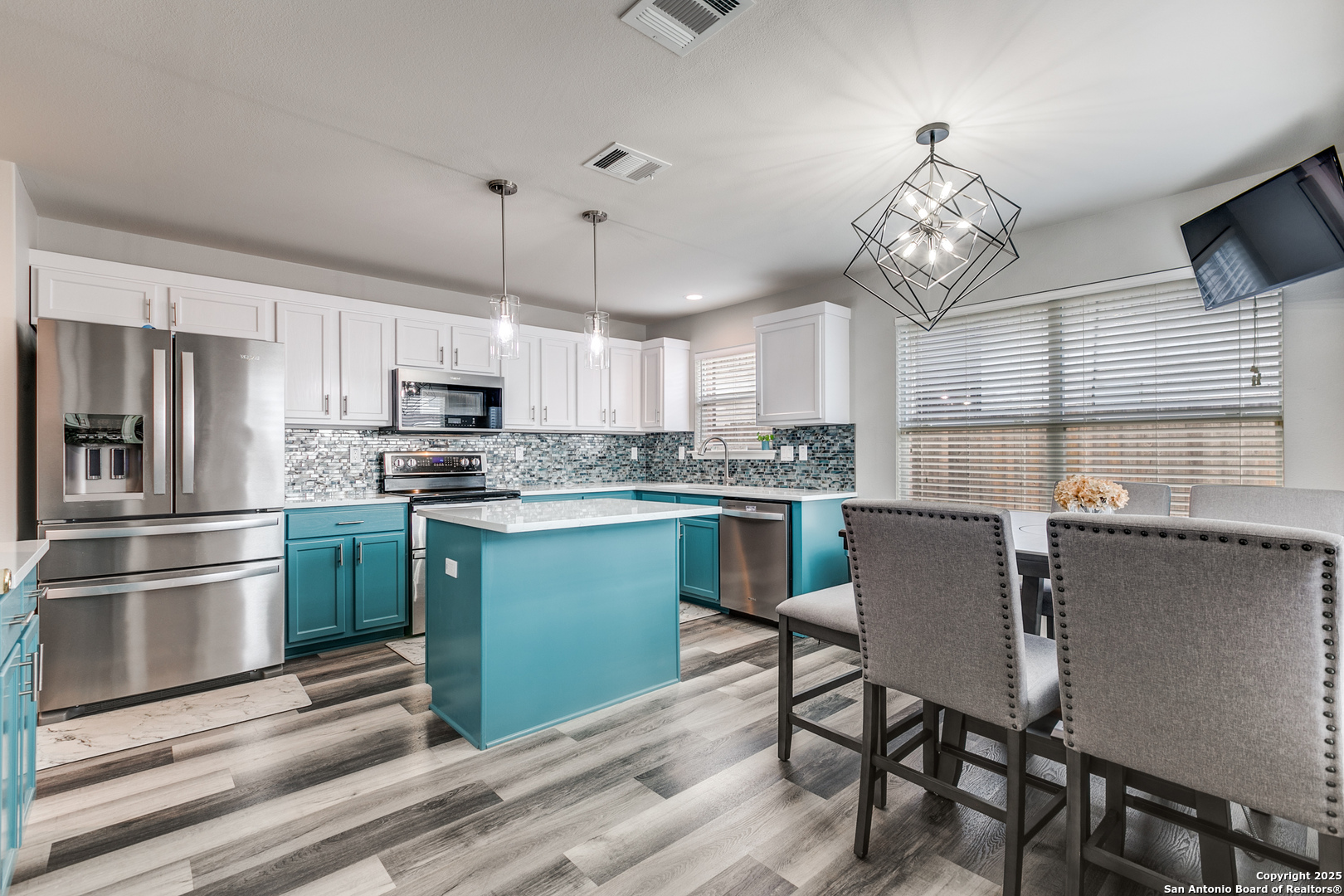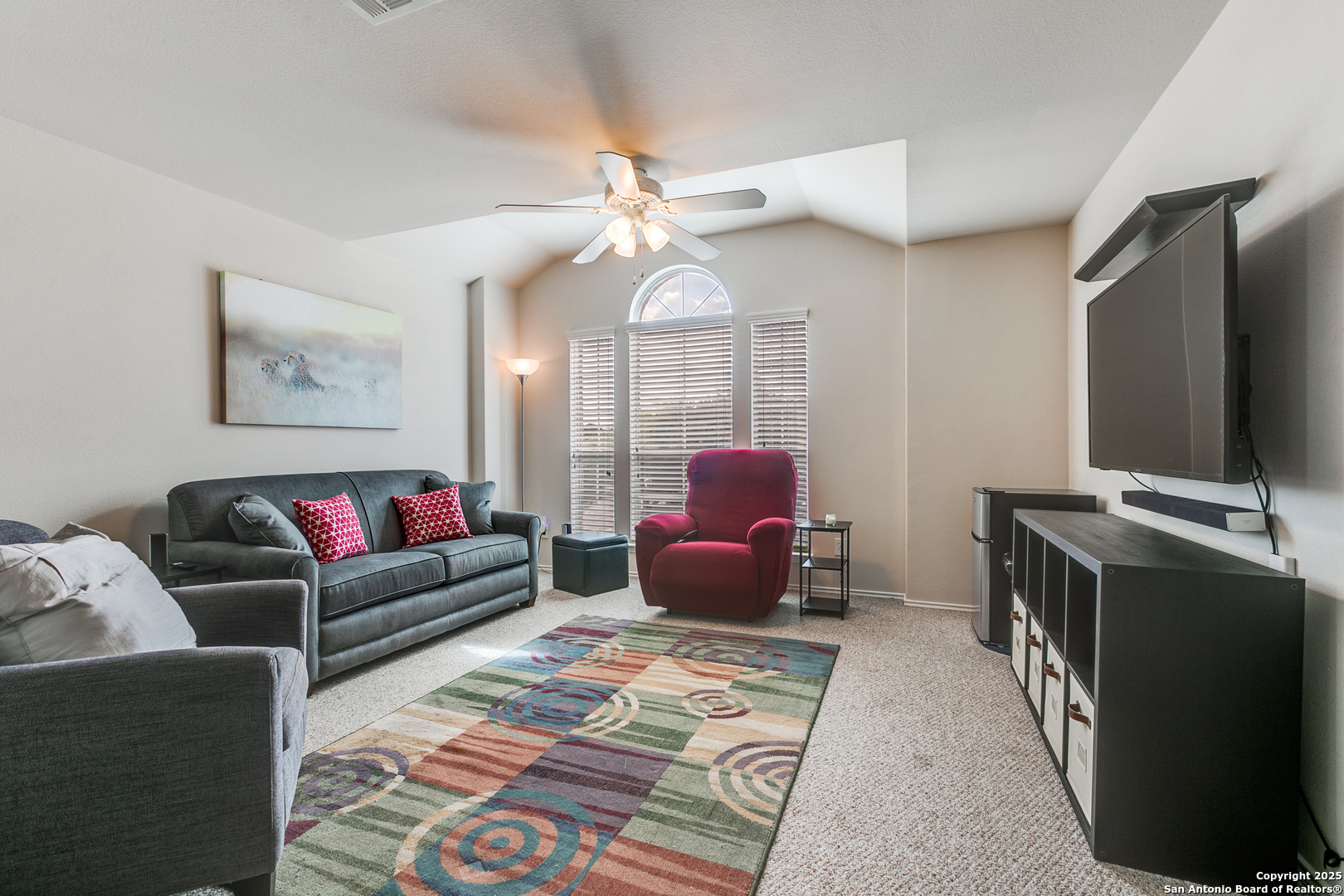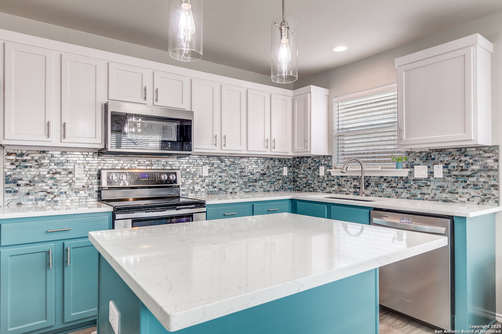 Welcome to this beautifully maintained 3-bedroom, 2.5-bath single-family home, perfectly situated on a premium corner lot just outside Loop 1604 and Potranco Road. This inviting property is filled with natural light and features high ceilings in the entryway, creating a bright and open atmosphere from the moment you walk in. The modern kitchen showcases white quartz counter tops, a glass tile back splash, stainless steel appliances, and upgraded light fixtures, ideal for everyday cooking or entertaining. Luxury vinyl plank flooring in wet areas adds both style and durability, while faux wood blinds provide a clean, cohesive look throughout. Enjoy movie nights or family time in the upstairs game room, and take advantage of the spacious backyard complete with a custom composite deck perfect for relaxing or hosting gatherings. Conveniently located close to popular eateries, shopping centers, and major highways, this home offers both comfort and accessibility. Whether you're starting your home ownership journey or looking for a move-in-ready property, this gem is the perfect starter home for any family.