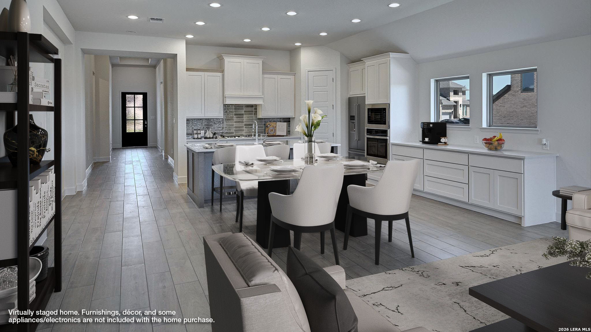 Extended entry with 13-foot ceiling leads to open kitchen, dining area and family room. Kitchen offers generous counter space, 5-burner gas cooktop, corner walk-in pantry and inviting island with built-in seating space. Dining area flows into family room with a cast stone fireplace and wall of windows. Game room with French doors just across from kitchen. Primary suite includes double-door entry to primary bath with dual vanities, garden tub, separate glass-enclosed shower and two large walk-in closets. Secondary bedrooms feature walk-in closets. Extended covered backyard patio. Mud room off two-car garage.