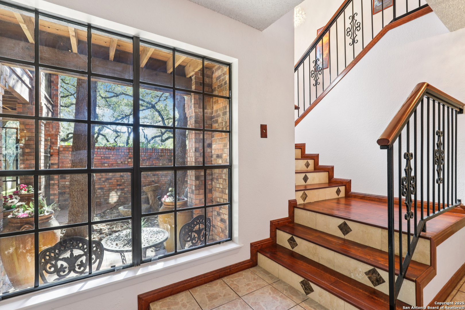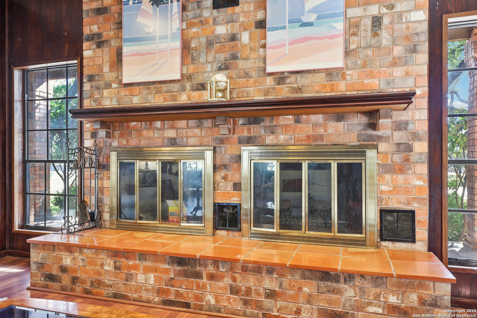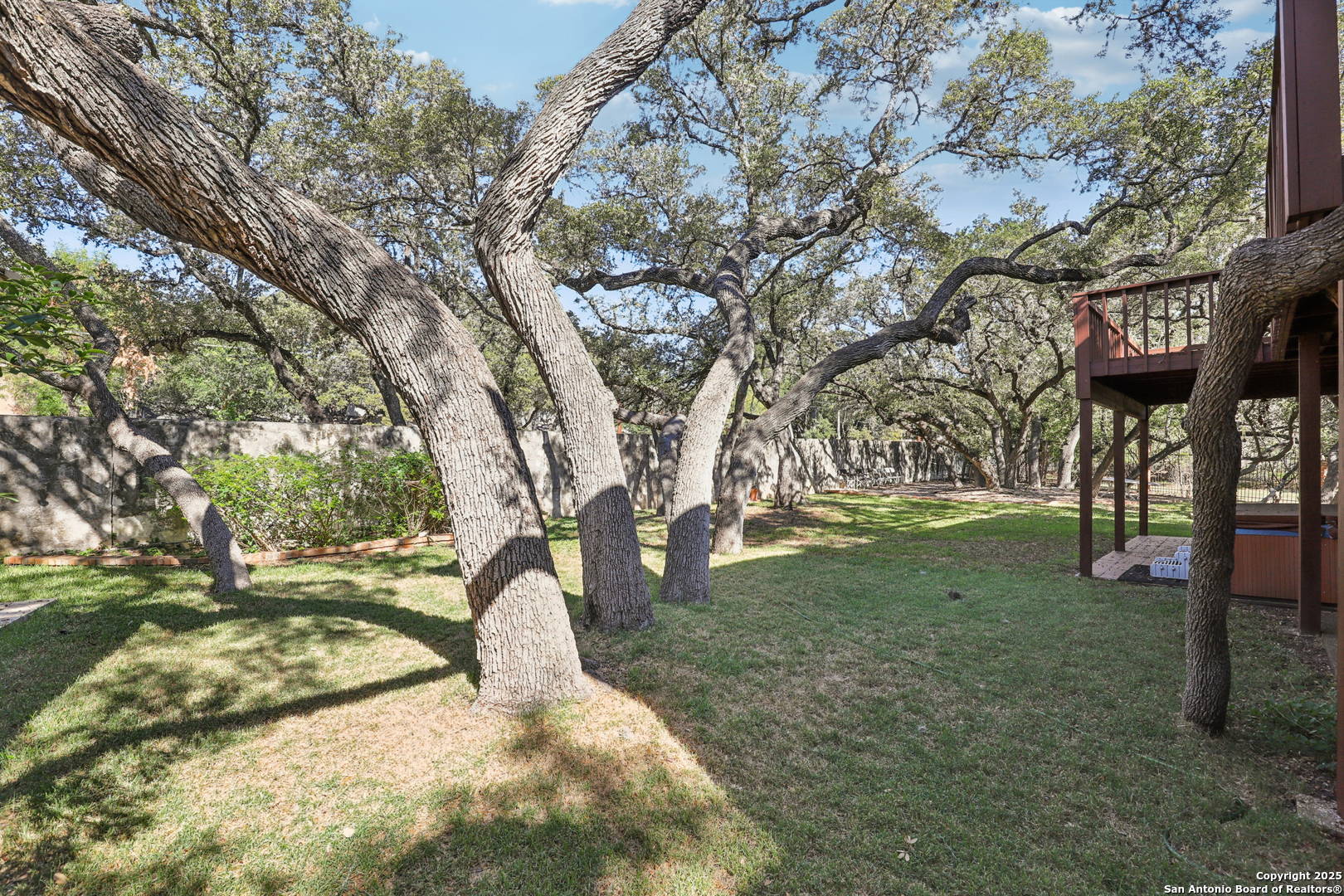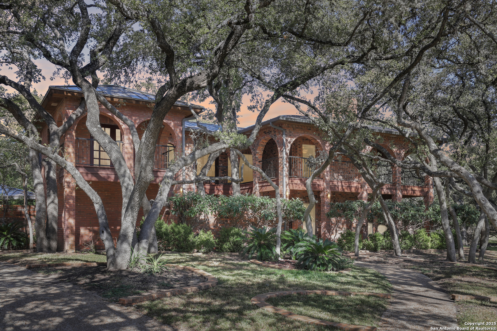 Nestled within the prestigious guard-gated enclave of Elm Creek, 12727 Old Wick delivers 3,698 sq. ft. of elegant living across an expansive .4-acre estate richly shaded by majestic live oaks and enveloped by a rare greenbelt view to the right and rear-ensuring unmatched privacy and serenity. Constructed in 1980 and crowned by a durable metal roof, this architectural residence presents two primary-suite options: the main upstairs wing with its own fireplace and then a downstairs suite that has an additional private access to backyard-ideal for guests, multigenerational living or a refined mother-in-law retreat. Upstairs you'll find three additional bedrooms. The fifth bedroom is currently being used as a flexible loft/game room, while downstairs features the heart of the home: a formal dining room, gourmet kitchen with breakfast bar and island, and gracious living areas anchored by two custom brick fireplaces - one wood burning and the other gas. The wrap-around porches on both levels invite alfresco gatherings under the dappled shade of old-world oaks, while the backyard oasis showcases a large covered patio, a well maintained hot tub and a sweeping lawn framed by masonry walls-evoking the feel of a private park. A detached two-car garage with secured gate access adds discretion and convenience. As a resident of Elm Creek, you'll enjoy access to a resort-style amenity center with pool, walking trails, playground, tennis and basketball courts-balancing serene sophistication with vibrant community lifestyle. This home marries timeless craftsmanship with a coveted location and is one of the finest finds in San Antonio's luxury market. Located minutes from the Alon Center, Medical Center, VA Hospital, the JCC, Grocery stores, restaurants and shopping. Easy access to Wurzbach Pkwy, Loop 1604, Loop 410 and I-10!