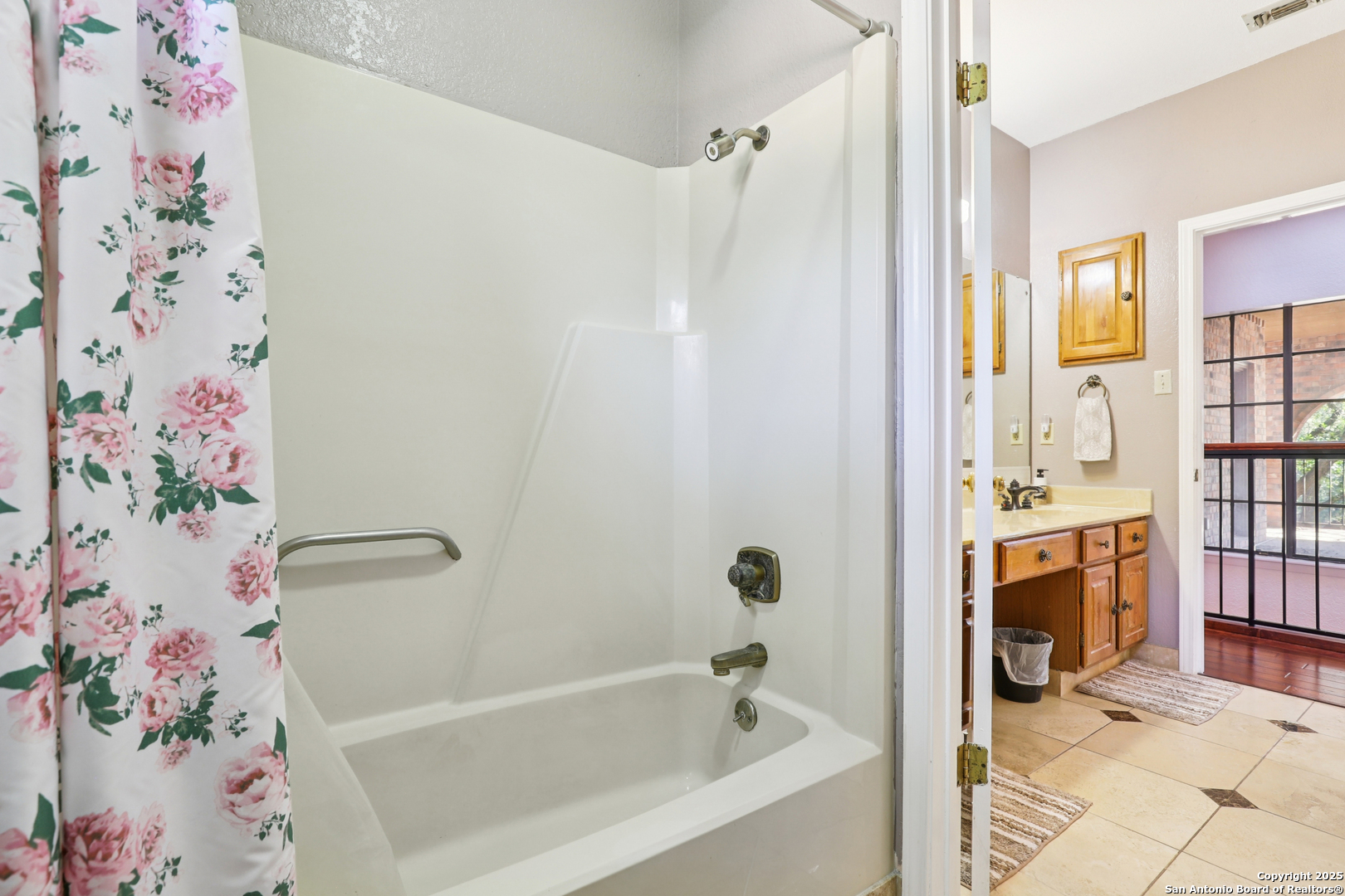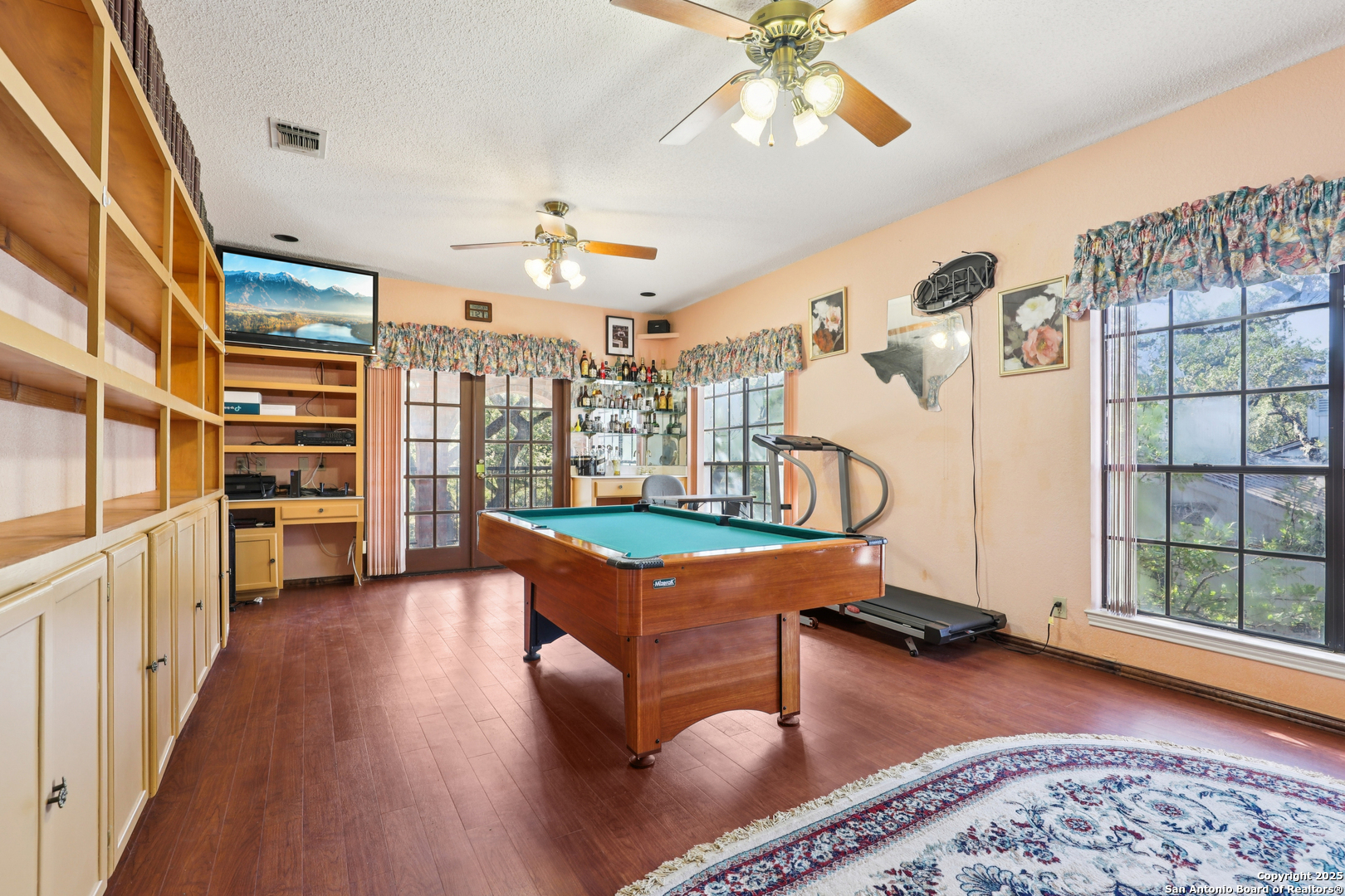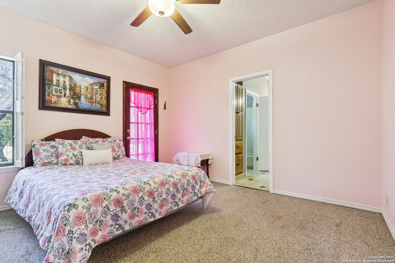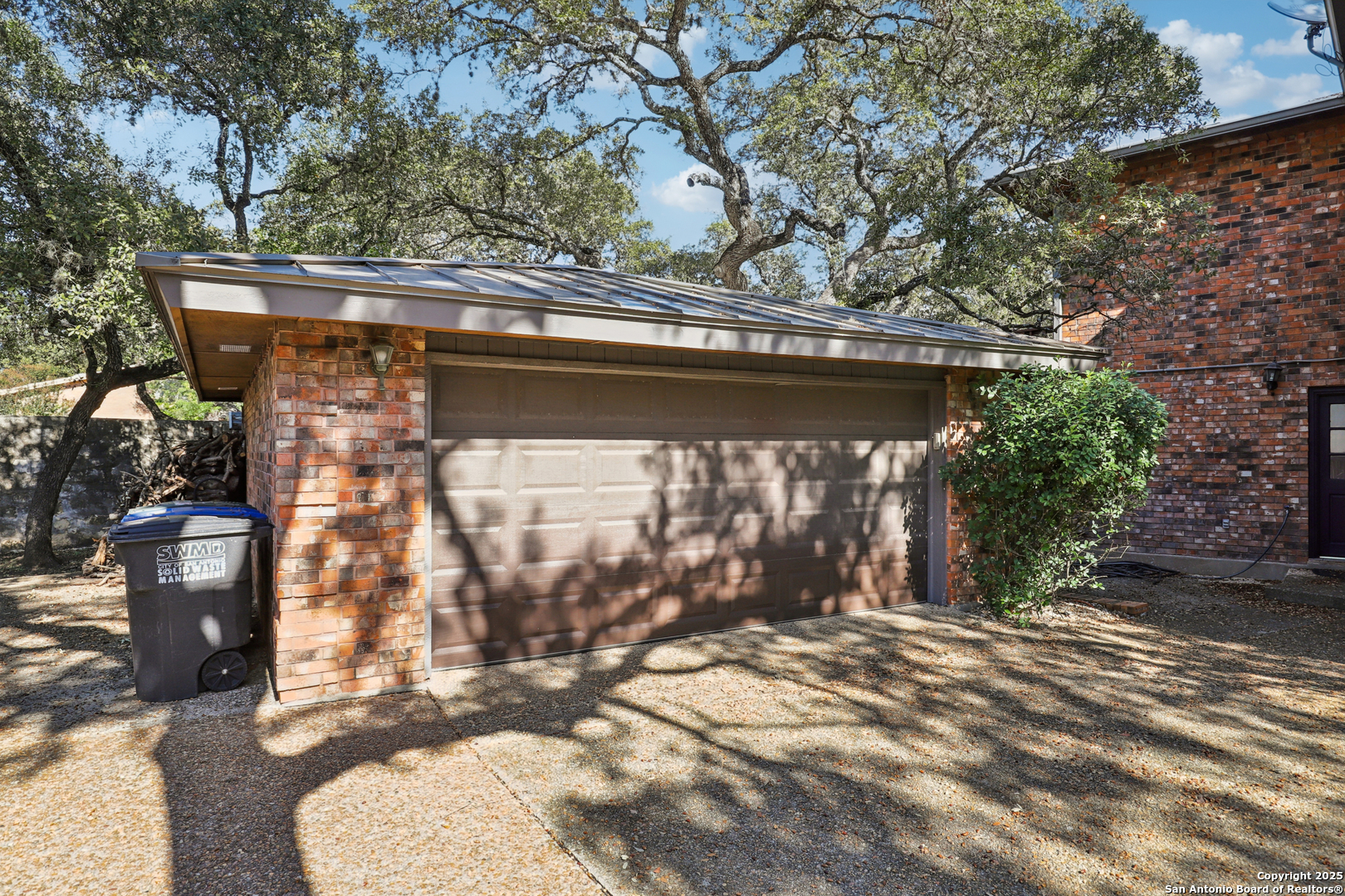 Nestled within the prestigious guard-gated enclave of Elm Creek, 12727 Old Wick delivers 3,698 sq. ft. of elegant living across an expansive .4-acre estate richly shaded by majestic live oaks and enveloped by a rare greenbelt view to the right and rear-ensuring unmatched privacy and serenity. Constructed in 1980 and crowned by a durable metal roof, this architectural residence presents two primary-suite options: the main upstairs wing with its own fireplace and then a downstairs suite that has an additional private access to backyard-ideal for guests, multigenerational living or a refined mother-in-law retreat. Upstairs you'll find three additional bedrooms. The fifth bedroom is currently being used as a flexible loft/game room, while downstairs features the heart of the home: a formal dining room, gourmet kitchen with breakfast bar and island, and gracious living areas anchored by two custom brick fireplaces - one wood burning and the other gas. The wrap-around porches on both levels invite alfresco gatherings under the dappled shade of old-world oaks, while the backyard oasis showcases a large covered patio, a well maintained hot tub and a sweeping lawn framed by masonry walls-evoking the feel of a private park. A detached two-car garage with secured gate access adds discretion and convenience. As a resident of Elm Creek, you'll enjoy access to a resort-style amenity center with pool, walking trails, playground, tennis and basketball courts-balancing serene sophistication with vibrant community lifestyle. This home marries timeless craftsmanship with a coveted location and is one of the finest finds in San Antonio's luxury market. Located minutes from the Alon Center, Medical Center, VA Hospital, the JCC, Grocery stores, restaurants and shopping. Easy access to Wurzbach Pkwy, Loop 1604, Loop 410 and I-10!