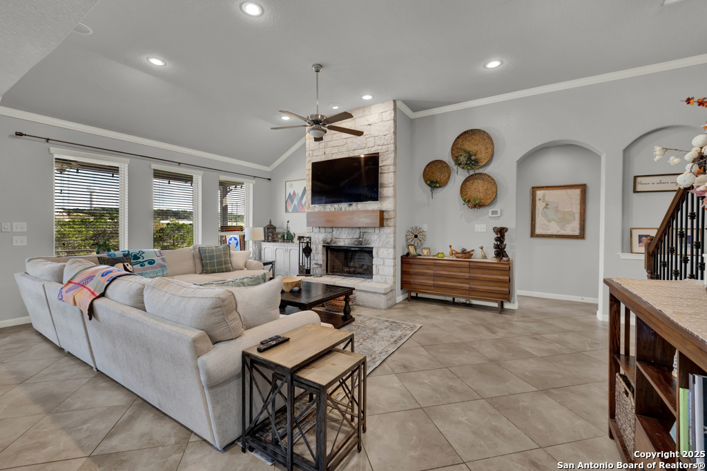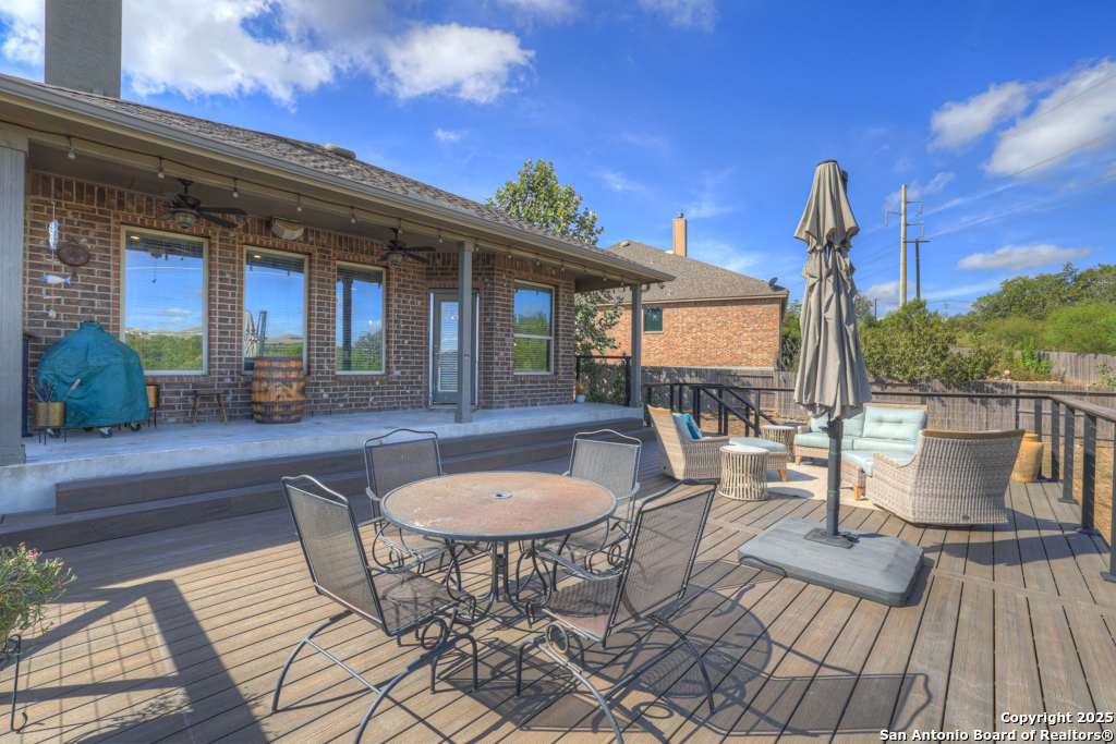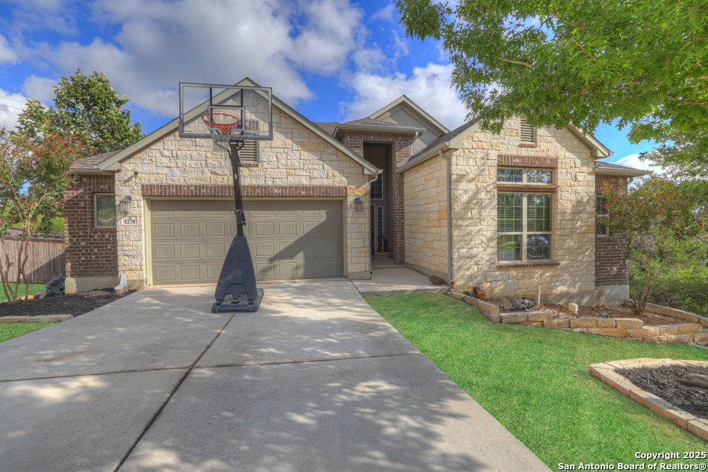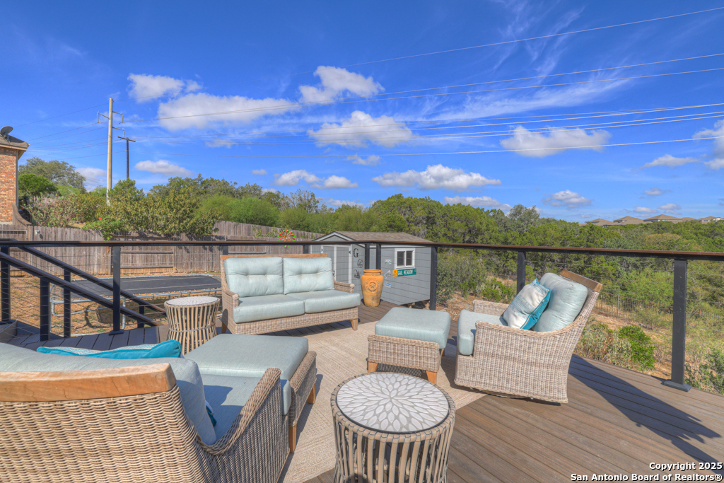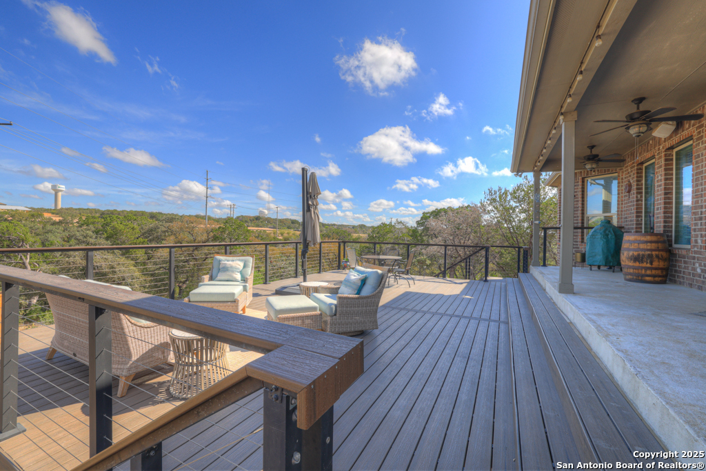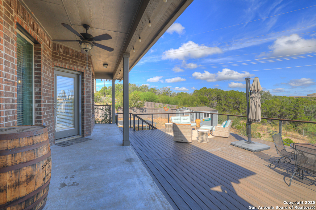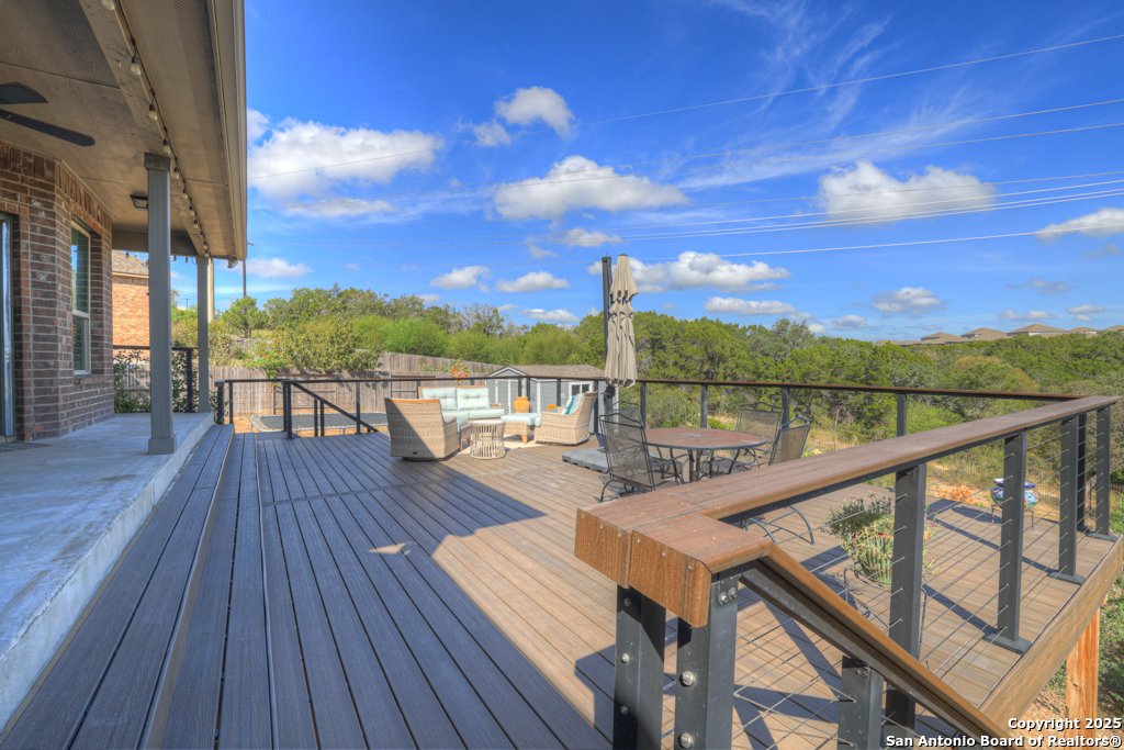 Welcome to the Estates of Stone Crossing. This spacious 1 1/2 story home offers a flexible 2657 Sq. Ft. floor plan that consists of 4 bedrooms, 3 bathrooms, 2 living areas, an open kitchen and dining area. Upon entering the home and exiting the foyer, you have access to 3 secondary bedrooms and their bathroom. One of the bedrooms is currently being used as an office/study. The master suite is spacious and offers an abundance of natural light and an incredible view. The master bathroom has dual sinks, granite tops and an oversized mirror plus a grand walk-in shower. The L-shaped closet provides lots of space for your apparel. The primary living area is accented with a wood burning fireplace. The living area, kitchen and dining are open and are great for relaxing or for entertainment. The kitchen has an island that enhances these features. There is an abundance of cabinets and a nice walk-in pantry. Whether you are relaxing or entertaining, you will appreciate the incredible view from several windows over the back yard and the neighboring wooded canyon. You can also enjoy this view while sitting on the 580 Sq. Ft. deck that is durably built with composite deck material. Our home also offers a second living area which is located on the second floor along with the 3rd full bathroom. This exquisite home sits on a .48-acre fenced lot and is conveniently located to easy access points within New Braunfels.