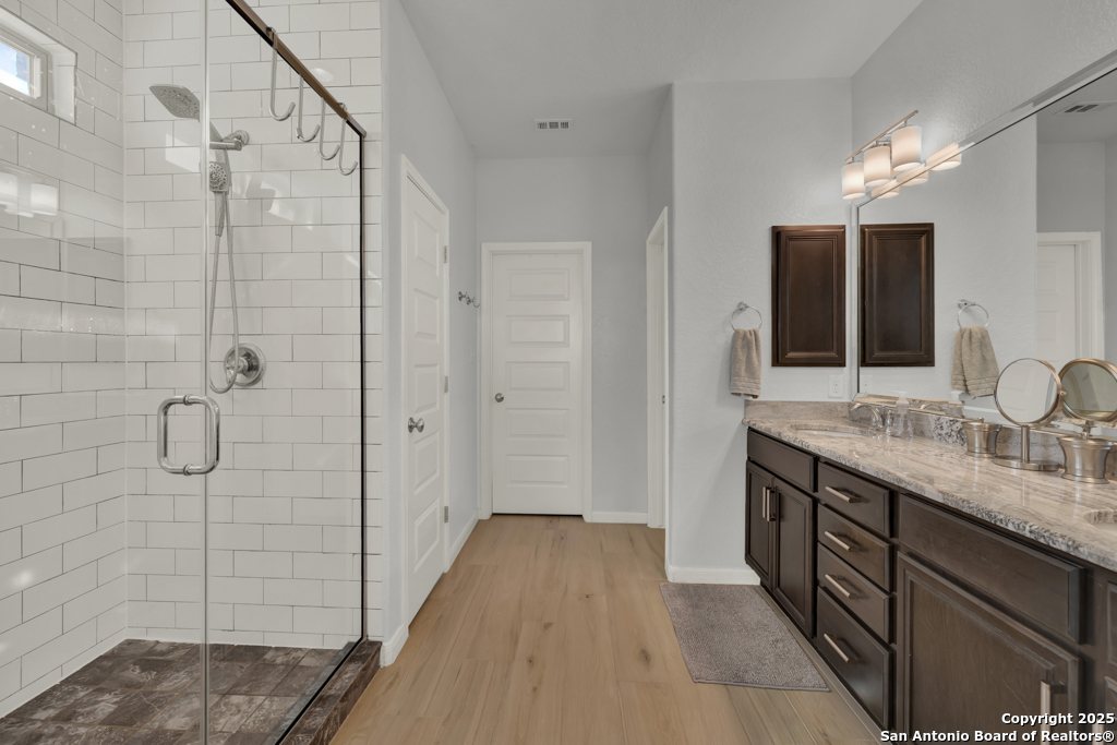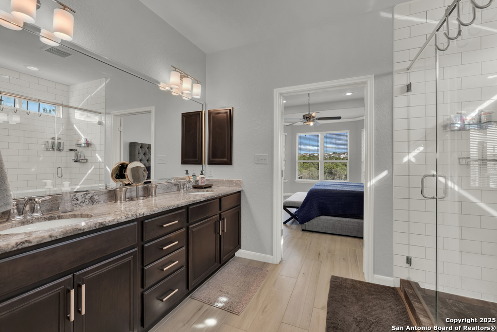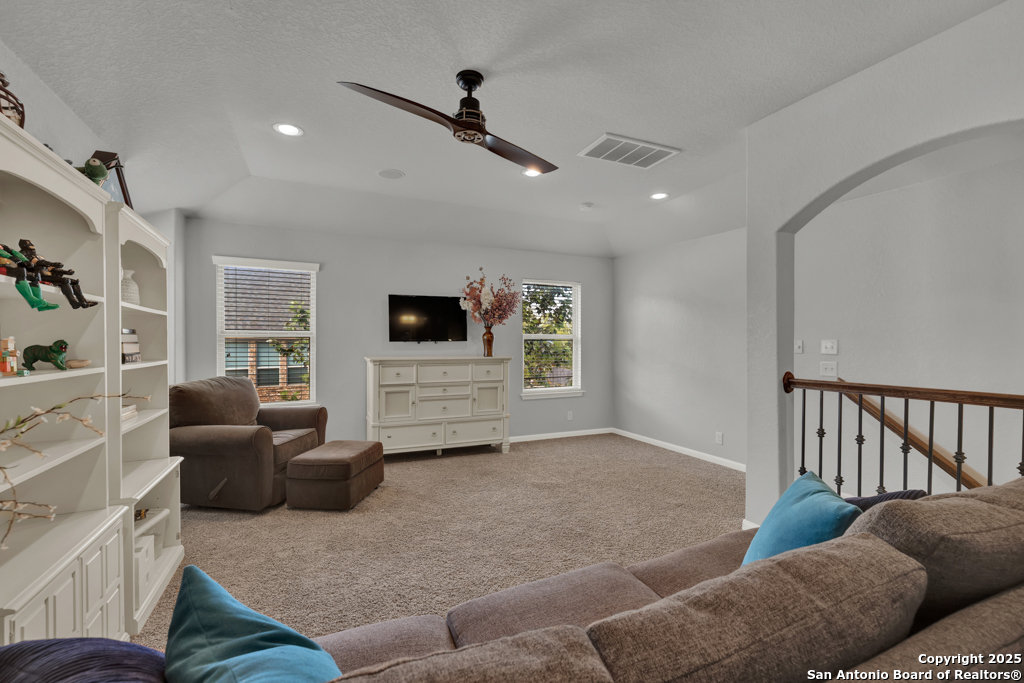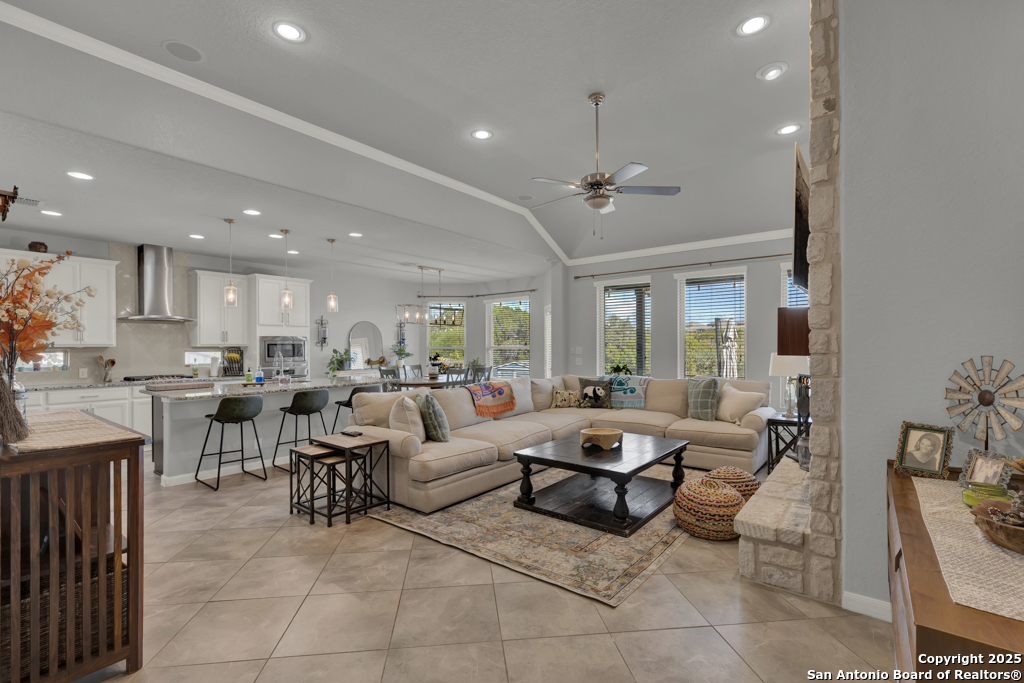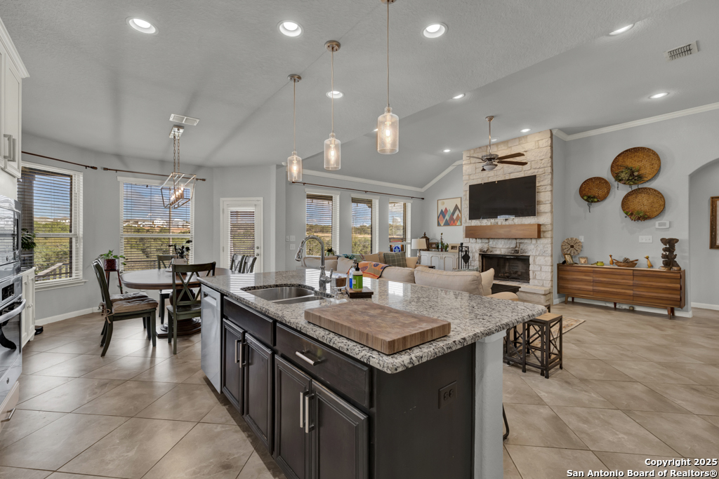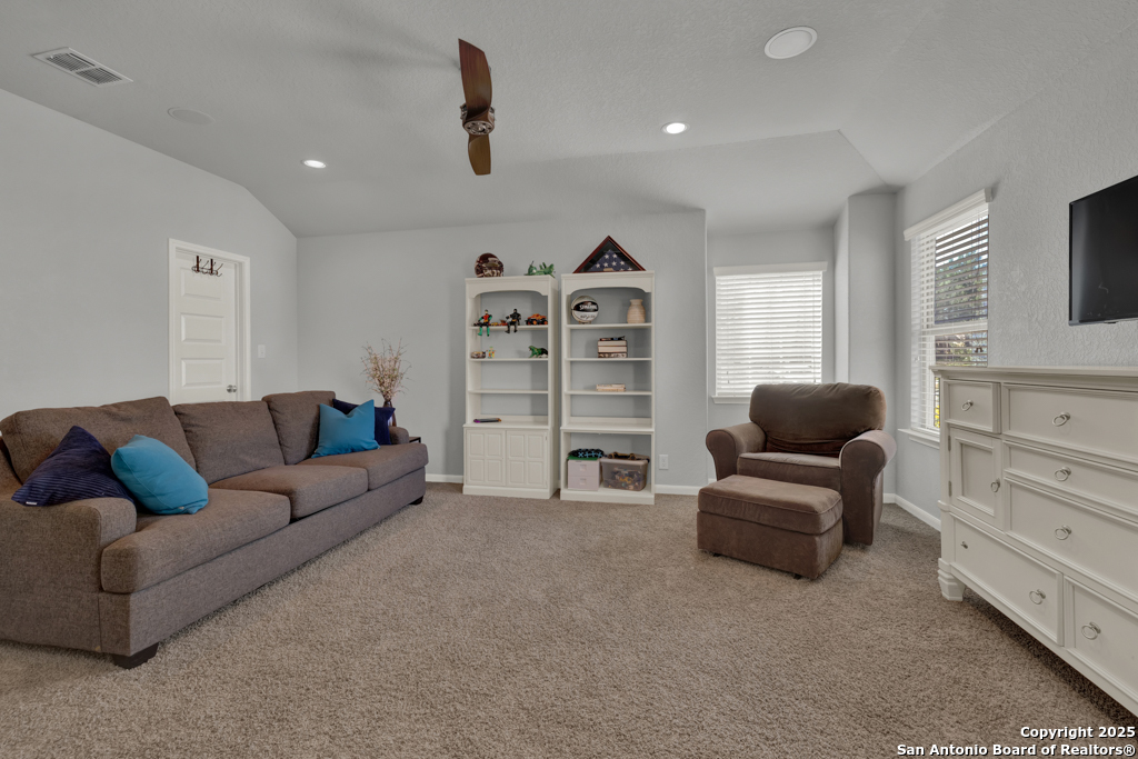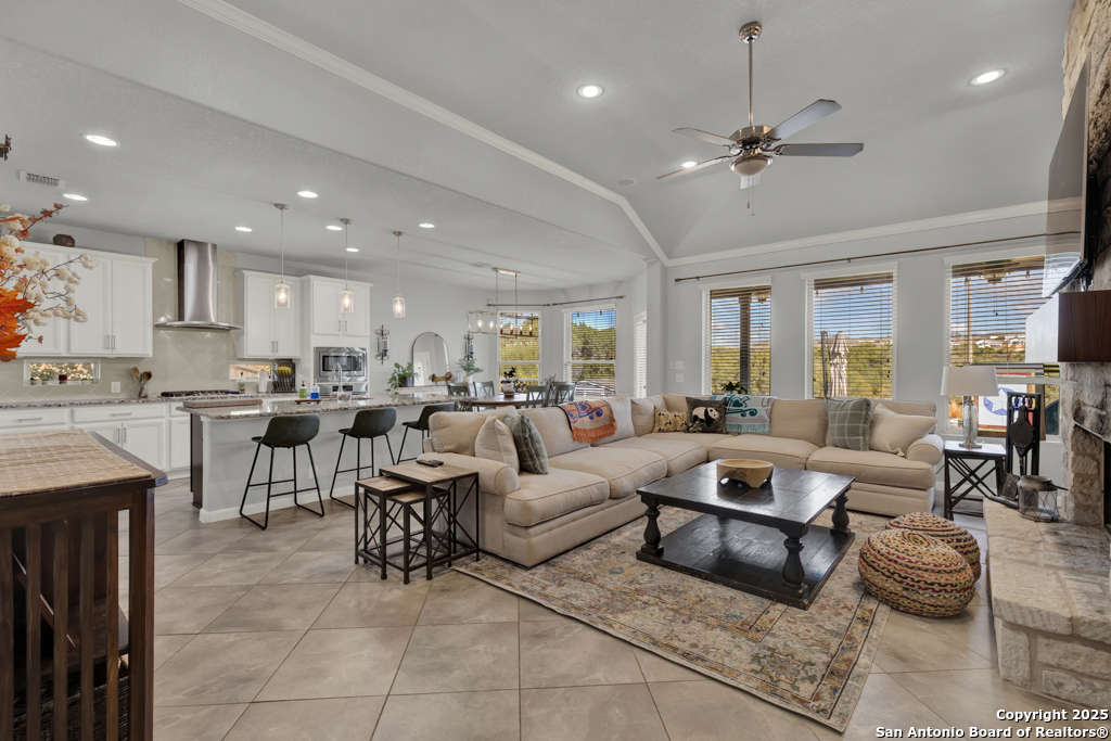 Welcome to the Estates of Stone Crossing. This spacious 1 1/2 story home offers a flexible 2657 Sq. Ft. floor plan that consists of 4 bedrooms, 3 bathrooms, 2 living areas, an open kitchen and dining area. Upon entering the home and exiting the foyer, you have access to 3 secondary bedrooms and their bathroom. One of the bedrooms is currently being used as an office/study. The master suite is spacious and offers an abundance of natural light and an incredible view. The master bathroom has dual sinks, granite tops and an oversized mirror plus a grand walk-in shower. The L-shaped closet provides lots of space for your apparel. The primary living area is accented with a wood burning fireplace. The living area, kitchen and dining are open and are great for relaxing or for entertainment. The kitchen has an island that enhances these features. There is an abundance of cabinets and a nice walk-in pantry. Whether you are relaxing or entertaining, you will appreciate the incredible view from several windows over the back yard and the neighboring wooded canyon. You can also enjoy this view while sitting on the 580 Sq. Ft. deck that is durably built with composite deck material. Our home also offers a second living area which is located on the second floor along with the 3rd full bathroom. This exquisite home sits on a .48-acre fenced lot and is conveniently located to easy access points within New Braunfels.