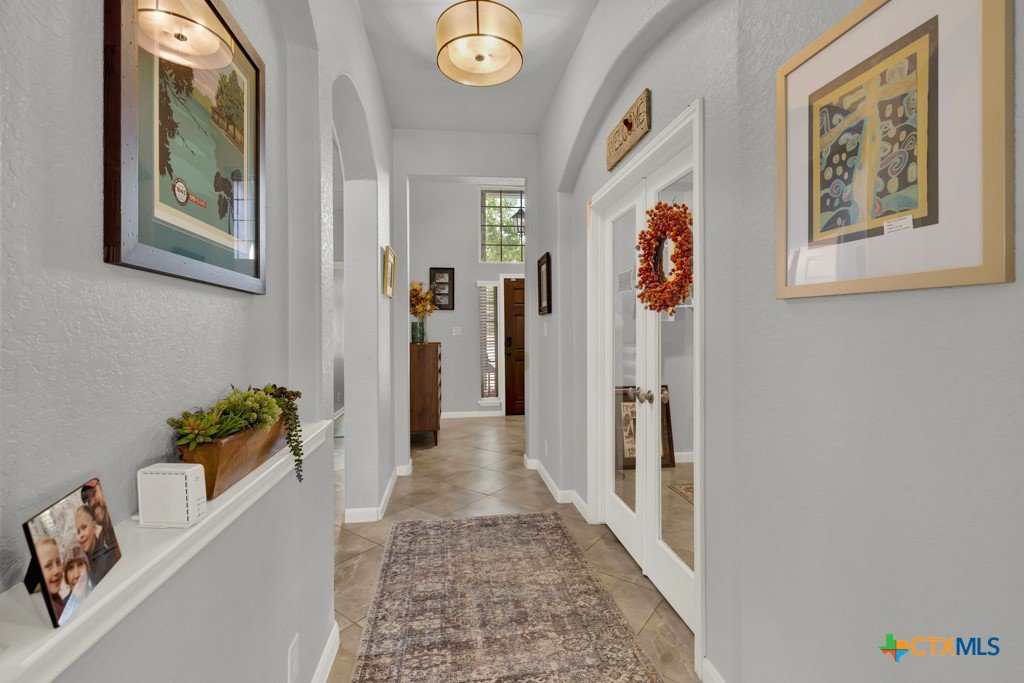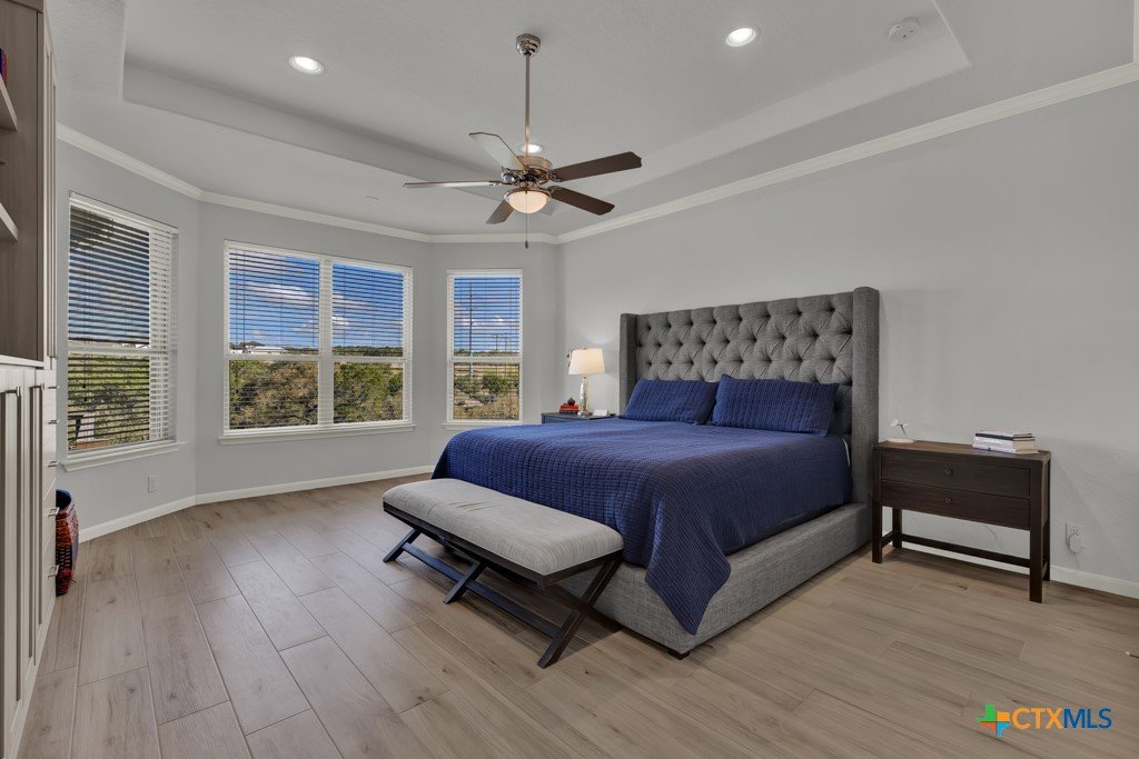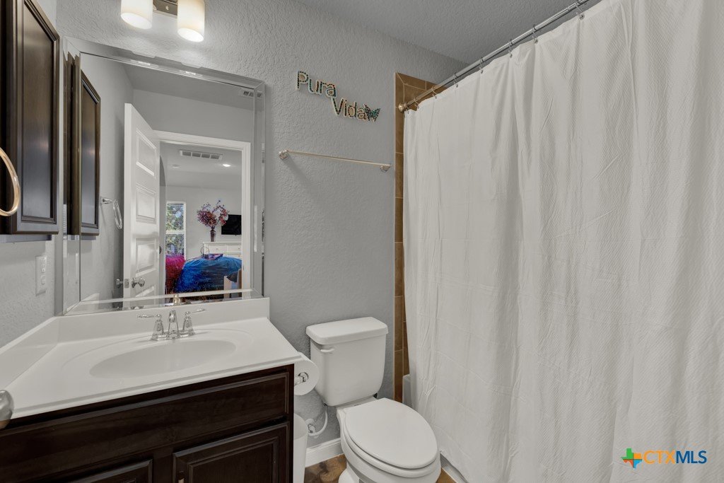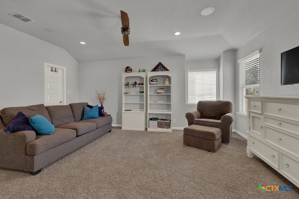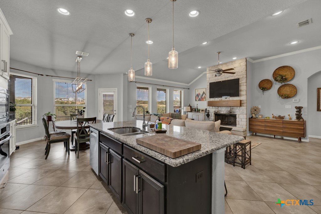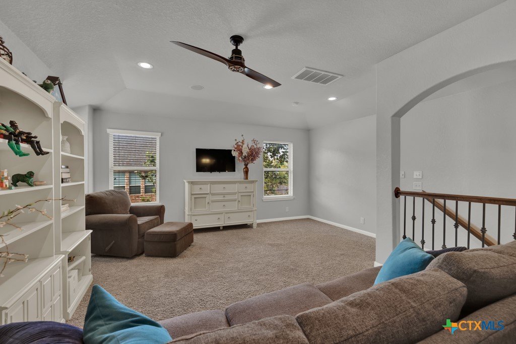 Come See This Beautiful Home in the Estates of Stone Crossing! This spacious and thoughtfully designed 1½-story home offers 2,657 sqft of flexible living space with 4 bedrooms, 3 full bathrooms, and 2 inviting living areas — all set on a generous 0.48-acre fenced lot in a highly sought-after New Braunfels community. From the moment you step inside, you’ll feel right at home. Beyond the welcoming foyer, three secondary bedrooms and a full bath are tucked away for privacy — one of which is currently used as a home office, perfect for remote work or study. The bright and airy primary suite is a peaceful retreat, complete with large windows that flood the space with natural light and frame stunning views of the backyard and wooded canyon beyond. The spa-like master bathroom features dual granite-topped vanities, a grand walk-in shower, and a spacious L-shaped closet built to keep you organized. At the heart of the home, the open-concept living, kitchen, and dining areas are ideal for gatherings or quiet evenings in. The kitchen boasts ample cabinetry, a walk-in pantry, and a functional island that’s perfect for meal prep or casual dining. A cozy wood-burning fireplace adds charm and warmth to the main living area. One of the true highlights of this home is the 580 sqft composite deck — a durable and beautiful space to relax or entertain while soaking in those amazing backyard canyon views. Upstairs, a versatile second living area and full bath offer a great space for guests, a playroom, or media area — whatever suits your needs. Located in the tranquil Estates of Stone Crossing, this home provides easy access to everything New Braunfels has to offer — shopping, dining, schools, and commuter routes.