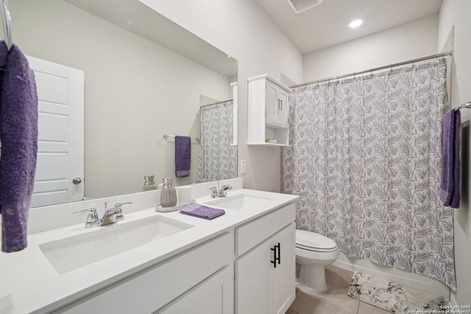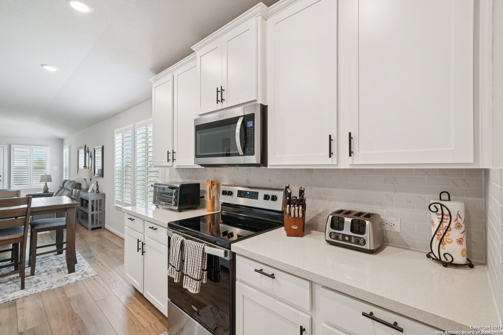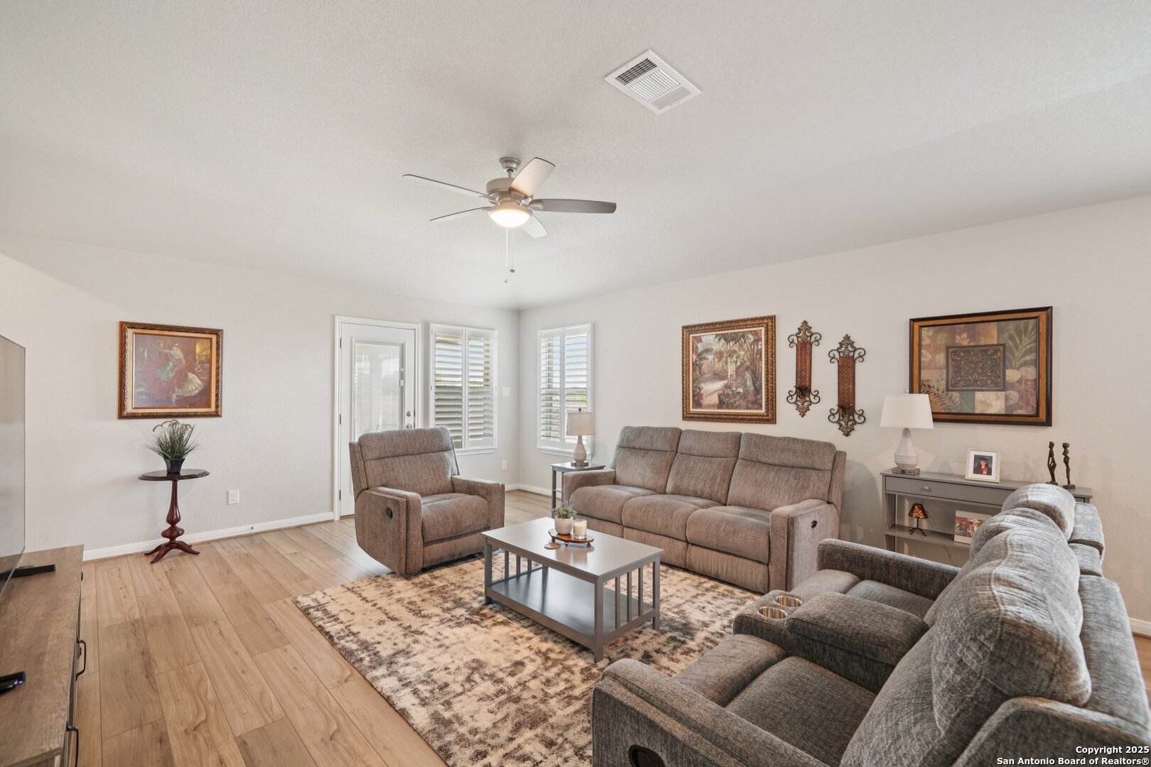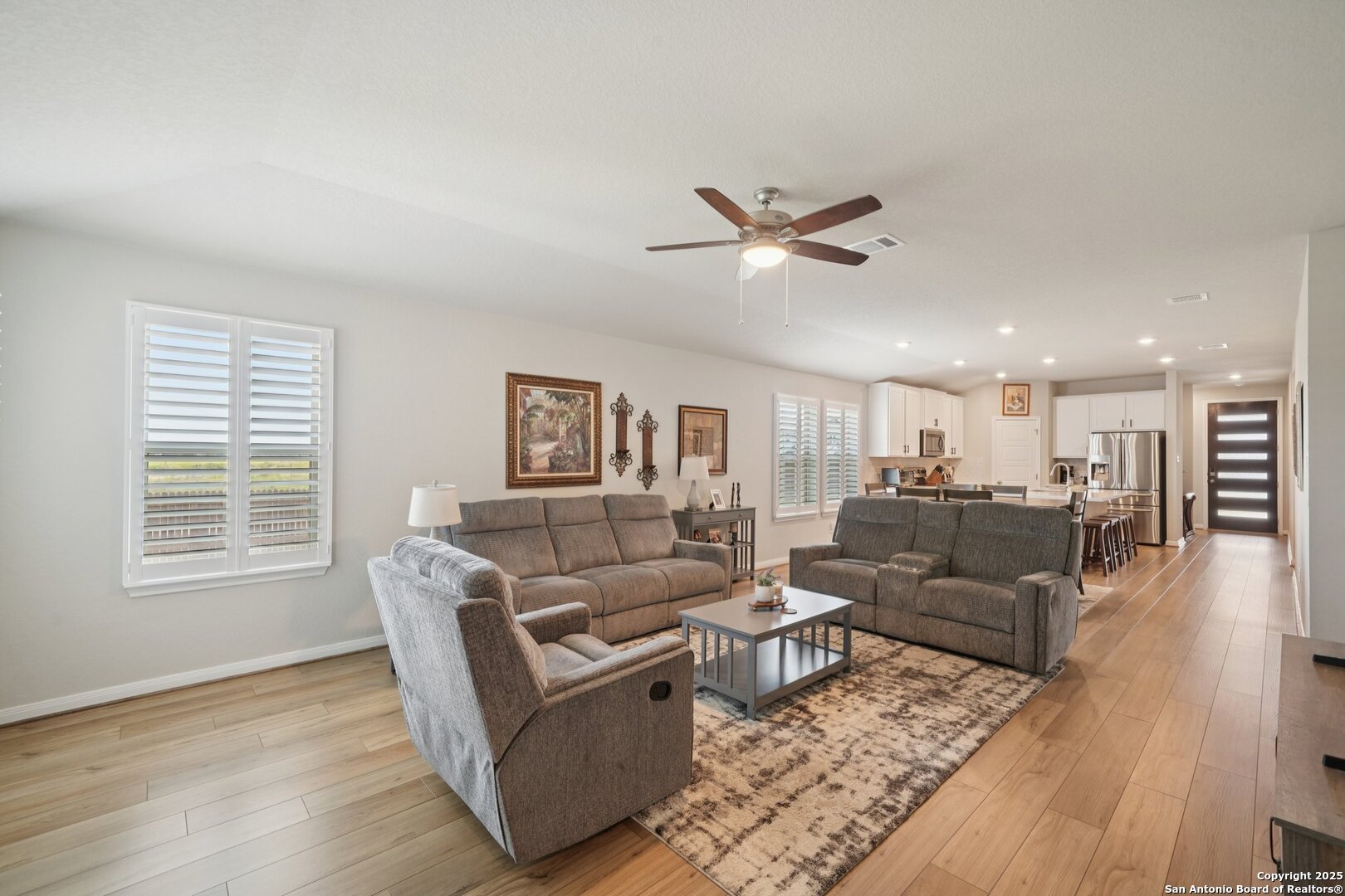 This nearly new home sits on a large corner lot and is ready for immediate move-in! Step inside to beautiful wood-look tile floors leading to a bright, open kitchen featuring a spacious quartz island, stainless steel appliances, abundant cabinet and counter space, and the refrigerator stays! Plantation shutters throughout the home let you adjust natural light and privacy with ease. The inviting living and dining areas flow seamlessly together, creating a comfortable space for everyday living and entertaining. Your private primary suite is a true retreat, complete with bay windows, space for a sitting area, and a luxurious bath, large shower and a large walk-in closet. Three additional bedrooms provide flexibility, one with its own ensuite bath, perfect for guests, and two others connected by a versatile flex space ideal for a game room, playroom, or home office. Outside, enjoy a spacious backyard with plenty of room for a pergola, pool, or custom outdoor oasis. Fresh, bright, and beautifully maintained, this home is move-in ready and waiting for its next chapter!