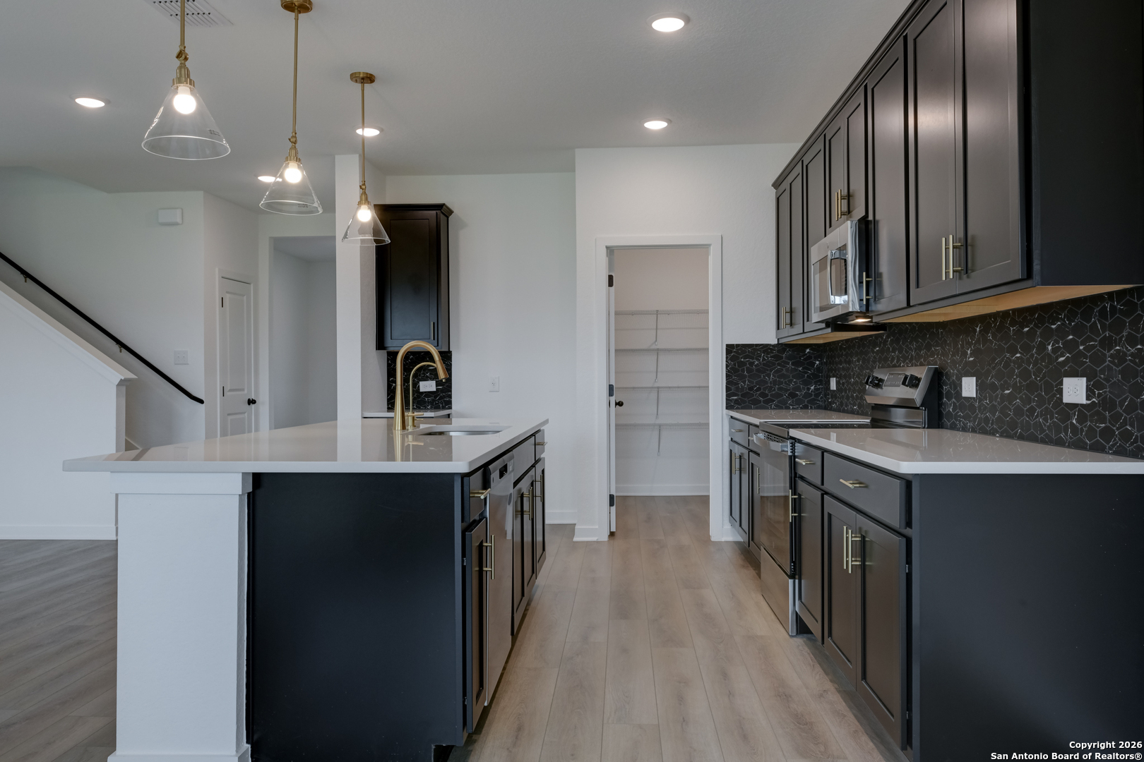 This charming two story home features a gourmet kitchen with quartz countertops, upgraded cabinets, and a pantry. The open family room is bright and spacious with large windows overlooking the backyard with no direct neighbors. A private study adds flexibility for work or hobbies. The secluded primary suite includes a private bath with an oversized shower, garden tub, double vanities, and a walk-in closet. Three secondary bedrooms share two baths. Outside, enjoy a covered patio, full landscaping, and a sprinkler system, perfect for relaxing or entertaining. This home is part of our Noir Collection - designed with high contrasts, deep shadows, and an air of mystery. Charcoal and gold tones mix with textured woods, brass accents, and dramatic lighting to create an atmosphere that's both sophisticated and inviting. Noir is the soundtrack of clinking glasses, soft jazz, and rain on the window-a warm, alluring style that turns every day into an occasion. This home is in Saddlebrook Ranch, a master-planned community in Schertz, offering easy access to I-35, shopping, dining, Randolph AFB, a pool, playground, and top-rated schools.