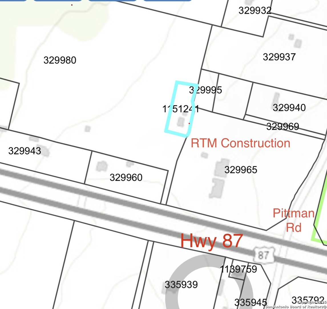 Unrestricted 0.97-acre property located directly off Hwy 87 with excellent visibility and access. Zoned OCL, this tract offers strong commercial or mixed-use potential. Positioned along Hwy 87 and adjacent to RTM Construction, it is well suited for a business location or investment opportunity. With no deed restrictions, permitted uses include commercial operations, an additional residence, barndominium, tiny home, mobile home, truck parking, and more. Improvements include a 1,283 sq ft farmhouse built in the 1930s, in need of remodeling, surrounded by mature trees that provide ample shade. A 900 sq ft metal carport is also included and can be utilized for a shop, storage, or parking multiple vehicles. The property is equipped with an East Central Water Co. water meter, CPS electric meter, and an existing septic tank. Conveniently located approximately one mile from the Hwy 87 / Loop 1604 intersection, this property offers outstanding accessibility and multiple development possibilities. A 20-ft-wide deeded easement is included.