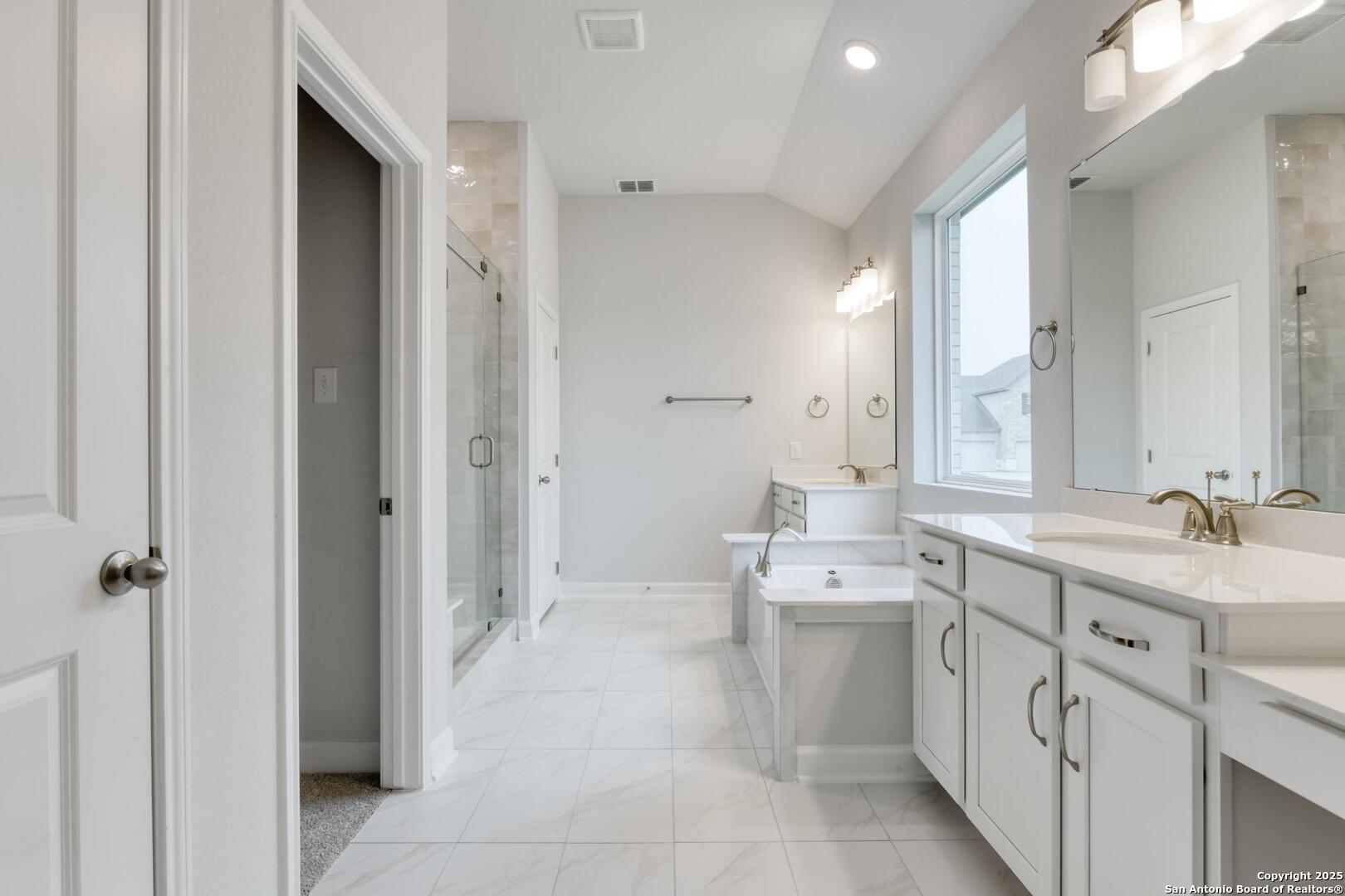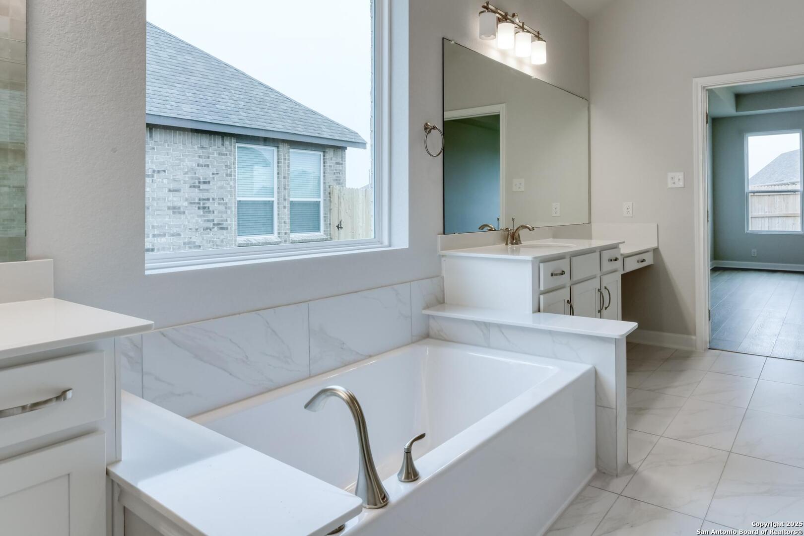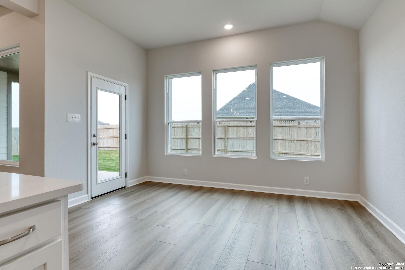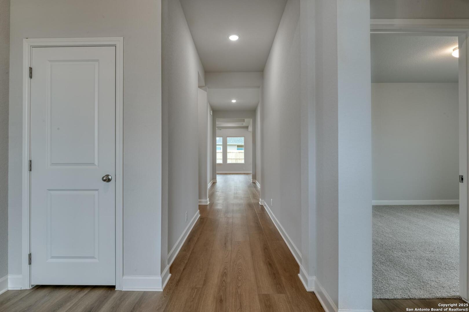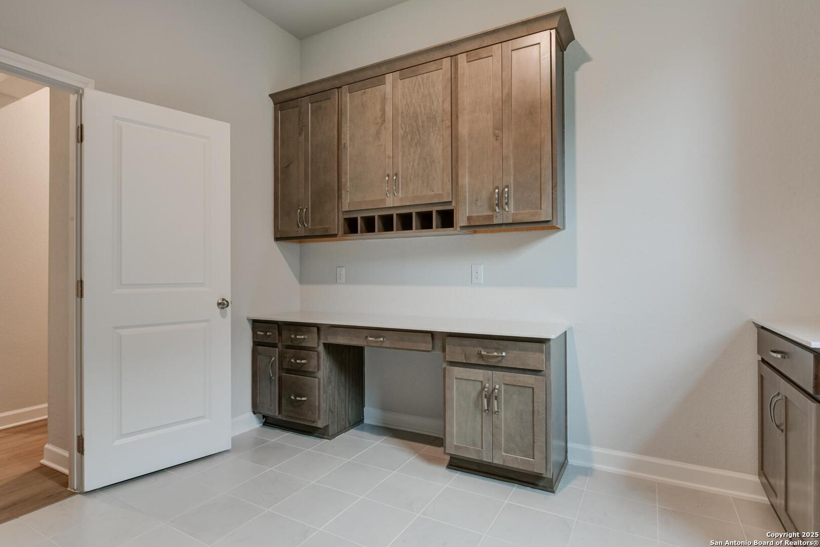 This beautifully designed one-story home combines comfort, style, and functionality in every detail. The open layout centers around a spacious family room with a coffered ceiling that flows into the modern kitchen and dining area. The kitchen features a large island, built-in appliances, and a walk-in pantry, while a separate dining room offers a welcoming space for gatherings. The large primary suite includes a luxurious bathroom with dual vanities, a garden tub, a separate shower, and a generous walk-in closet. Two secondary bedrooms share a full bath, and a convenient powder bath is perfect for guests. A super utility room provides abundant storage, and a covered patio overlooks the landscaped yard with a full sprinkler system. With thoughtful details like in-wall pest control and elegant finishes throughout, this home blends practicality with modern charm. This home features design selections thoughtfully curated by our professional studio team. Each finish, from flooring and cabinetry to countertops and special touches, is chosen with care to create a cohesive and beautifully balanced look. Guided by timeless design principles and inspired by modern lifestyles, the result is a home that is both stylish and welcoming from the moment you step inside. This home is located in Saddlebrook Ranch, a master-planned community in the charming city of Schertz-named one of CNN/Money's top small towns. Enjoy easy access to I-35, premier shopping, dining, and Randolph Air Force Base. Planned amenities include a sparkling pool and playground, perfect for family fun. With the highly regarded Schertz-Cibolo-Universal City School District nearby, Saddlebrook Ranch offers the ideal blend of community, convenience, and small-town charm.