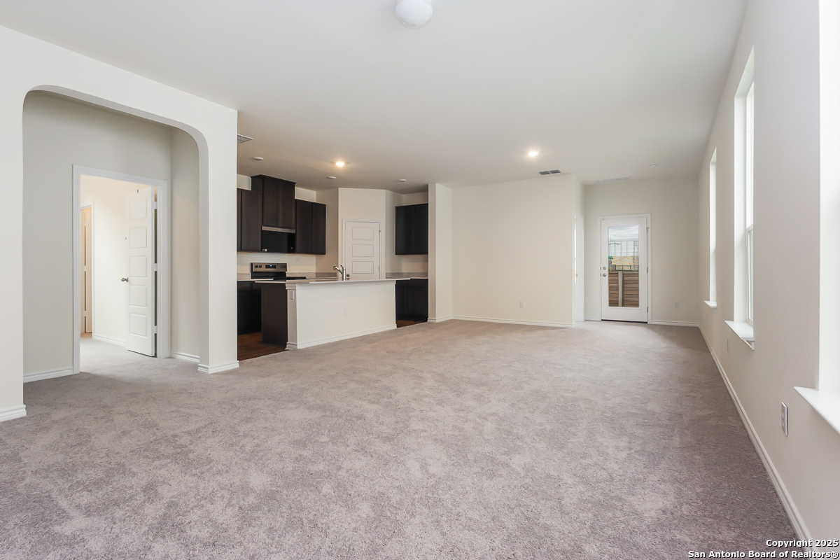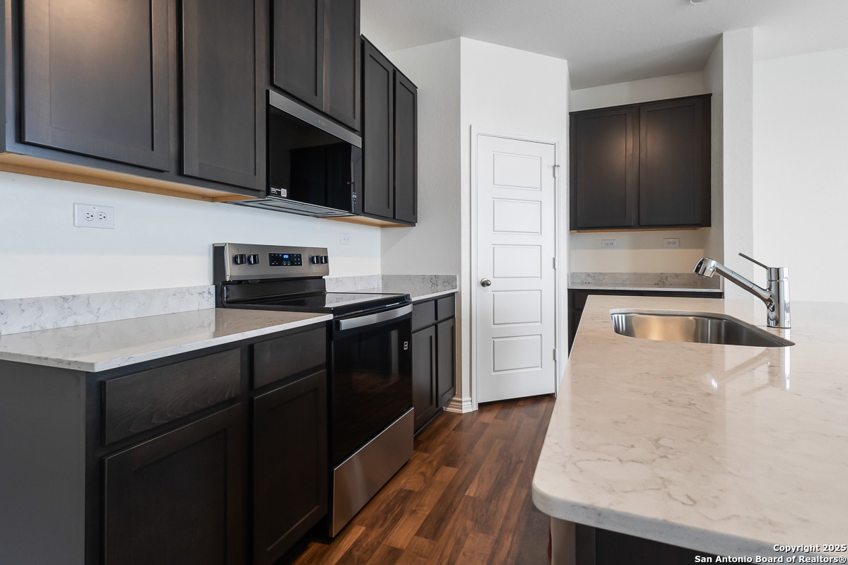Step into style and comfort with this thoughtfully designed home featuring soaring 9-ft. first-floor ceilings. The kitchen shines with Whirlpool stainless steel appliances, Woodmont Dakota Shaker 42-in. cabinets, Silestone Helix countertops, and an extended breakfast bar. Relax in the primary bath offering upgraded cabinets, an extended vanity with knee space, and a 42-in. garden tub/shower with Daltile tile surround. Decorative touches include a striking Texas Star entry door, Kwikset Polo knobs, and vinyl plank flooring in key areas. Enjoy a soft water loop, covered patio, sprinkler system, and a fully sodded yard.