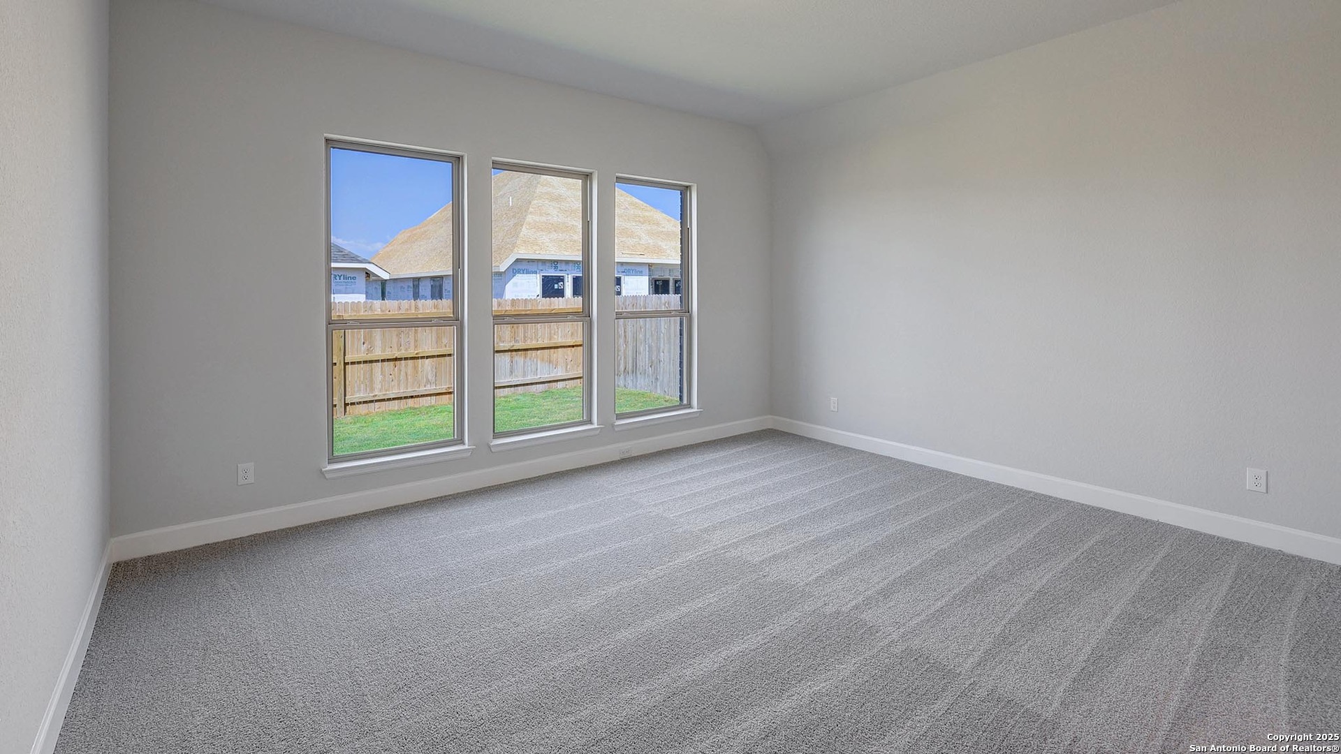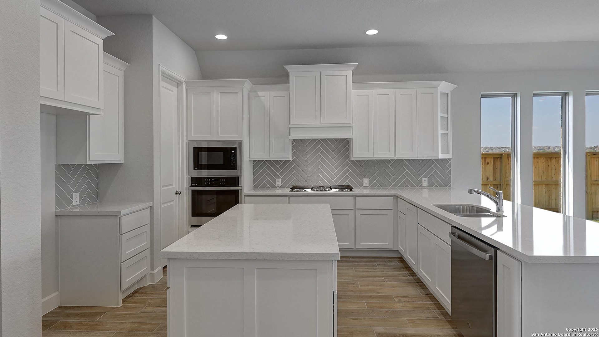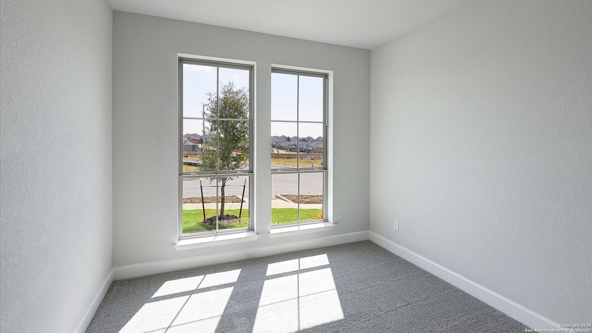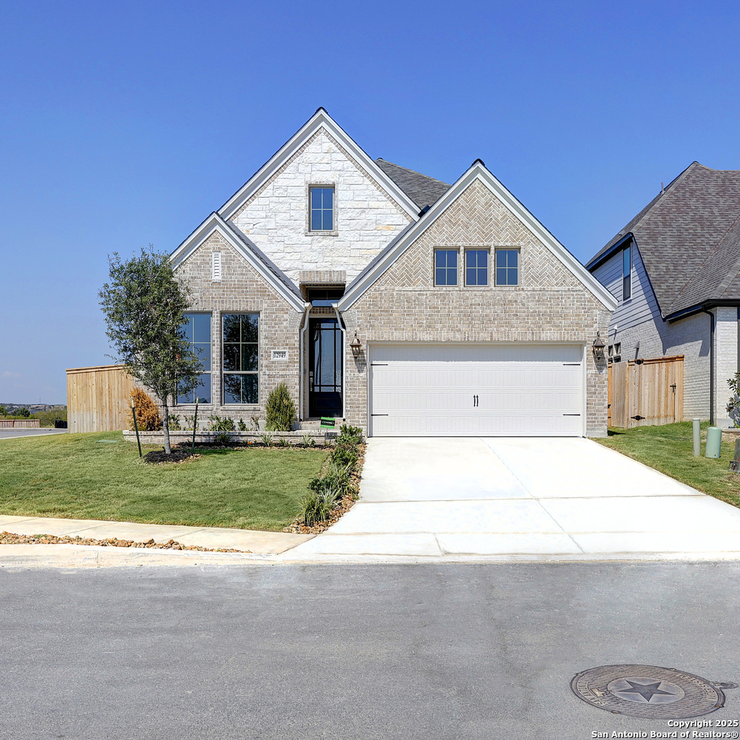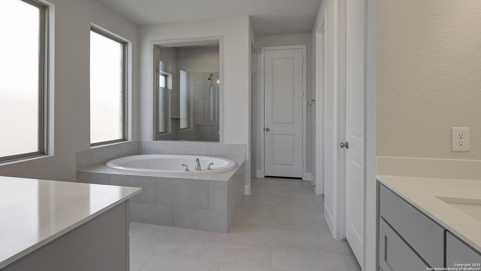 Extended entry with 12-foot ceiling leads to open kitchen, dining area and family room with 10-foot ceilings throughout. Kitchen features center island with built-in seating and 5-burner gas cooktop. Family room features wall of windows. Primary suite with 10-foot ceiling and wall of windows. Dual vanities, garden tub, separate glass-enclosed shower and large walk-in closet in primary bath. A guest suite with private bath adds to this four-bedroom home. Covered backyard patio. Mud room off two-car garage.
