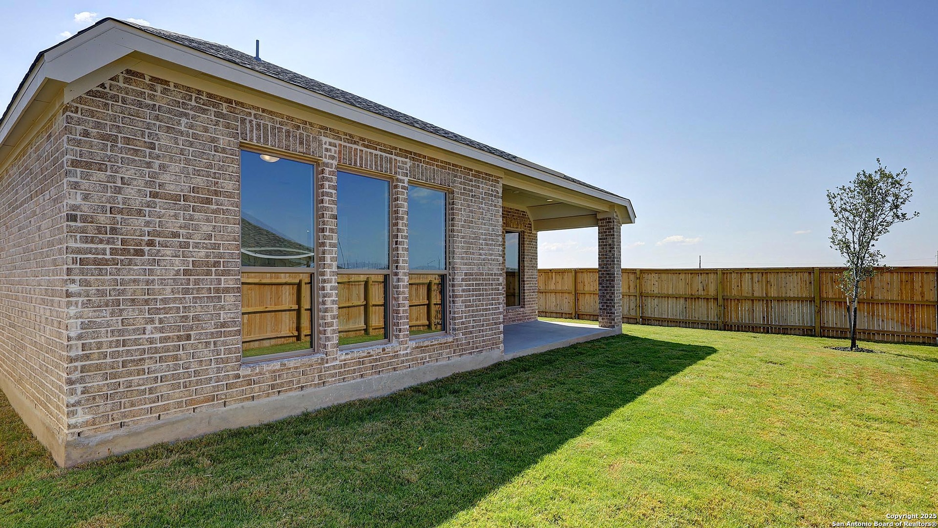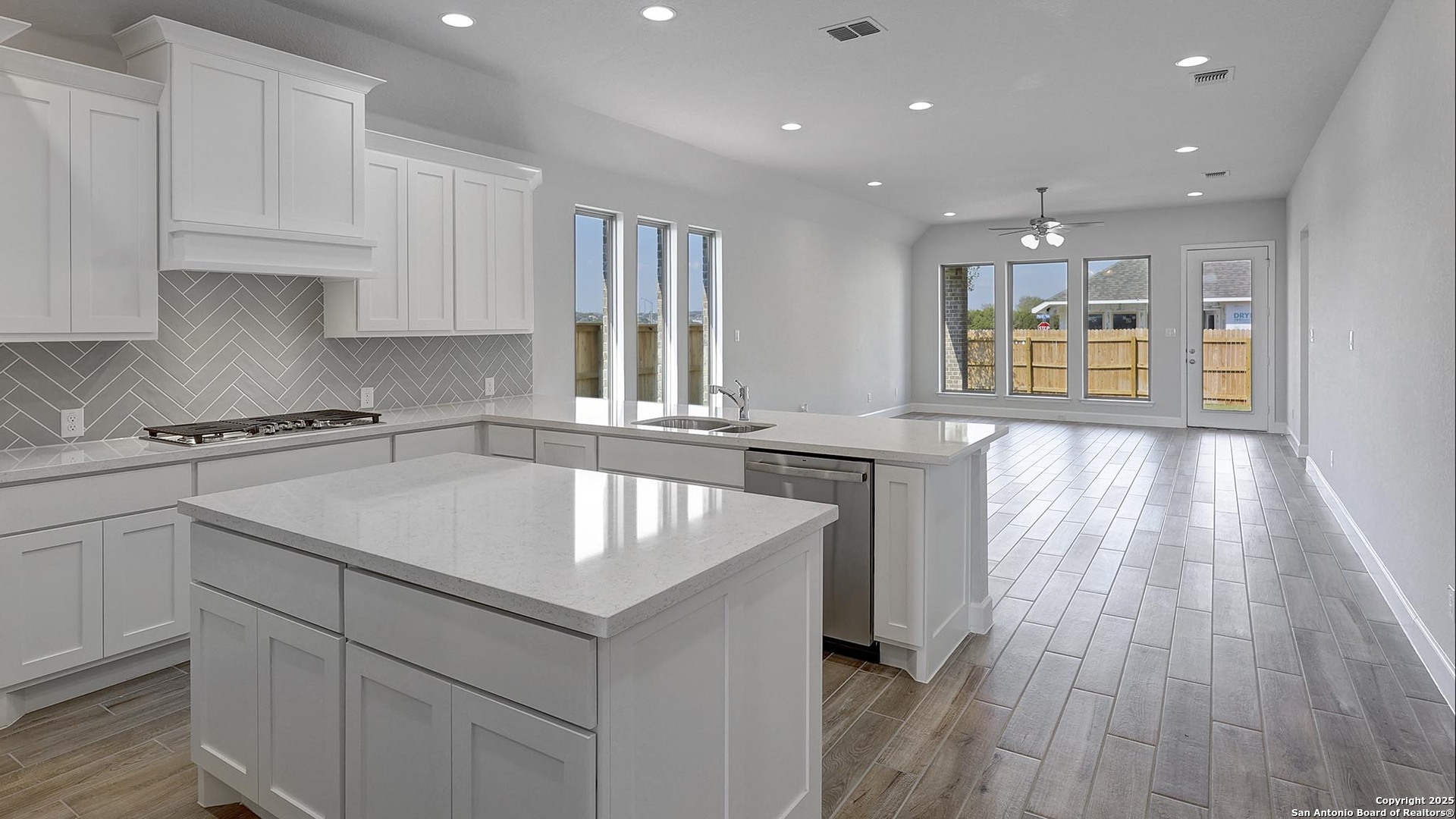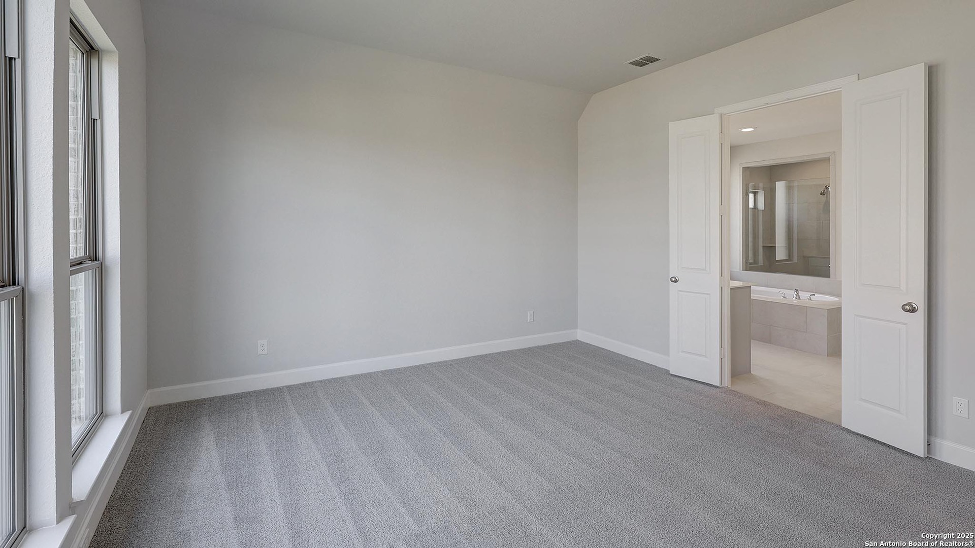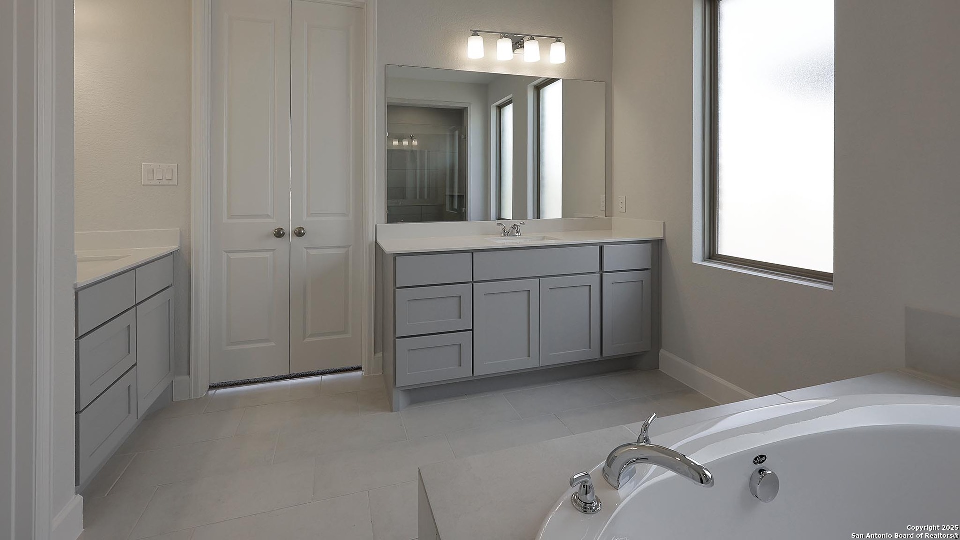 Extended entry with 12-foot ceiling leads to open kitchen, dining area and family room with 10-foot ceilings throughout. Kitchen features center island with built-in seating and 5-burner gas cooktop. Family room features wall of windows. Primary suite with 10-foot ceiling and wall of windows. Dual vanities, garden tub, separate glass-enclosed shower and large walk-in closet in primary bath. A guest suite with private bath adds to this four-bedroom home. Covered backyard patio. Mud room off two-car garage.