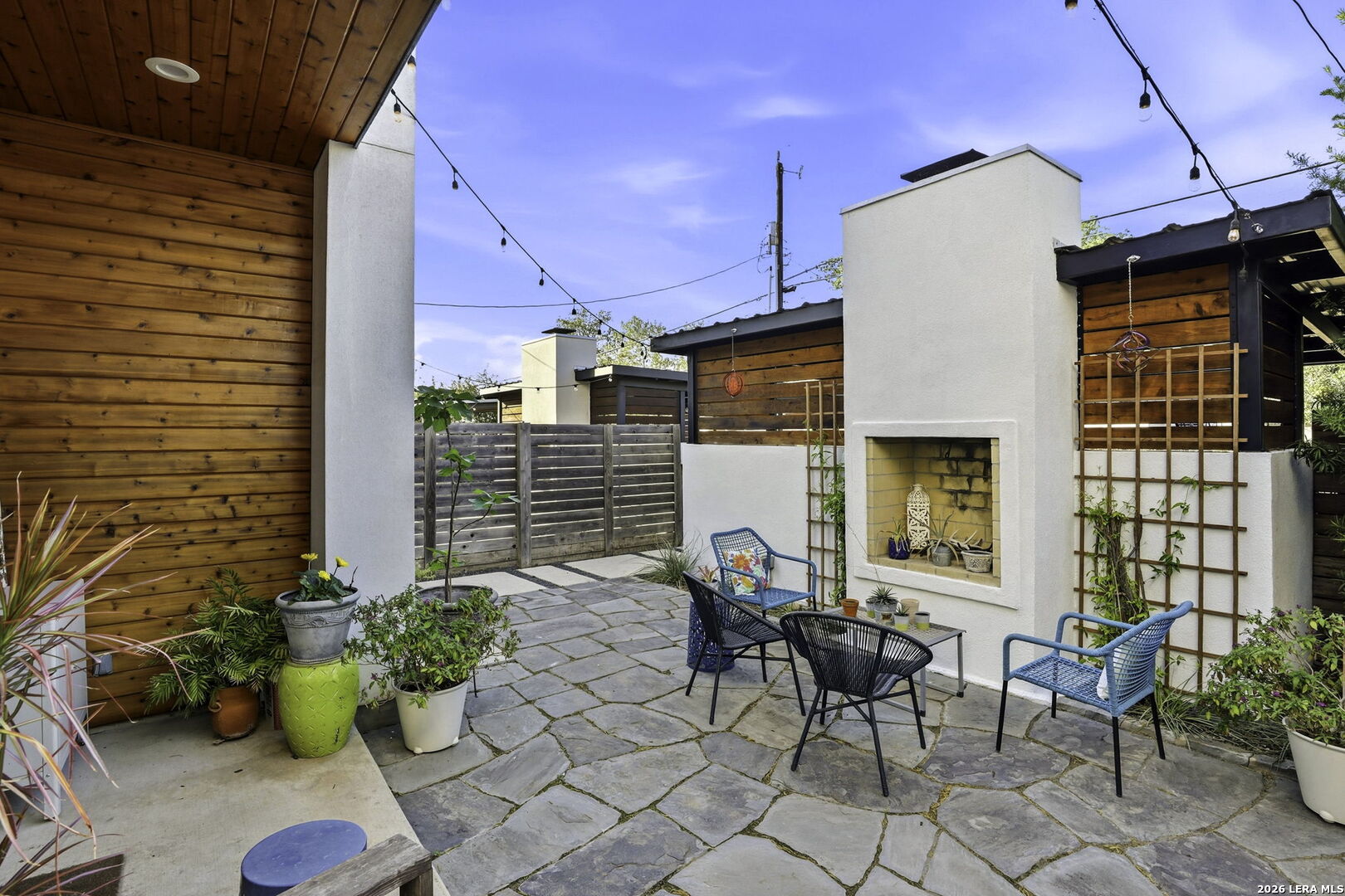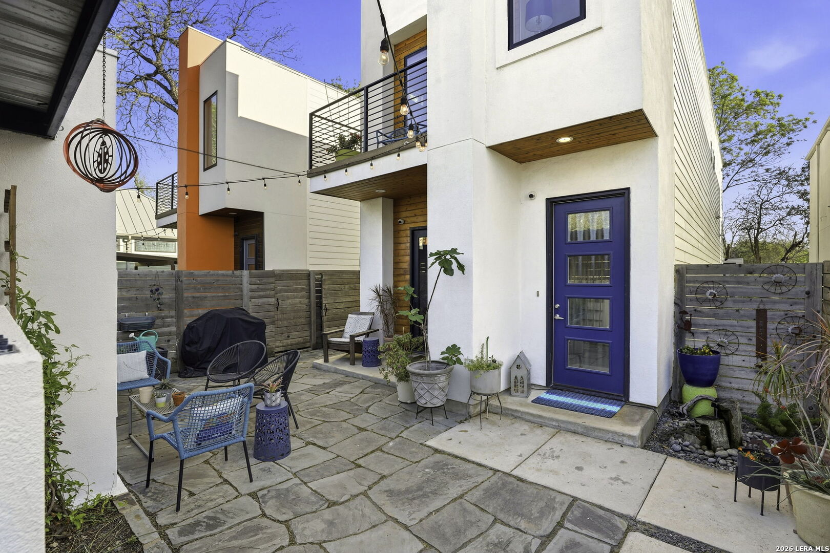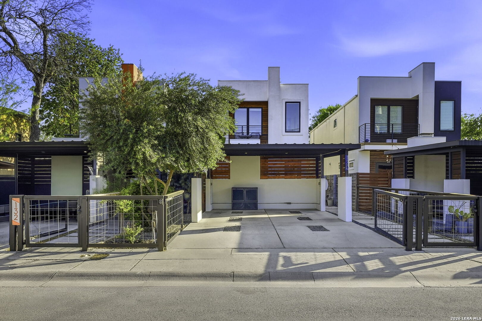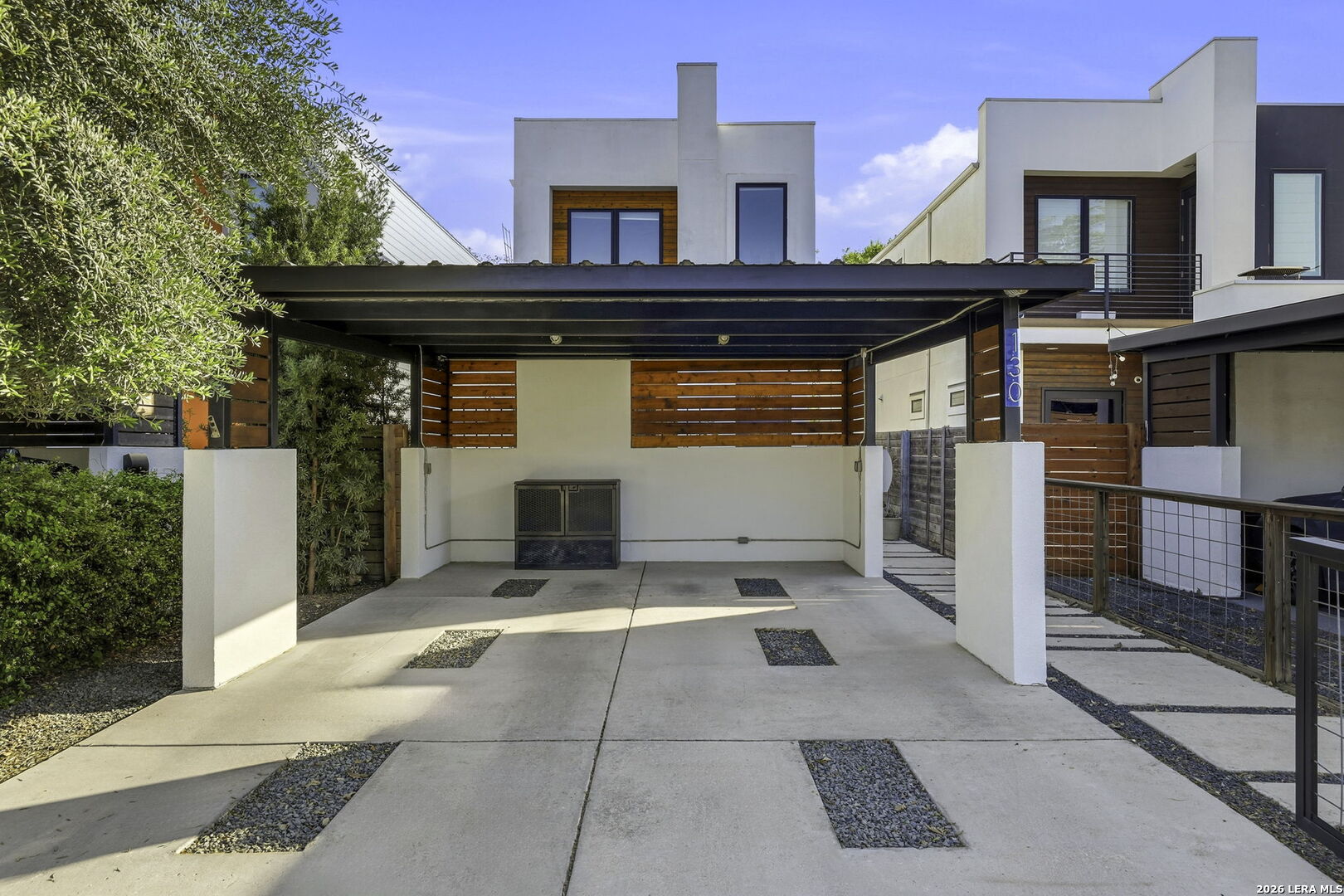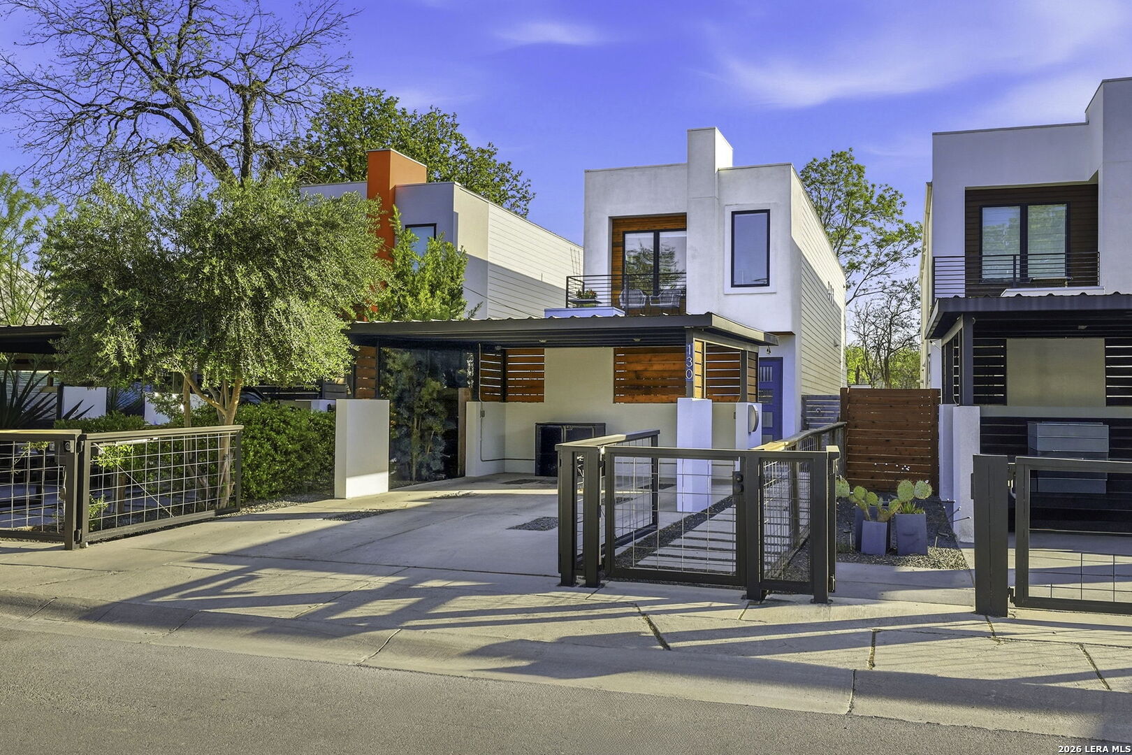 Modern Urban Oasis in the Heart of Lone Star, San Antonio Welcome to your dream home in the vibrant and growing Lone Star District of San Antonio. This stunning modern residence offers the perfect blend of urban living and serene comfort, just an 8-minute walk to the picturesque San Antonio River and the lively Blue Star Arts District. Enjoy being within walking distance to a variety of restaurants, with the historic San Pedro Springs Park just a 12-minute stroll away. Step inside this exquisite 3-bedroom, 3 full-bath home and experience its contemporary design and thoughtful layout. The exterior showcases a stylish combination of stucco and wood, complemented by a durable metal roof and a covered two-car carport with an automatic gate for added security. At the entrance, you'll find a charming courtyard patio complete with a fireplace-perfect for relaxing evenings-along with access to a versatile side yard and a functional backyard with a storage shed. Inside, high ceilings and abundant natural light highlight the open-concept living space. The seamless flow between the living room, kitchen, and dining area is enhanced by European-style maple cabinetry and modern recessed lighting. The gourmet kitchen features a built-in microwave, gas range with oven, and sleek metal countertops-ideal for both everyday living and entertaining. The main level includes a convenient guest bedroom that overlooks the backyard and has a stunning full bathroom. Upstairs, a striking floating staircase leads to the second floor, where engineered hardwood flooring continues throughout. The primary suite is a true retreat, offering large windows, a private patio for morning coffee, and a spa-like bathroom with a separate shower and a soaking tub. The spacious primary closet features California-style organization. An additional upstairs bedroom includes its own private bathroom, and the laundry room is conveniently located on the second floor for easy access. Experience the best of urban living in this exceptional home. Don't miss your opportunity to own a property that seamlessly combines modern design, comfort, and unbeatable location. Schedule your tour today!
