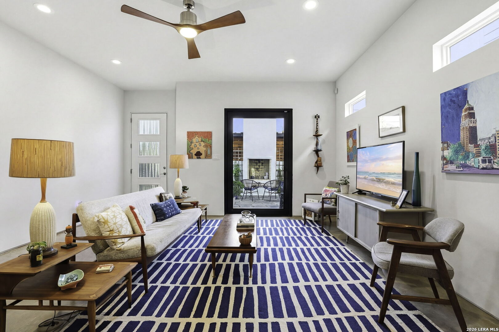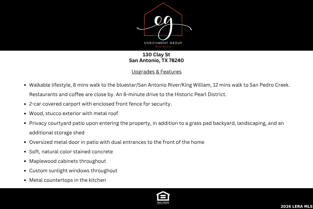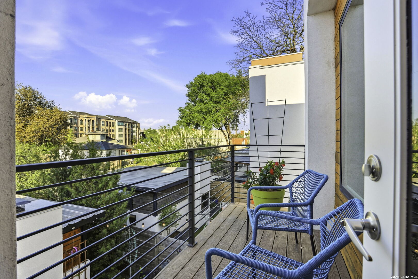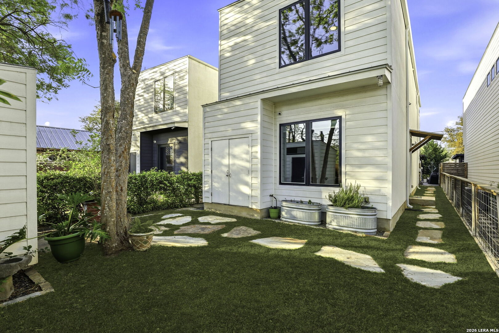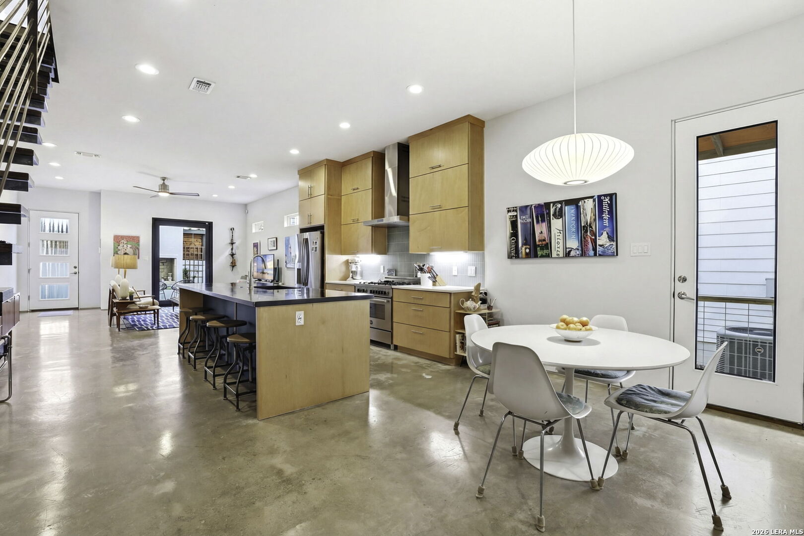 Modern Urban Oasis in the Heart of Lone Star, San Antonio Welcome to your dream home in the vibrant and growing Lone Star District of San Antonio. This stunning modern residence offers the perfect blend of urban living and serene comfort, just an 8-minute walk to the picturesque San Antonio River and the lively Blue Star Arts District. Enjoy being within walking distance to a variety of restaurants, with the historic San Pedro Springs Park just a 12-minute stroll away. Step inside this exquisite 3-bedroom, 3 full-bath home and experience its contemporary design and thoughtful layout. The exterior showcases a stylish combination of stucco and wood, complemented by a durable metal roof and a covered two-car carport with an automatic gate for added security. At the entrance, you'll find a charming courtyard patio complete with a fireplace-perfect for relaxing evenings-along with access to a versatile side yard and a functional backyard with a storage shed. Inside, high ceilings and abundant natural light highlight the open-concept living space. The seamless flow between the living room, kitchen, and dining area is enhanced by European-style maple cabinetry and modern recessed lighting. The gourmet kitchen features a built-in microwave, gas range with oven, and sleek metal countertops-ideal for both everyday living and entertaining. The main level includes a convenient guest bedroom that overlooks the backyard and has a stunning full bathroom. Upstairs, a striking floating staircase leads to the second floor, where engineered hardwood flooring continues throughout. The primary suite is a true retreat, offering large windows, a private patio for morning coffee, and a spa-like bathroom with a separate shower and a soaking tub. The spacious primary closet features California-style organization. An additional upstairs bedroom includes its own private bathroom, and the laundry room is conveniently located on the second floor for easy access. Experience the best of urban living in this exceptional home. Don't miss your opportunity to own a property that seamlessly combines modern design, comfort, and unbeatable location. Schedule your tour today!