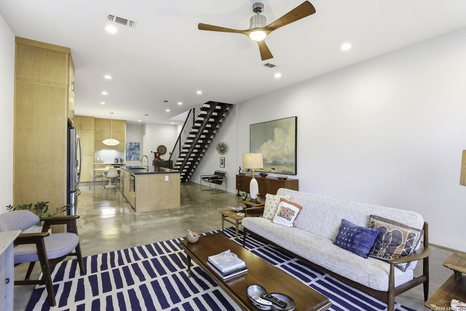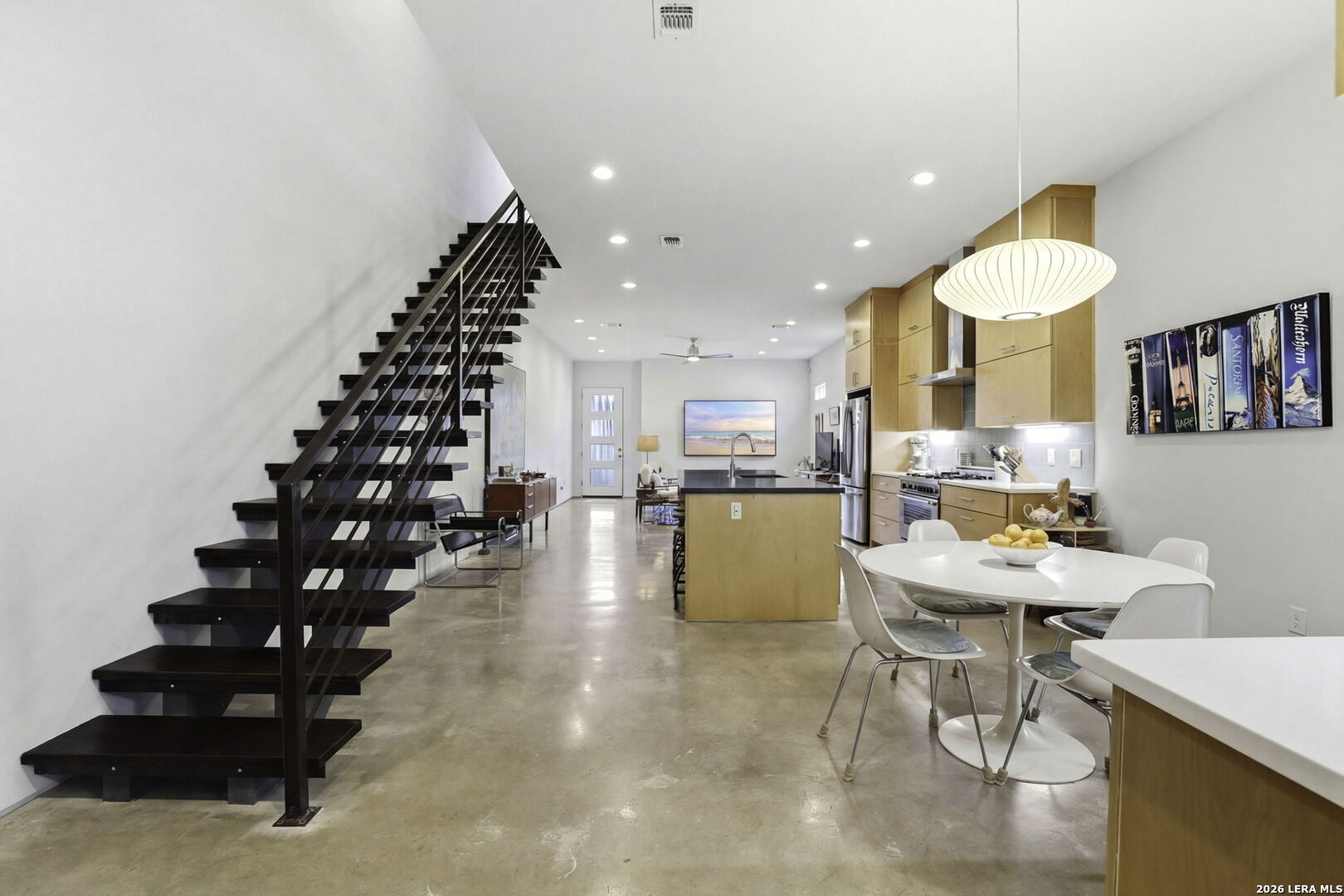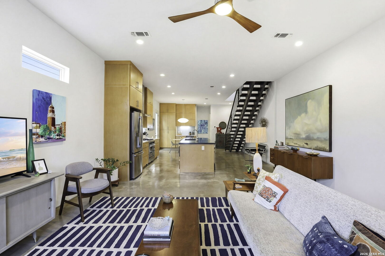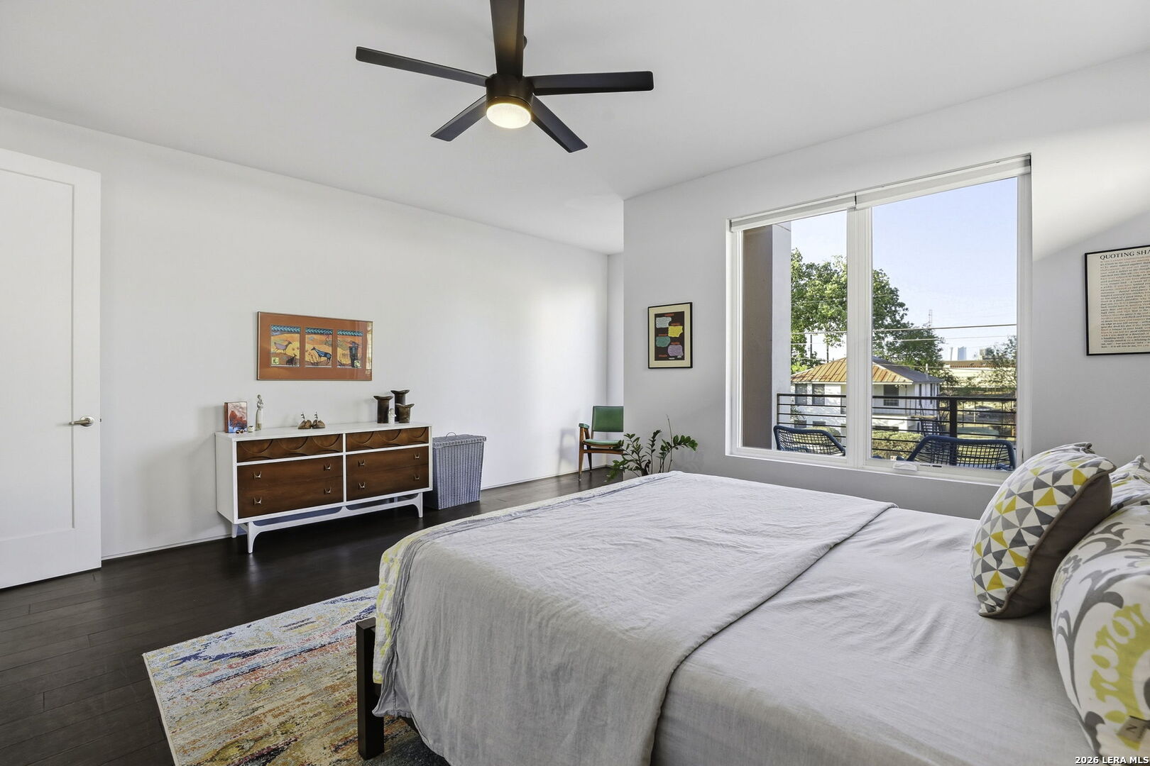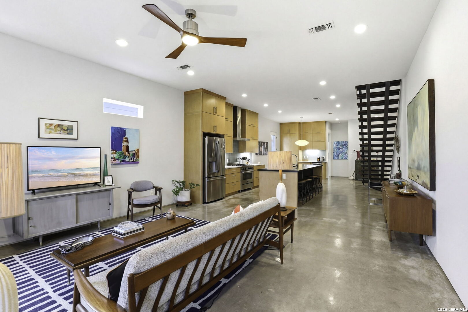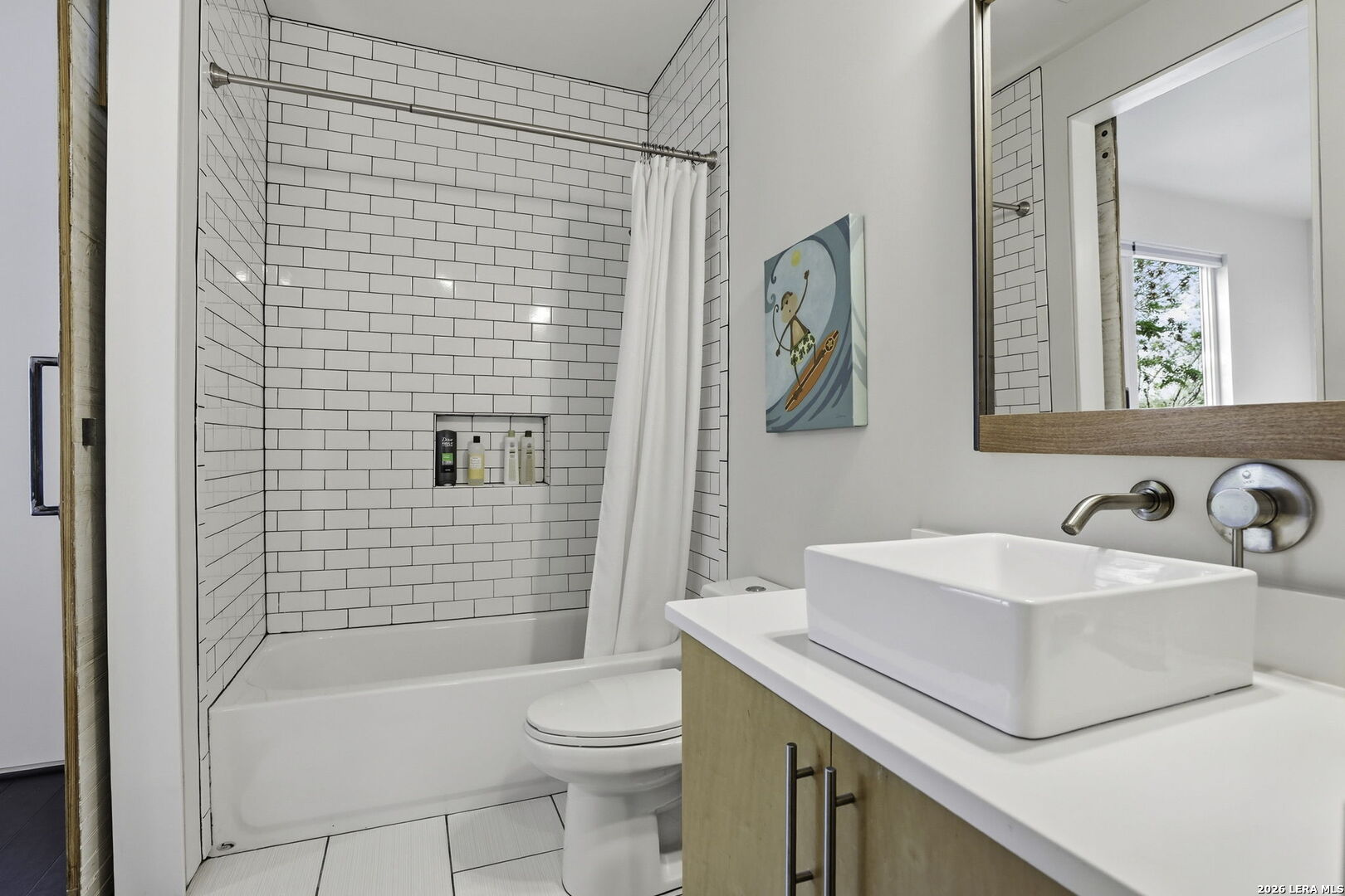 Modern Urban Oasis in the Heart of Lone Star, San Antonio Welcome to your dream home in the vibrant and growing Lone Star District of San Antonio. This stunning modern residence offers the perfect blend of urban living and serene comfort, just an 8-minute walk to the picturesque San Antonio River and the lively Blue Star Arts District. Enjoy being within walking distance to a variety of restaurants, with the historic San Pedro Springs Park just a 12-minute stroll away. Step inside this exquisite 3-bedroom, 3 full-bath home and experience its contemporary design and thoughtful layout. The exterior showcases a stylish combination of stucco and wood, complemented by a durable metal roof and a covered two-car carport with an automatic gate for added security. At the entrance, you'll find a charming courtyard patio complete with a fireplace-perfect for relaxing evenings-along with access to a versatile side yard and a functional backyard with a storage shed. Inside, high ceilings and abundant natural light highlight the open-concept living space. The seamless flow between the living room, kitchen, and dining area is enhanced by European-style maple cabinetry and modern recessed lighting. The gourmet kitchen features a built-in microwave, gas range with oven, and sleek metal countertops-ideal for both everyday living and entertaining. The main level includes a convenient guest bedroom that overlooks the backyard and has a stunning full bathroom. Upstairs, a striking floating staircase leads to the second floor, where engineered hardwood flooring continues throughout. The primary suite is a true retreat, offering large windows, a private patio for morning coffee, and a spa-like bathroom with a separate shower and a soaking tub. The spacious primary closet features California-style organization. An additional upstairs bedroom includes its own private bathroom, and the laundry room is conveniently located on the second floor for easy access. Experience the best of urban living in this exceptional home. Don't miss your opportunity to own a property that seamlessly combines modern design, comfort, and unbeatable location. Schedule your tour today!
