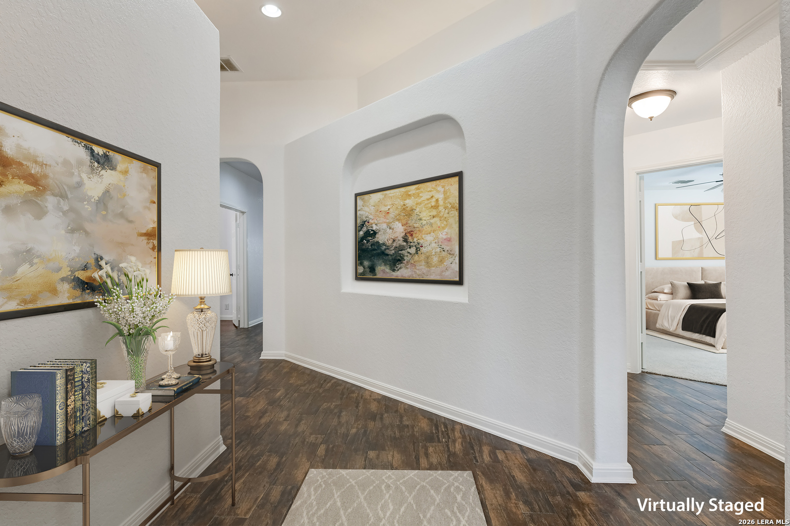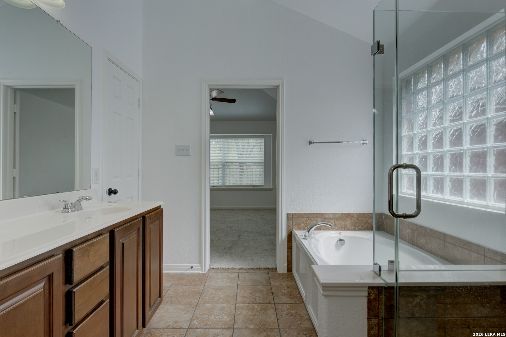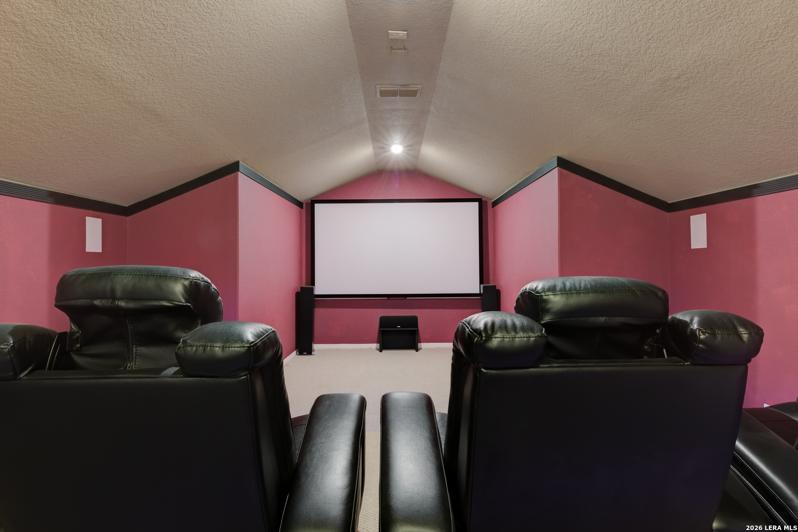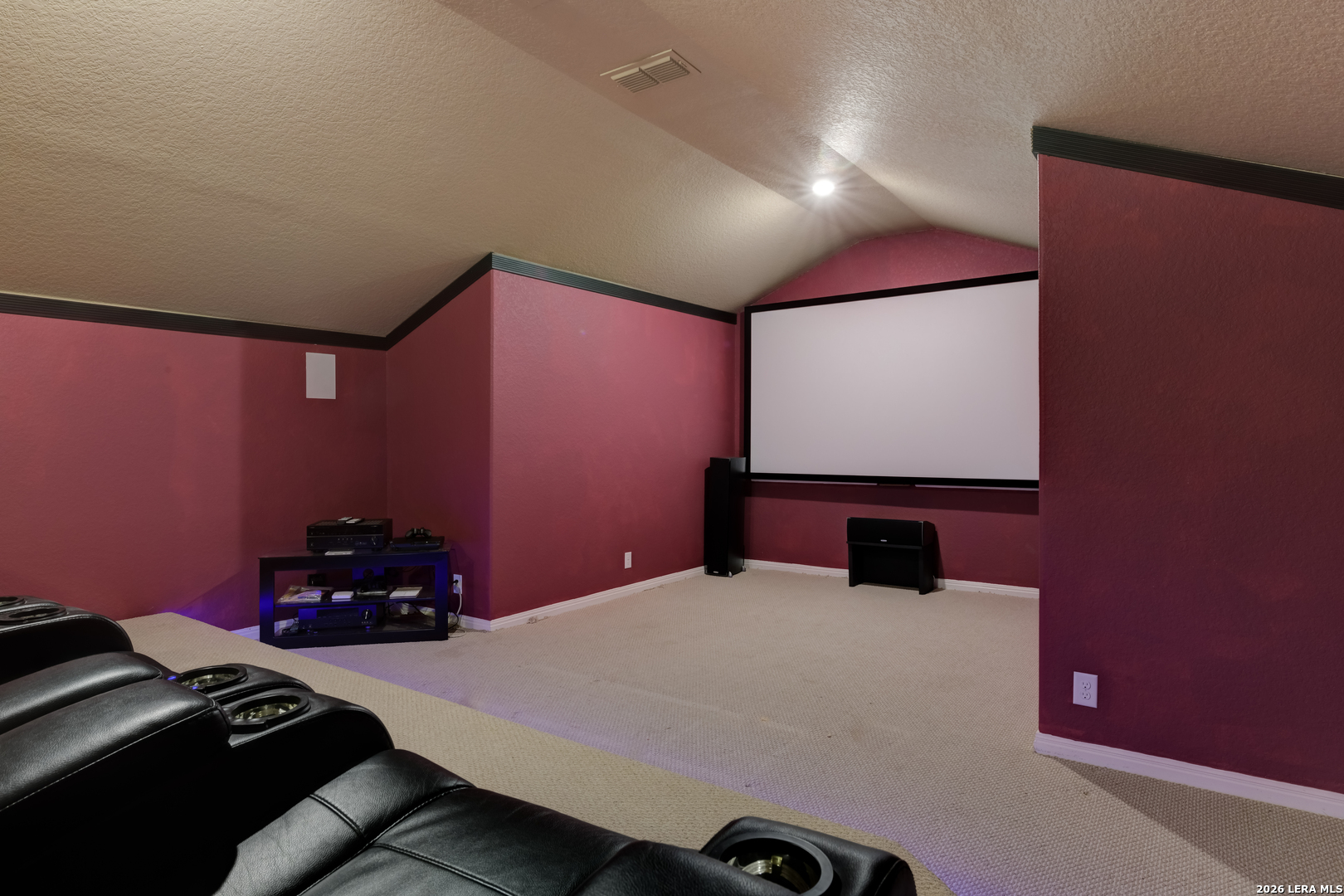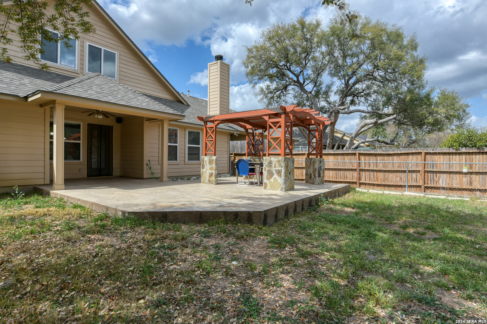 This move-in ready gem has everything you need - and then some. Four bedrooms, a dedicated office, and a formal dining room with a custom china cabinet inset, all on the first floor. The kitchen shines with a full compliment of high quality stainless steel appliances and cabinets, including double ovens, and expansive granite counters. Upstairs, the media room is a true showstopper with a $10K media system and four motorized reclining chairs on a raised platform - just plug and play and sit down and enjoy. Step outside to a custom patio with custom shade structure backing up to a peaceful greenbelt with walking trail. Privacy, nature, and convenience all at once. New Roof and fresh interior paint. Washer and dryer included. Minutes from Loop 1604 and Bandera Rd. Come see it today. You'll want to stay!