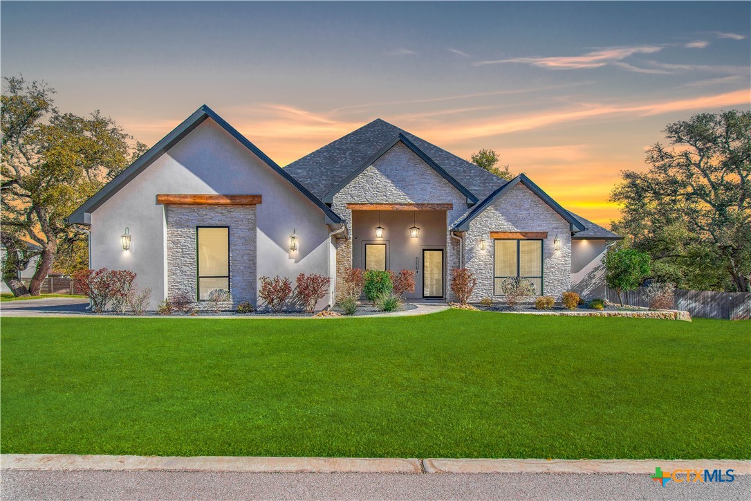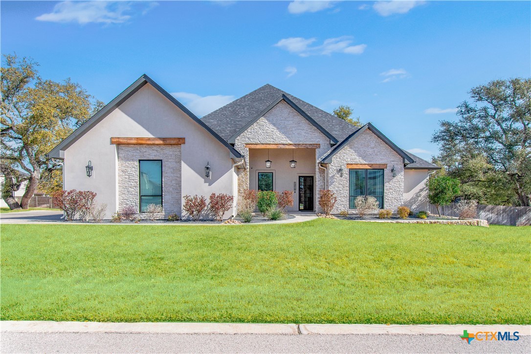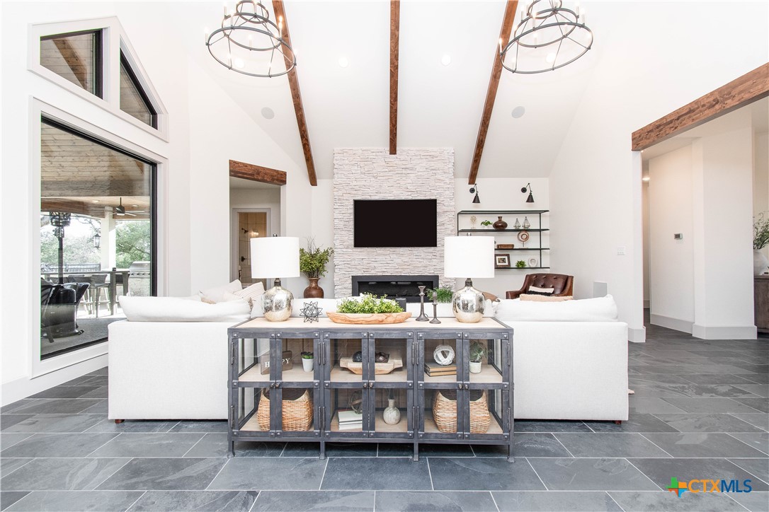 Welcome to your new slice of paradise! This home features a grand front entryway with a glass front door. You'll find an office space complete with a ceiling fan and built-in shelving. The living room boasts built-in shelves, a gas fireplace that reaches the ceiling with stunning stonework, cathedral beamed ceilings, and large windows that flood the space with natural light. There’s an abundance of storage throughout, including walk-in closets, Jack and Jill bathrooms, granite countertops, luxurious tile flooring, large windows, and soft carpet in the spare bedrooms. In the dining area, enjoy a spacious eating space along with built-in shelving and access to the back patio. The eat-in kitchen is a chef's dream, featuring marble countertops, numerous custom cabinets, and ample countertop space. The laundry room is designed for convenience, equipped with storage, a countertop, cabinet space, a fridge, and a sink, along with direct access to the master bedroom closet. The mudroom is furnished with practical built-ins, and there's a walk-in pantry offering additional cabinet and countertop space. The master bedroom provides access to the back patio and has plenty of room for a cozy sitting area, adorned with beamed and tray ceilings. Retreat to the luxurious master bathroom, which includes two walk-in closets, separate vanities, a walk-in shower, and a standalone tub. The backyard is a true entertainer's dream, featuring ceiling fans, an outdoor kitchen, a wood fireplace, an in-ground pool, mature trees, a covered patio, and surround sound speakers, all wired for your convenience! This beautifully landscaped home is ready to welcome new owners who appreciate a modern and contemporary style that truly feels like home!