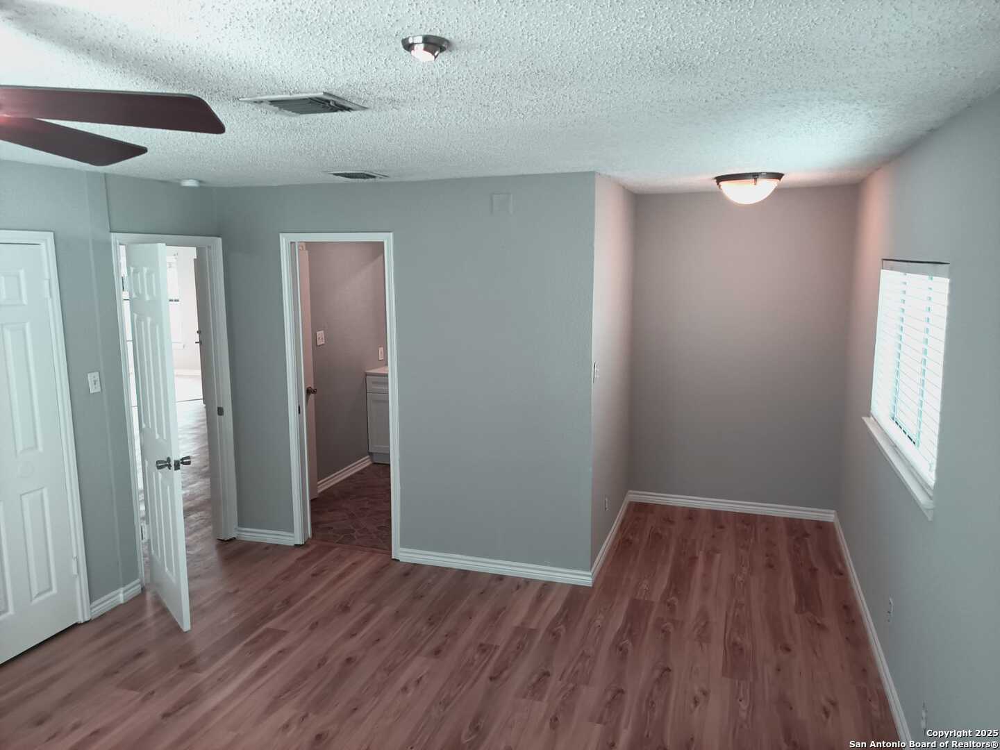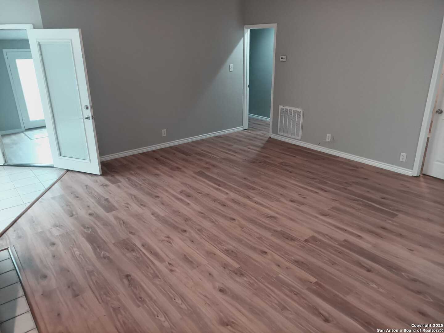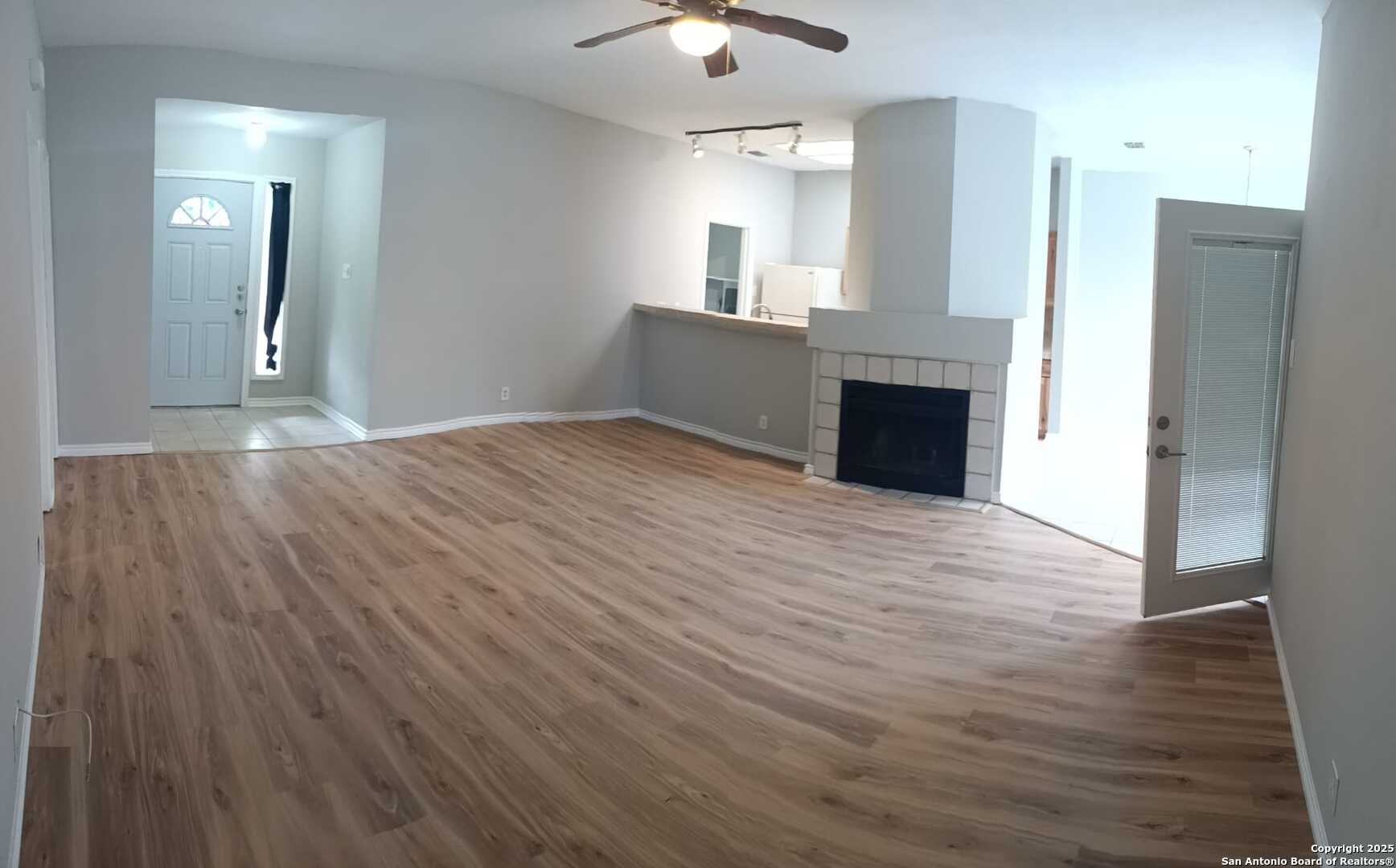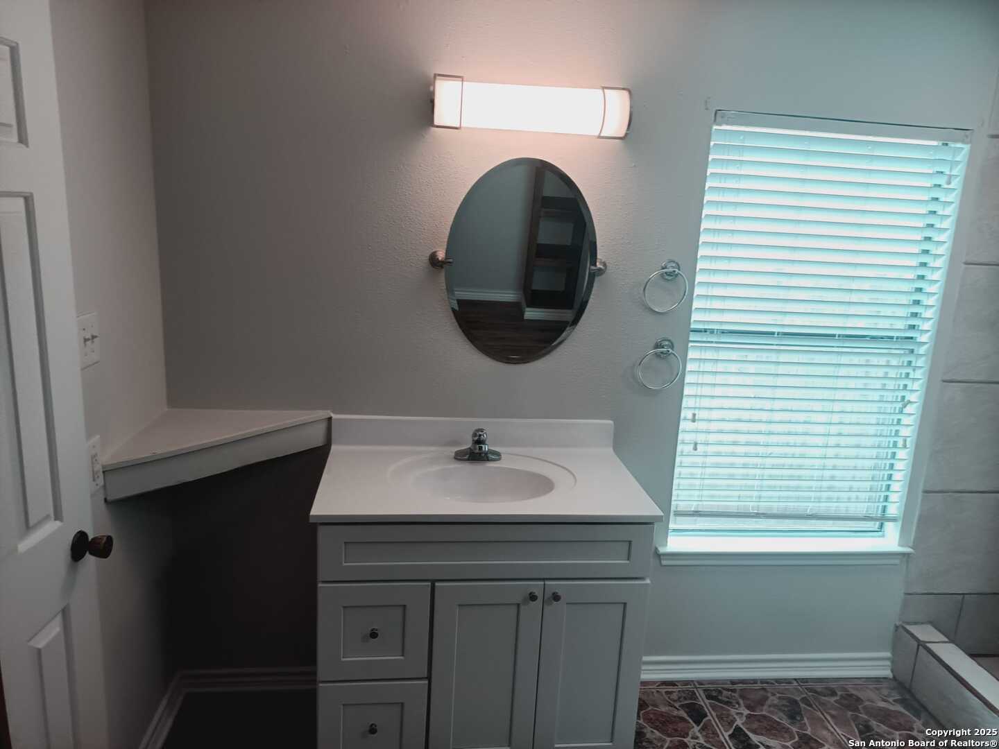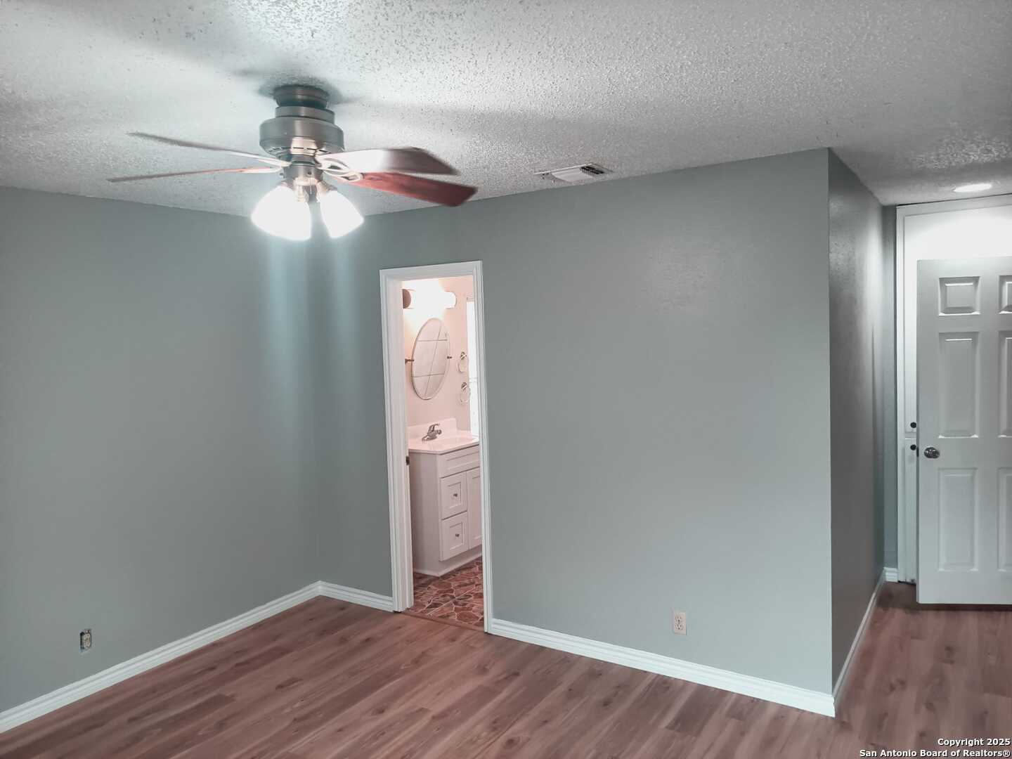 SPACIOUS 3 bedroom 2 bath home. Located in Feather Ridge Subdivision. Nicely remodeled with upgrades including new kitchen cabinets, bathroom cabinets, paint throughout and newly laid floors!. Large open living area and dining area. Backroom opens onto the back patio (no closet located in this 3rd room). Master includes walk in shower and HUGE walk in closet. Two car oversized garage with a work area and lots of storage. Easy access to multiple highways including I35 and 1604 and Loop 410. Appliances include washer, dryer & refrigerator. Step outside to your large, fenced backyard that backs up to a serene greenbelt, providing peace and privacy. It's the ideal spot for outdoor gatherings or simply enjoying nature. Easy Commute to JBSA (formerly Fort Sam Houston), Randolph AFB, Rackspace, RBFCU, IKEA, Shopping and more. Neighborhood has a Community Park with seasonal activities for all. Lawn service available with an additional small monthly fee.