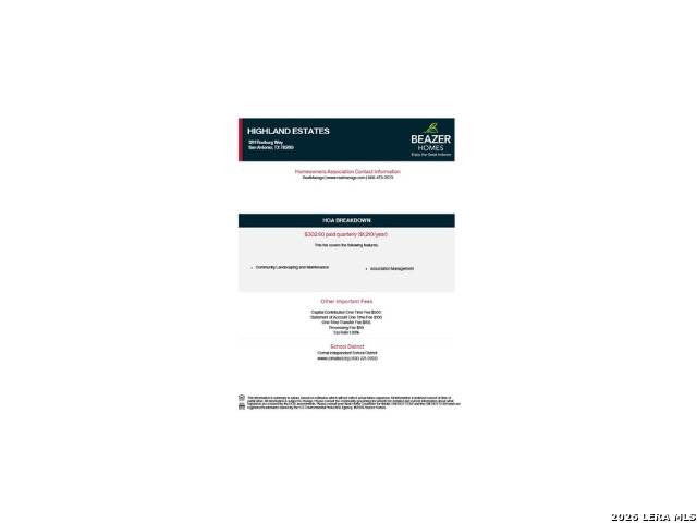 Welcome to Turin Plan, a beautiful one-story home located in the heart of San Antonio built by Beazer Homes. This stunning home features 4 beds and 3.5 baths, offering ample space for comfortable living. The 3,247 sq ft layout includes a spacious living room, a modern kitchen with oversized island, stainless steel appliances, abundant cabinetry, and a cozy dining area. The primary suite boasts spa-inspired bath with dual vanities and a generous walk-in closet, while the additional bedrooms provide plenty of room for family or guests. Step outside to enjoy the spacious cover patio on the .0.62 acre lot, perfect for entertaining or relaxing. Additional highlights include energy-efficient construction and a 3-car Garage. Located in the desirable Highland Estates neighborhood, this home is close to major shopping centers, making it an ideal choice for those seeking convenience and comfort. Beazer Homes is proud to be America's #1 Energy-Efficient homebuilder. In 2024, our homes achieved an average net HERS score of 37 (including solar) and a gross HERS score of 42-the lowest publicly reported scores among the top 30 U.S. homebuilders identified by Builder Magazine's Top 100 list (ranked by 2024 closings).Take advantage of our special buyer incentives which may include closing costs, design studio upgrades, FLEX dollars, and more. Reach out to us today to learn more about how you can benefit from these exclusive offers.
