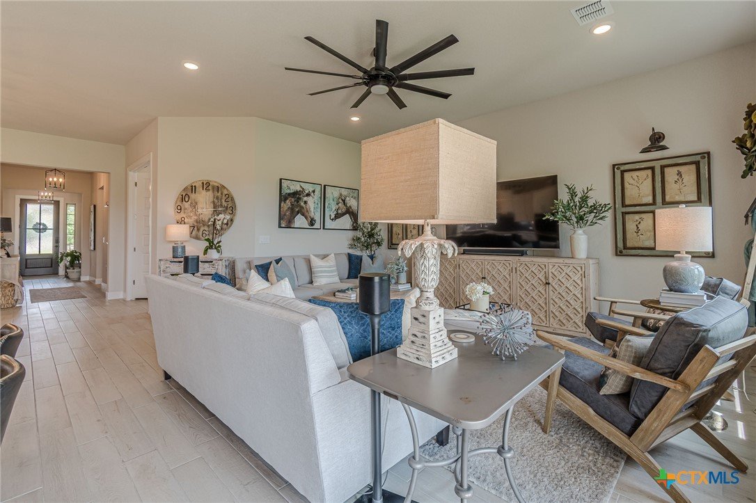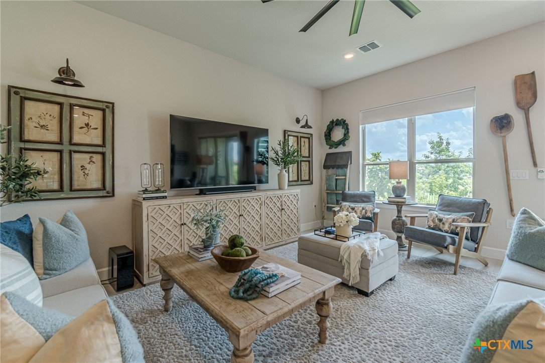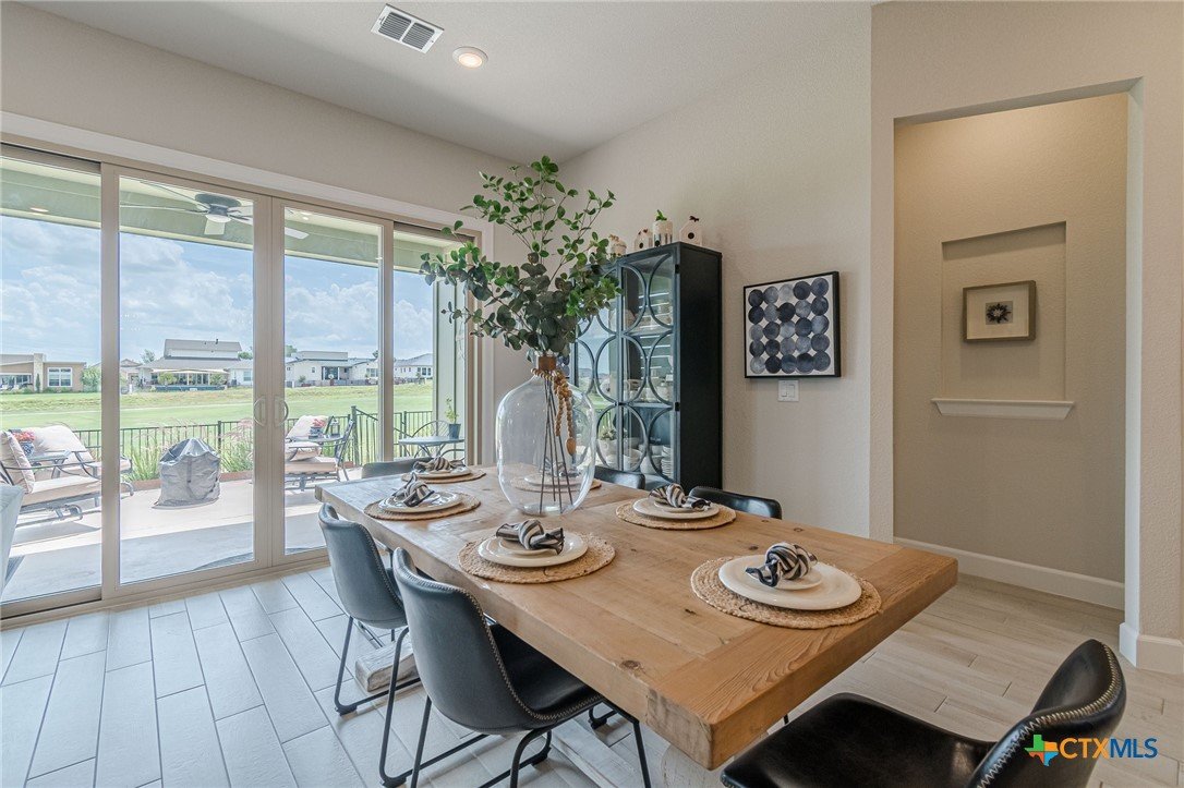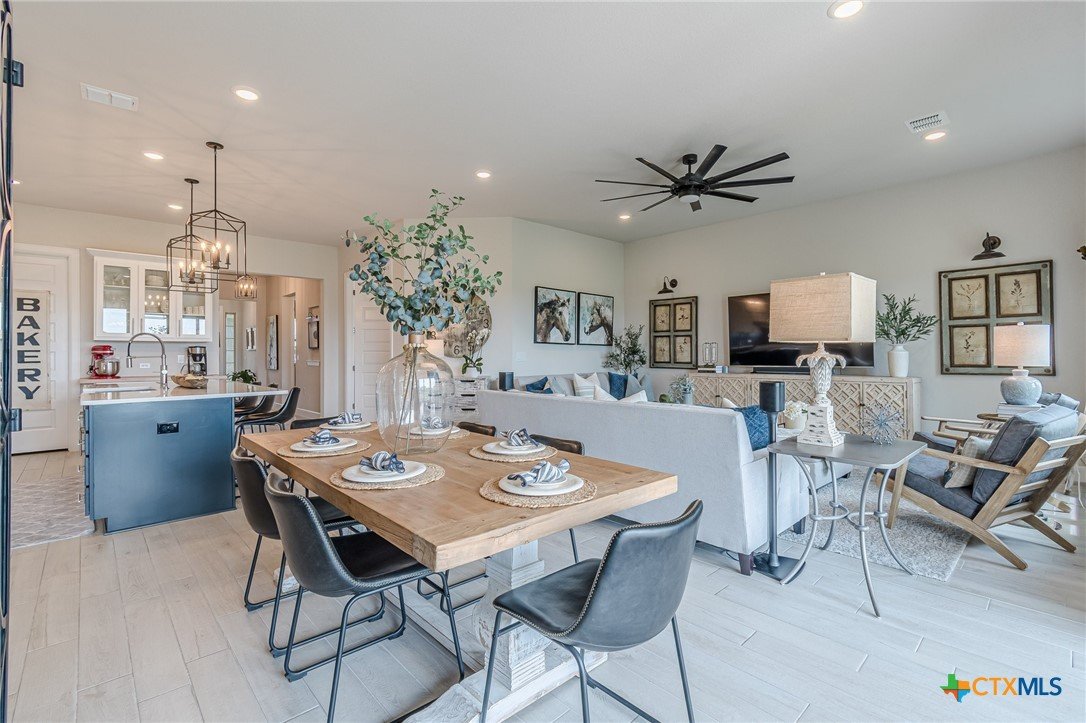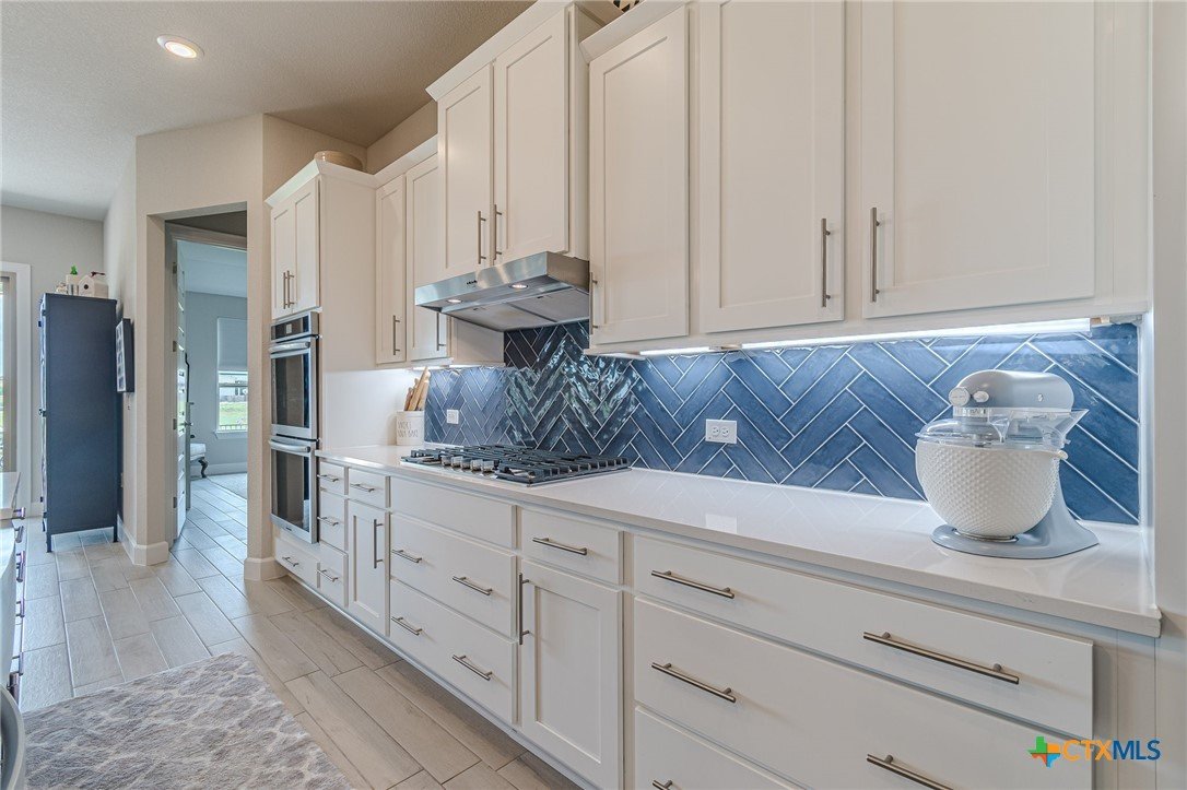 Welcome to this stunning Tulane floor plan, nestled in the prestigious 55+ Kissing Tree community! This home truly stands out—better than new—and checks every box, including a east-facing backyard overlooking the golf course, perfect for enjoying peaceful, shaded evenings. Step inside to a spacious, welcoming entryway that sets the tone for this beautifully designed home. Throughout, you'll find the perfect tone of light flooring that complements any style and adds warmth and continuity to the space. At the heart of the home lies a chef’s dream kitchen, featuring a striking two-tone blue and white cabinet design, quartz countertops, a blue subway tile backsplash, and a large island with farmhouse sink. Top-tier stainless steel appliances, double ovens, and custom pendant lighting enhance both form and function. Don't miss the custom coffee bar with butcher block top and glass-front cabinets—added post-build for that extra designer touch. One of the home's standout features is the rare, customized storage room—perfect for kitchen extras, hobbies, crafts, or easily accessible holiday decor. The open-concept kitchen, dining, and living area makes entertaining a breeze, with ample space to gather and relax. This thoughtfully designed floor plan includes two bedrooms, two full baths, and a versatile study/den. The primary suite is generously sized and offers serene golf course views. The luxurious en-suite bath includes custom-framed mirrors, elegant ceramic tile flooring, and a convenient get-ready bench. Additional highlights include: Extended garage with an extra four feet—roomy enough for two cars plus a golf cart, overhead garage storage for even more convenience, and custom built extended back patio and landscaping to maximize your outdoor living. Don’t miss your chance to own this exceptional home in one of the area's most sought-after communities. Schedule your tour today—before it's gone!