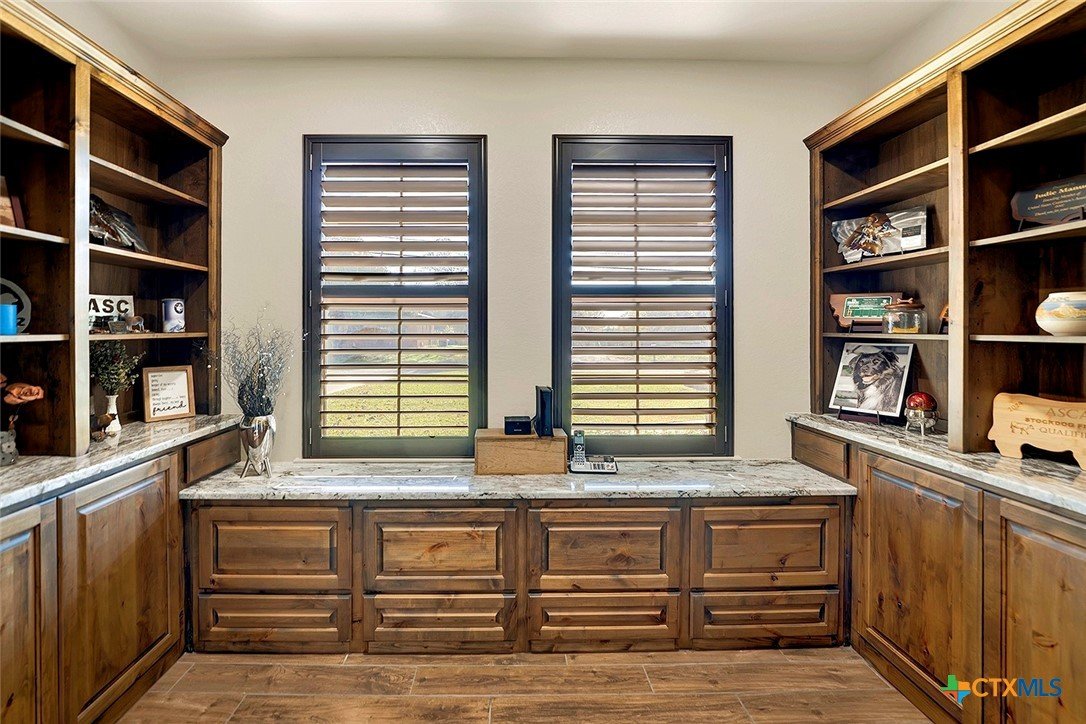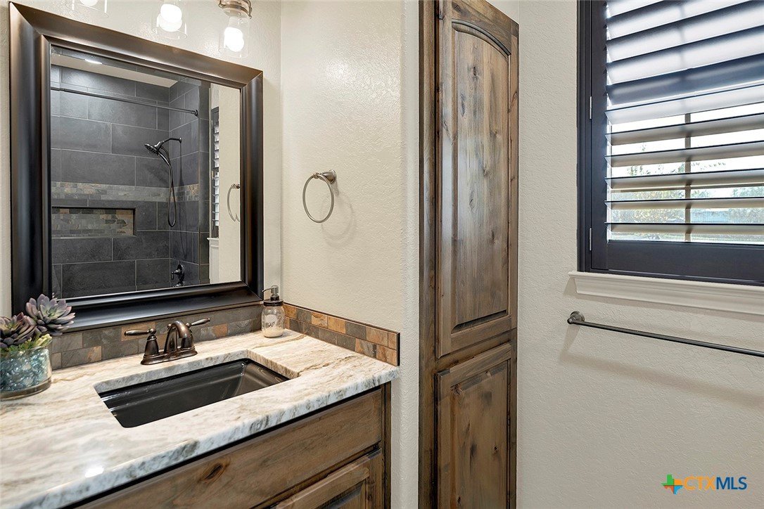 Discover your dream home in downtown Floresville, TX! This immaculate home features high end custom finishes. There is custom cabinetry throughout, plantation shutters, electric window coverings in living area, updated kitchen surfaces & backsplash, RO water system, central vacuum system, HUGE pantry and more storage than you can imagine! Situated on a lovely oversized lot, meticulously maintained lush lawn and landscaping, sprinkler system, gutters, standing seam metal roof, automatic gated driveway perfect for play & functionality, RV hook up with water, covered back porch with epoxy flooring & gas port for grill hookup, pest control system, full home generator and 1200 sq. ft. storage shed. And the 2 car garage that is no ordinary space; it features a mini split to keep you cool, custom cabinets, half bath and epoxy flooring. Home is desirably located and if you have driven through the downtown Floresville neighborhoods, we guarantee it has stood out to you! With this location, condition & extras in this home, it certainly won't last long; don't miss this rare find!