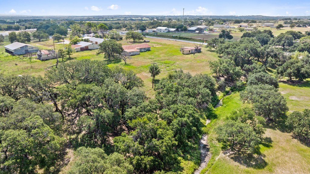 46+ unrestricted acre commercial opportunity. Highly visible property from three sides road frontage: ~1,000 feet of Hwy 290 frontage, ~2,000 feet of RM 1 frontage, and ~350 feet of county road Elberta. Community water at street on multiple sides, CTEC 3 and standard electric service in multiple locations, across property, 2 water wells, large oaks, big views, diverse topo, large barns and buildings provide the opportunity to repurpose for a variety of uses. Agent has ownership in property.