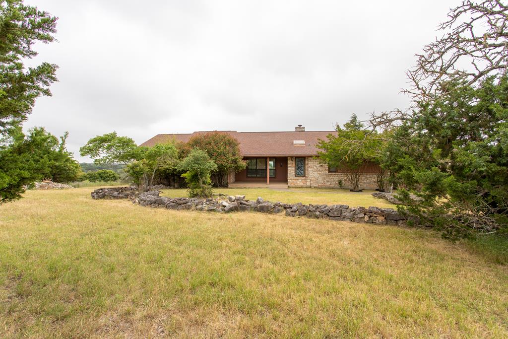 Great hill country home two living areas, one of looks out to rolling hills. Property is cross fenced with, separate fenced areas on either side of the house. Tall pines, rock planters, stone patio/courtyard, and small storage shed. Sixteen Hundred sq ft, insulated metal building with roll door entries on each end, concrete floors, electric and water access. It has stone and landscaping on front and side. Fenced separately with a separate gated drive entry. Multiple water faucets along fence line. House has a covered front porch that steps into an entry into large living room with vaulted ceiling, stone fireplace that opens into living room and dining room. Dining area has large windows, vaulted ceiling and unique wood feature. Kitchen has an oversized eating bar, lots of storage and solid cabinets. Walk in pantry, utility room and half bath with access from kitchen and garage. Second living area is a large enclosed porch with tile planking, ceiling fan, electrical outlets and wall unit for temperature control. New back steps lead down to a large stoned patio area, great for entertaining. Lots of room inside and out. Beautiful country living with easy city access.