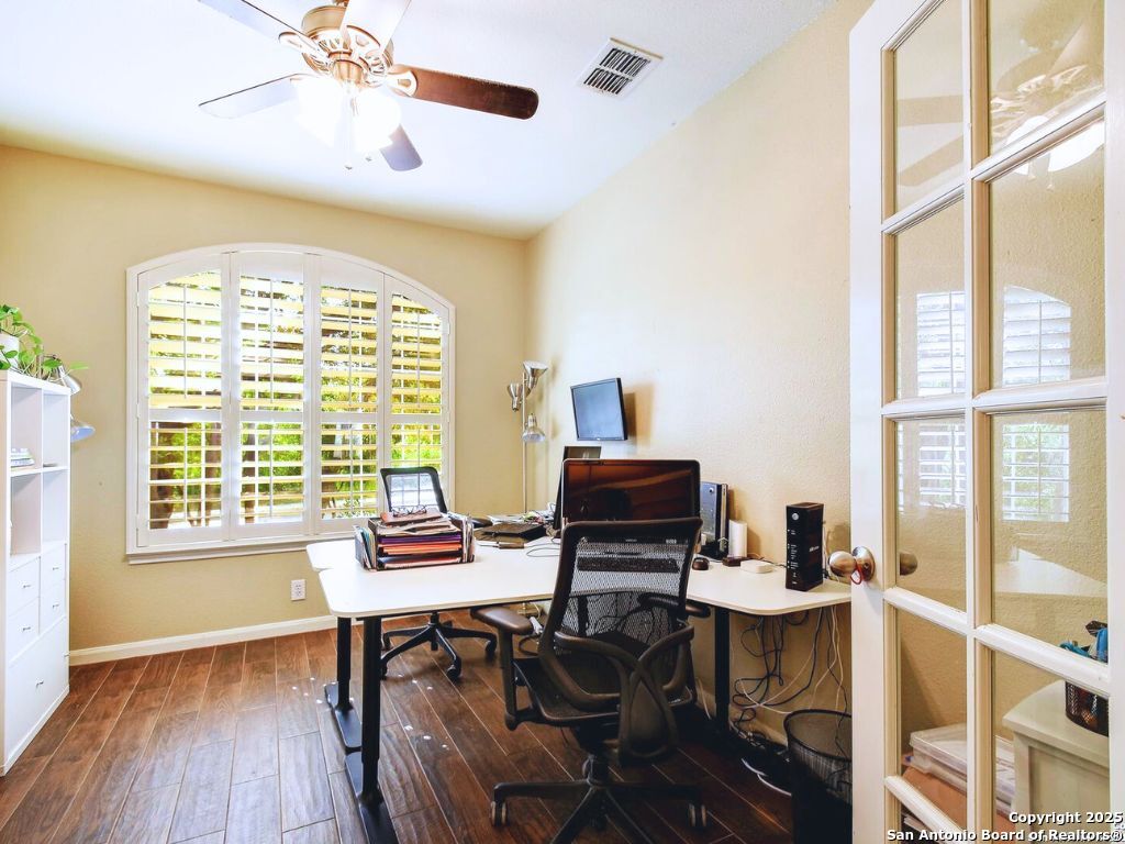 Waiving all APPLICATION FEES, Beautiful 2-Story Home in Bella Vista with Stunning Greenbelt Views! Welcome to your dream home-where gorgeous greenbelt views greet you from both the front and back! Built in 2007, this spacious 3,100 sq ft two-story blends timeless charm with thoughtful updates and plenty of room for everyone. Enjoy an open floor plan filled with natural light and soaring high ceilings. Movie nights are a breeze in the dedicated media room, and the upstairs game room is perfect for family fun. The first-floor primary suite is a true retreat, featuring a spa-inspired en-suite bath and a walk-in closet with an upgraded Elfa System for ultimate organization. The island kitchen is ready for your culinary adventures, complete with a walk-in pantry and separate dining space for special gatherings. Need to work from home? There's a private office to keep you productive! Upstairs, you'll find generously sized secondary bedrooms connected by a convenient Jack & Jill bathroom, plus a flexible family room for relaxing or entertaining. Pet lovers will appreciate the built-in pet room under the stairs-practical and playful! All this, just steps from the community park and pool, with easy access to shopping, schools, and more. This home offers the perfect blend of space, comfort, and classic style. Ready to see it for yourself? Schedule your tour today and experience all that Bella Vista living has to offer! Photos are previous to current tenant.