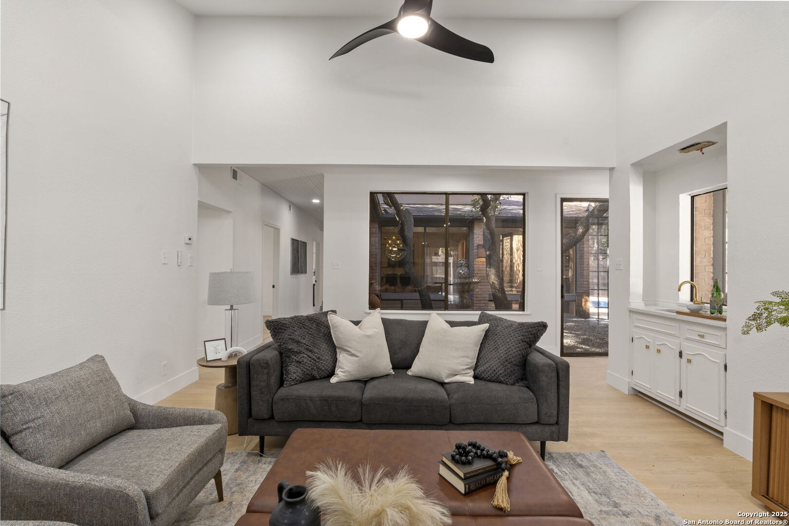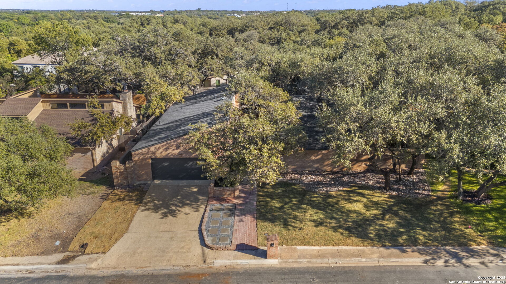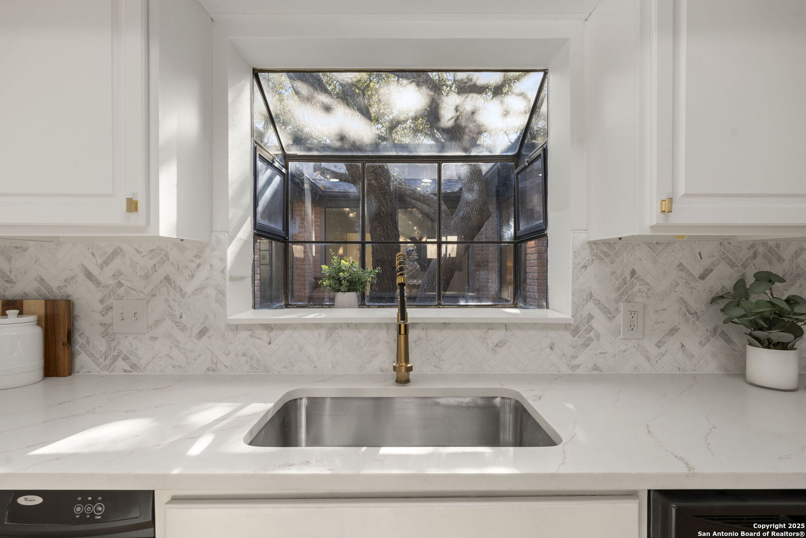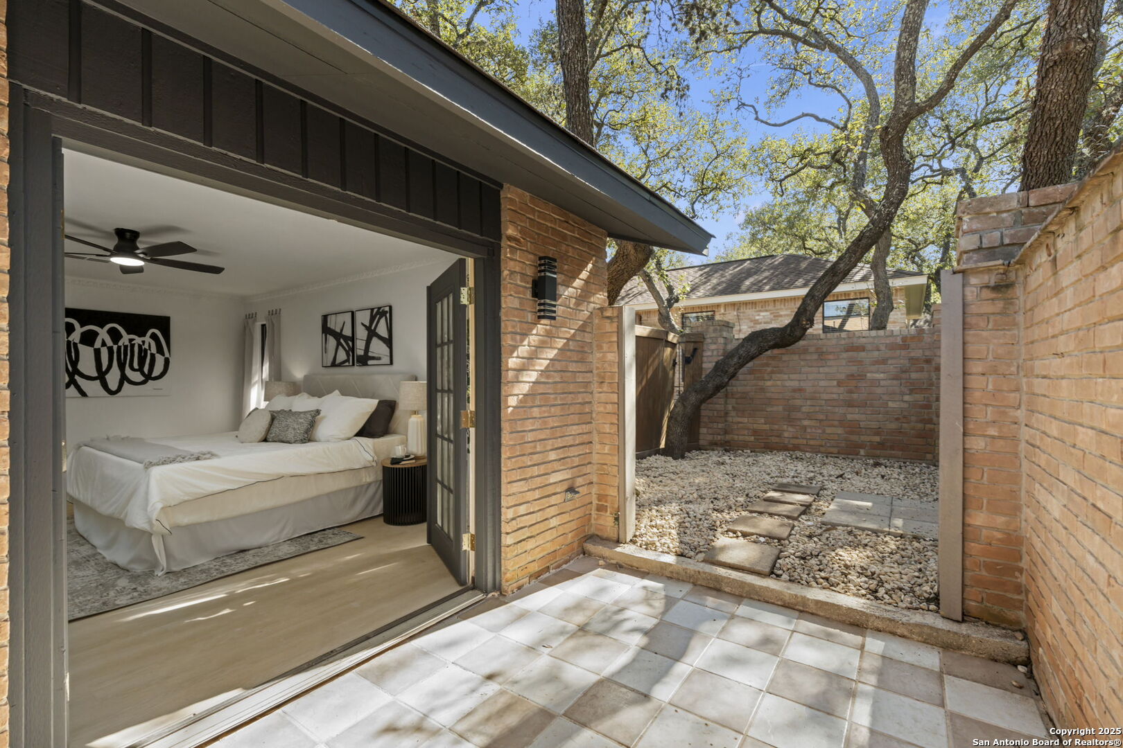 Tucked beneath mature live oaks on a quiet street in the highly desirable Hunters Creek, this fully reimagined four-bedroom, three-bathroom home with an office AND a pool delivers over 2,500 square feet of SINGLE-level sophistication and indoor-outdoor flow. A countless amount of upgrades have been put into this home thoughtfully and carefully. Behind the private brick facade, an unexpected world unfolds - vaulted ceilings, crisp white walls, and expansive windows that fill the home with natural light. At the heart of it all, a central glass atrium serves as the home's architectural centerpiece - featuring a tranquil fountain surrounded by mature trees and framed views from nearly every room - blending the serenity of nature with the clean lines of modern design. The chef's kitchen is a showstopper, designed for both beauty and function. It features a long island, quartz countertops, herringbone backsplash, brass hardware, and stainless steel appliances. The bright breakfast nook with bay windows overlooks the sparkling pool, while the formal dining area and open-concept living room allow for seamless entertaining. The primary suite serves as a serene private retreat with French doors opening to a private walled patio, a custom walk-in closet, and a spa-inspired ensuite bath complete with a freestanding soaking tub, dual illuminated vanities, and a striking designer shower in contrasting tile. Three additional bedrooms and two full baths offer flexibility for family and guests. The home's thoughtful layout spans over 2,500 square feet of curated comfort, blending mid-century character with modern design. Every space feels intentional - from the natural-toned flooring and statement lighting to the courtyard views that bring the outdoors in. Outside, the private backyard features a sparkling pool, mature oaks, and a patio designed for al fresco dining or sunset lounging. Perfectly positioned near Wurzbach Parkway, Loop 1604, and I-10, this home combines modern elegance with everyday convenience. With its architectural charm, tranquil ambiance, and proximity to top-rated schools, shopping, and dining, 13114 N Hunters Circle is a rare offering that embodies the best of San Antonio living. Don't miss out on your opportunity to make this home yours today!