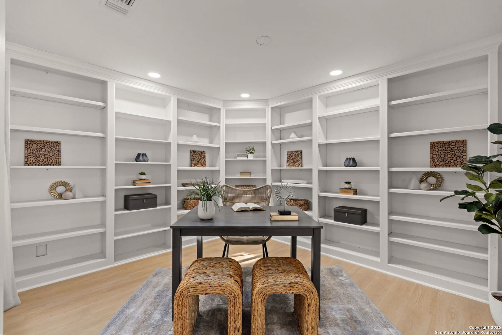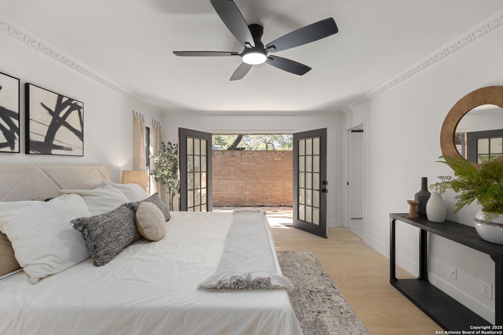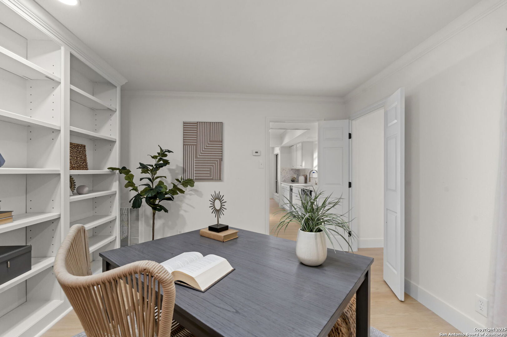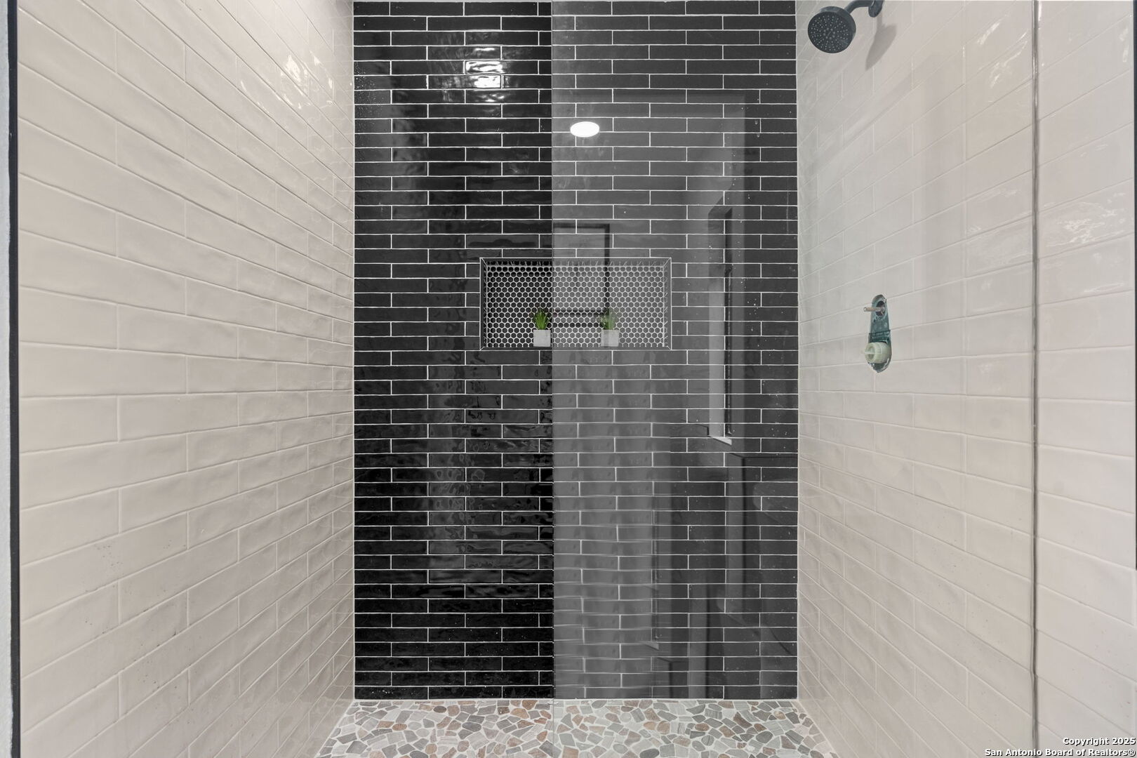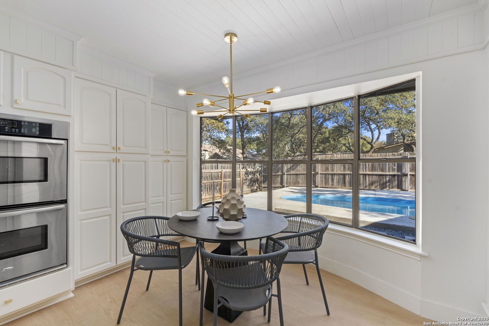 Tucked beneath mature live oaks on a quiet street in the highly desirable Hunters Creek, this fully reimagined four-bedroom, three-bathroom home with an office AND a pool delivers over 2,500 square feet of SINGLE-level sophistication and indoor-outdoor flow. A countless amount of upgrades have been put into this home thoughtfully and carefully. Behind the private brick facade, an unexpected world unfolds - vaulted ceilings, crisp white walls, and expansive windows that fill the home with natural light. At the heart of it all, a central glass atrium serves as the home's architectural centerpiece - featuring a tranquil fountain surrounded by mature trees and framed views from nearly every room - blending the serenity of nature with the clean lines of modern design. The chef's kitchen is a showstopper, designed for both beauty and function. It features a long island, quartz countertops, herringbone backsplash, brass hardware, and stainless steel appliances. The bright breakfast nook with bay windows overlooks the sparkling pool, while the formal dining area and open-concept living room allow for seamless entertaining. The primary suite serves as a serene private retreat with French doors opening to a private walled patio, a custom walk-in closet, and a spa-inspired ensuite bath complete with a freestanding soaking tub, dual illuminated vanities, and a striking designer shower in contrasting tile. Three additional bedrooms and two full baths offer flexibility for family and guests. The home's thoughtful layout spans over 2,500 square feet of curated comfort, blending mid-century character with modern design. Every space feels intentional - from the natural-toned flooring and statement lighting to the courtyard views that bring the outdoors in. Outside, the private backyard features a sparkling pool, mature oaks, and a patio designed for al fresco dining or sunset lounging. Perfectly positioned near Wurzbach Parkway, Loop 1604, and I-10, this home combines modern elegance with everyday convenience. With its architectural charm, tranquil ambiance, and proximity to top-rated schools, shopping, and dining, 13114 N Hunters Circle is a rare offering that embodies the best of San Antonio living. Don't miss out on your opportunity to make this home yours today!
