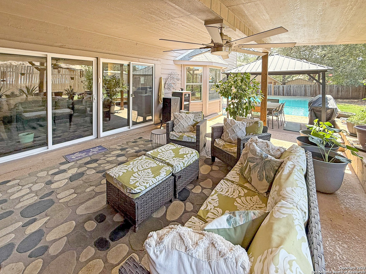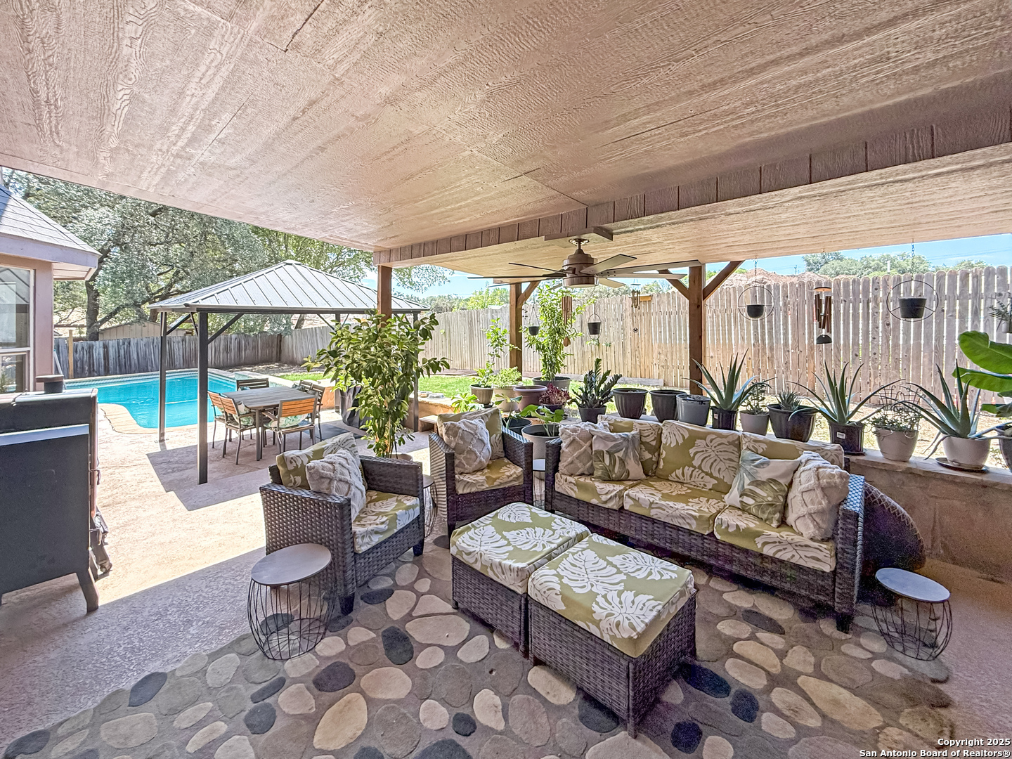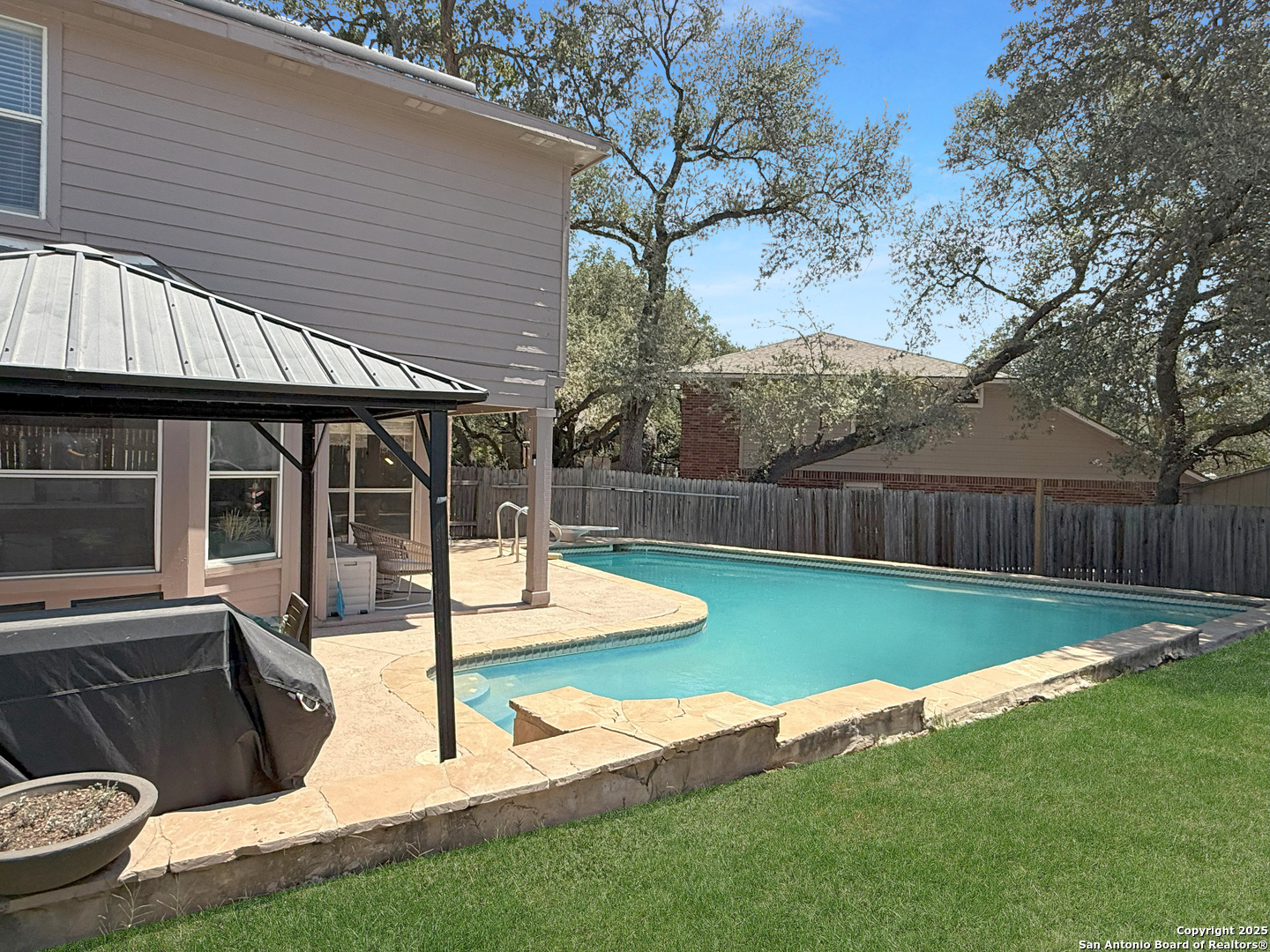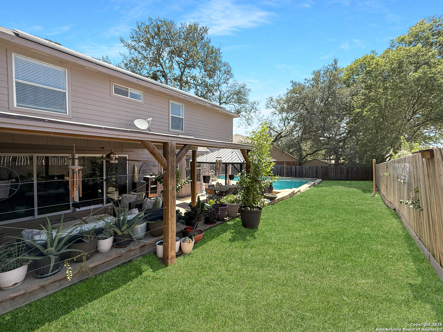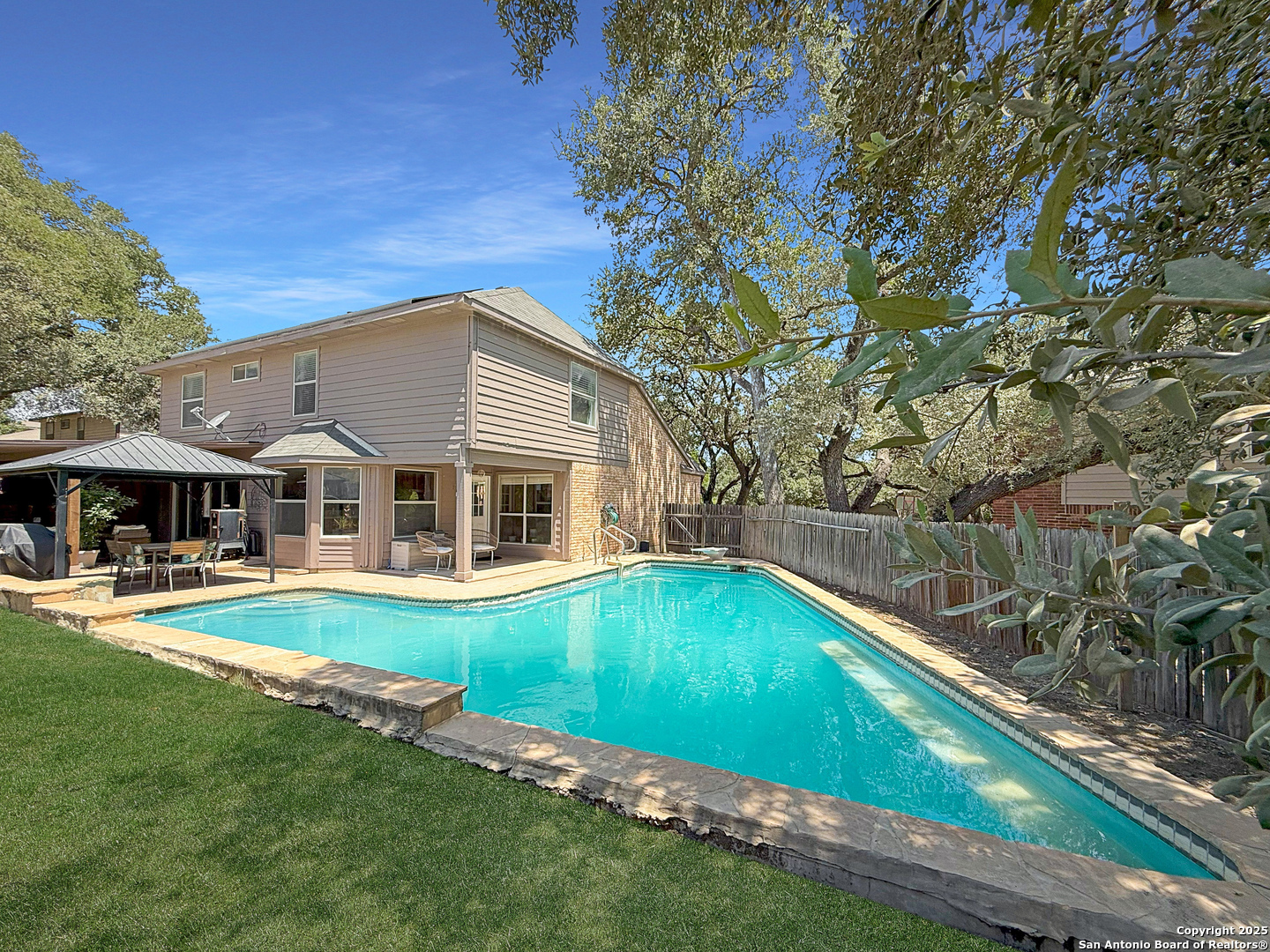 Tucked away on a peaceful cul-de-sac in Universal City, this beautiful 4-bedroom, 2.5-bath home is the perfect blend of comfort, efficiency, and style. A whole-home Generac generator (excluded but available with the right offer) provides reliable backup power and protection against brownouts, while paid-off solar panels ensure long-term energy savings and efficiency, giving you peace of mind and reduced utility costs. Surrounded by mature trees and located just minutes from The Forum, IH 35, 1604, and Randolph AFB, you'll love the unbeatable location. It's the backyard that truly steals the show. Step into your own private retreat featuring a sparkling pool, a custom pergola, and a spacious patio designed for gatherings or peaceful moments of relaxation with your beverage of choice. Upgraded sliding glass doors seamlessly connect indoor and outdoor living, making it easy to enjoy the best of both worlds. Inside, natural light fills the open-concept layout, creating a warm and welcoming atmosphere. The kitchen offers new appliances (including the fridge), a breakfast area, kitchen island, and direct access to the pool. Upstairs, spacious bedrooms provide restful retreats, including a primary suite with a double vanity and serene vibes. This home has been thoughtfully upgraded with a newer 16+ SEER HVAC system (condenser, furnace, and ducting), a new stove, dishwasher, and pool pump. Washer, dryer, refrigerator, outdoor TV, and patio furniture all convey so you can move in and start enjoying right away. If you're looking for a well-cared-for home with energy efficiency, reliable backup power, an amazing outdoor space, and a prime location, this is the one.