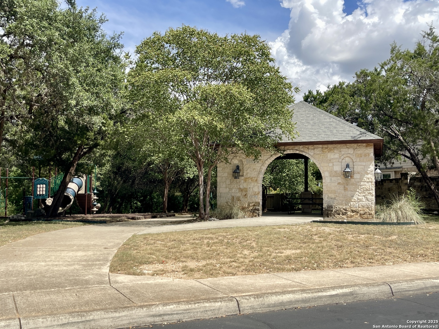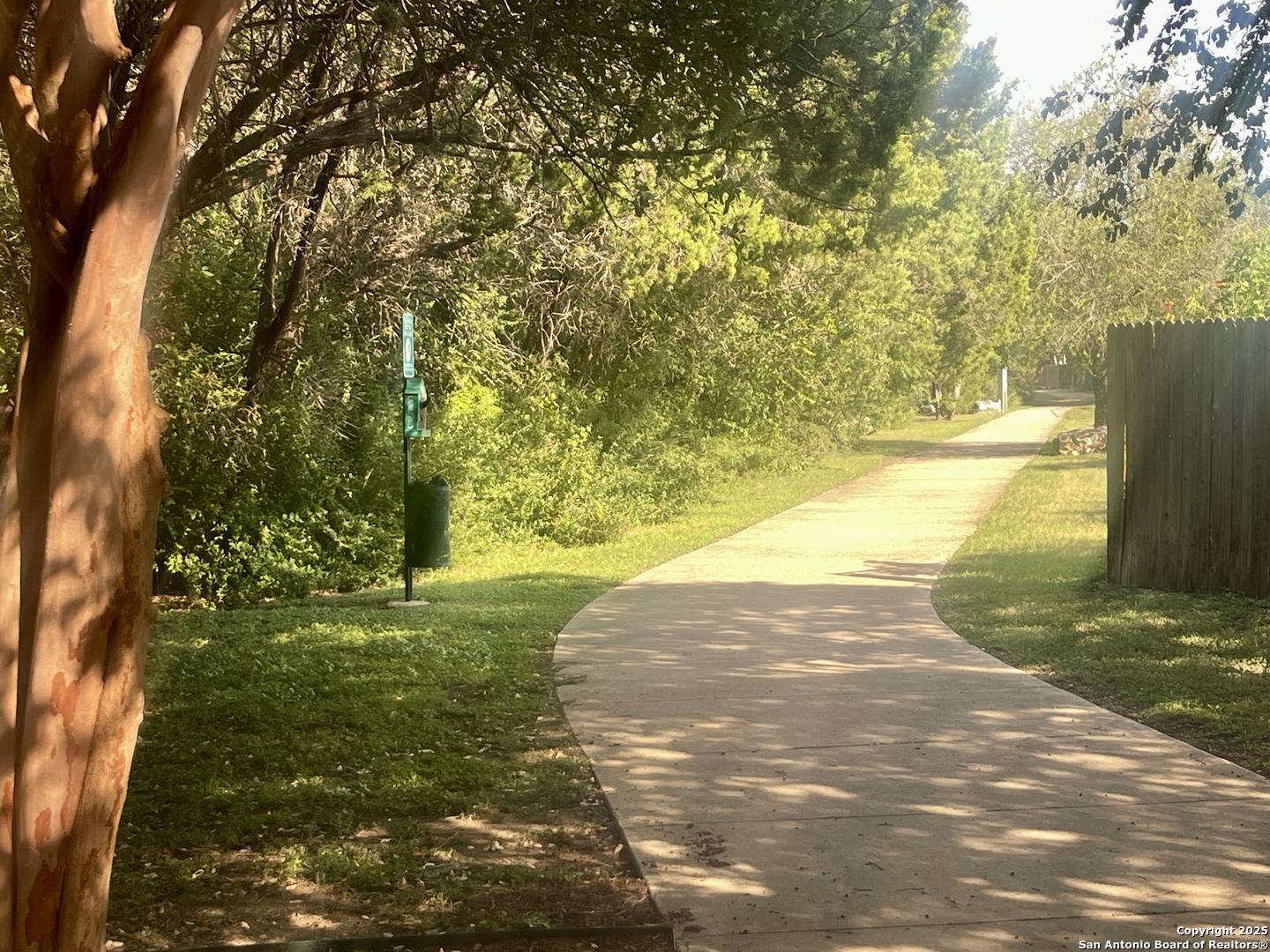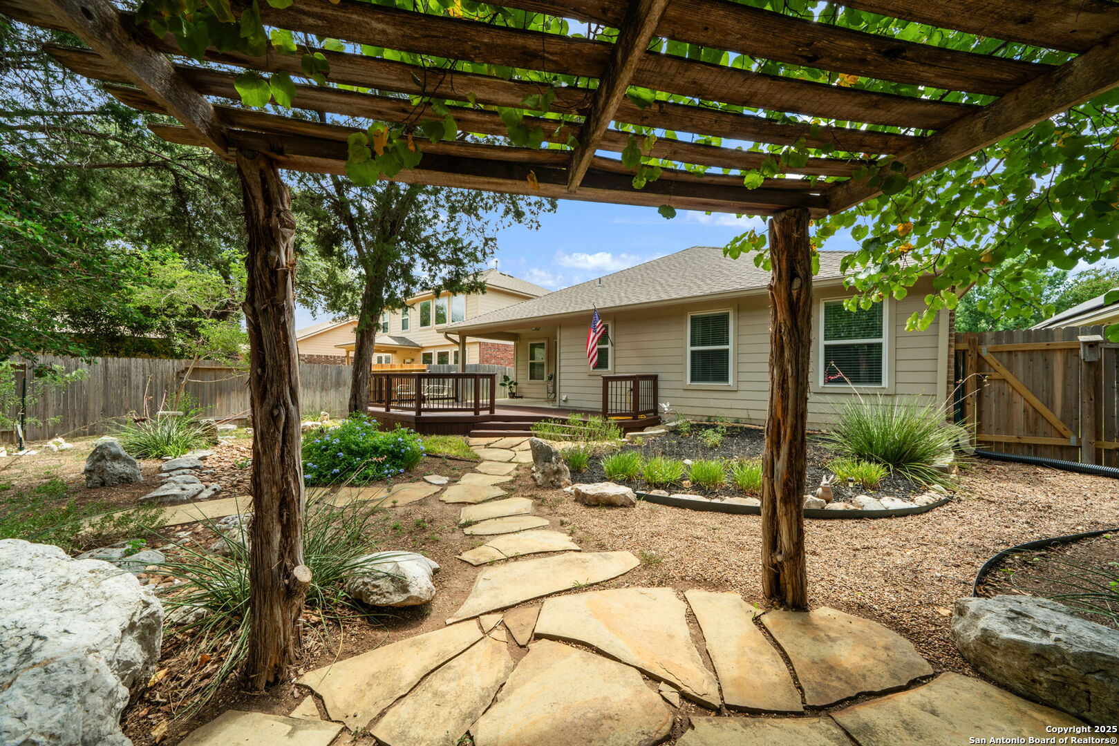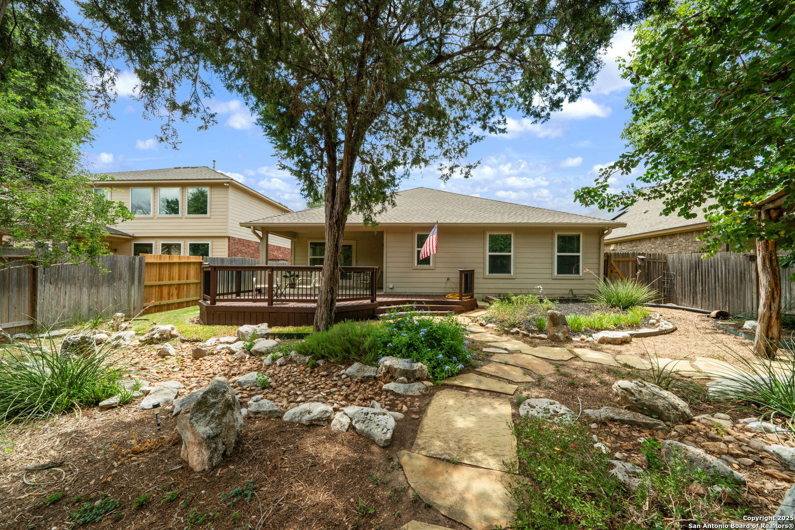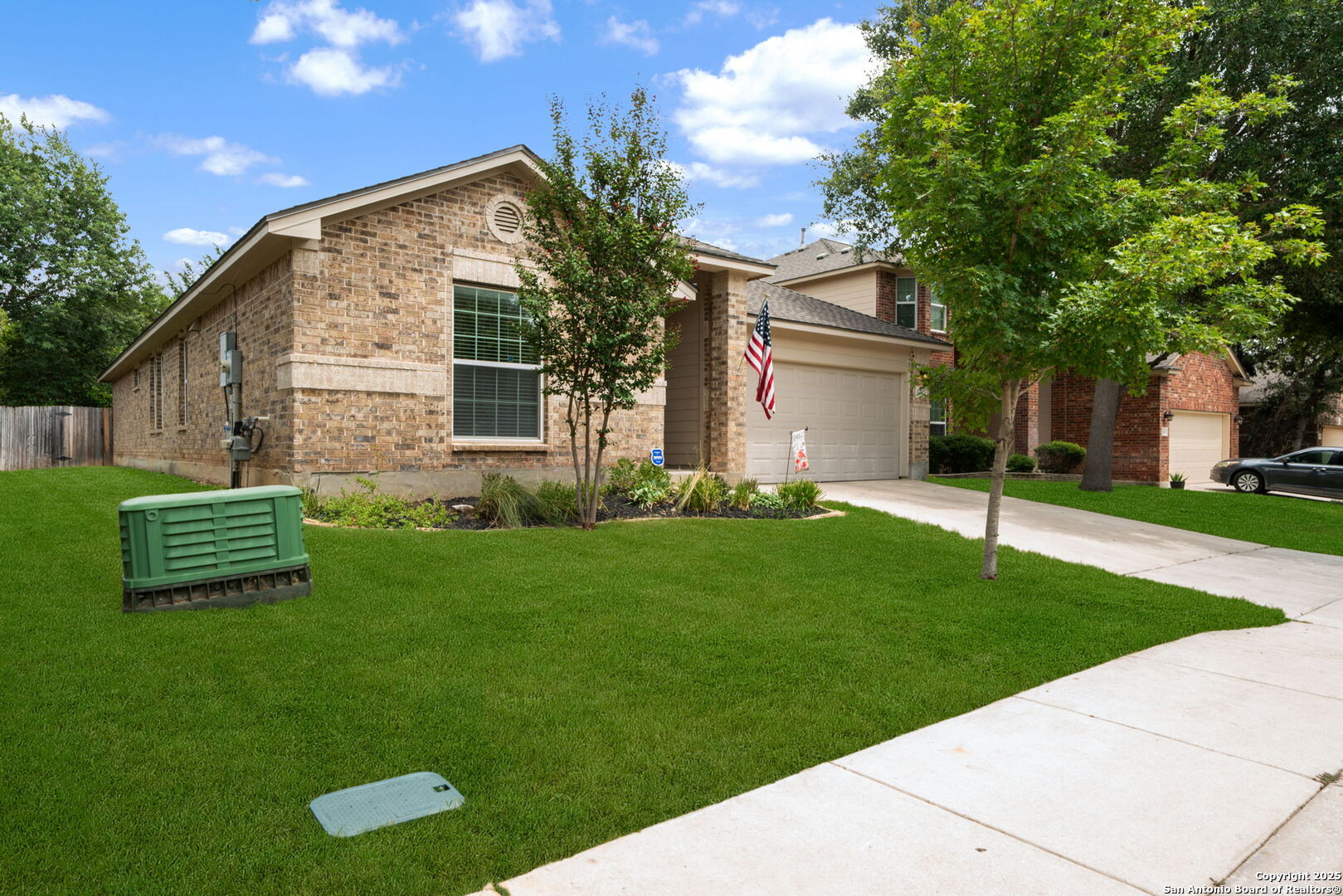 Coveted one story on a greenbelt! Birder's paradise. Watch the wildlife from your extended back deck or the shade of your covered patio. Charming Northside home is gracious and inviting, truly a winner with wood-look luxury vinyl flooring and 18" tile flooring. No carpet whatsoever. Possessing an ideal flow for entertaining, you'll enjoy a large kitchen with island, breakfast bar, and plenty of wonderful maple glazed cabinetry. Microwave (Dec 2024), Water heater (2019). With a 22X21 foot family room you and yours will never be cramped for space. A gas fireplace adds ambiance while high ceilings, natural lighting and a roomy study combine beautifully. Perfect for working from home or having a dedicated hobby room. The primary retreat is located at the back of the home overlooking an attractive arbor with flagstone walk and bench. Iron fencing overlooks the community walking trail beyond the fence. The spa-like primary bath includes double vanity, large walk in closet and separate/shower tub. Utility room /pantry is spacious as well with white pantry cabinets that convey. This is truly a winning plan. The backyard takes advantage of native flora with a xeroscape feel that includes river rock to simulate a hill country creekbed. New roof just installed 2025! Nest learning thermostat. Sprinkler System, water softener and Eufy doorbell round off the package. Fabulous location with highly desirable schools including Brandeis HS. The community offers a pavilion, park/playground and walking trail with exercise stations. Come Home!