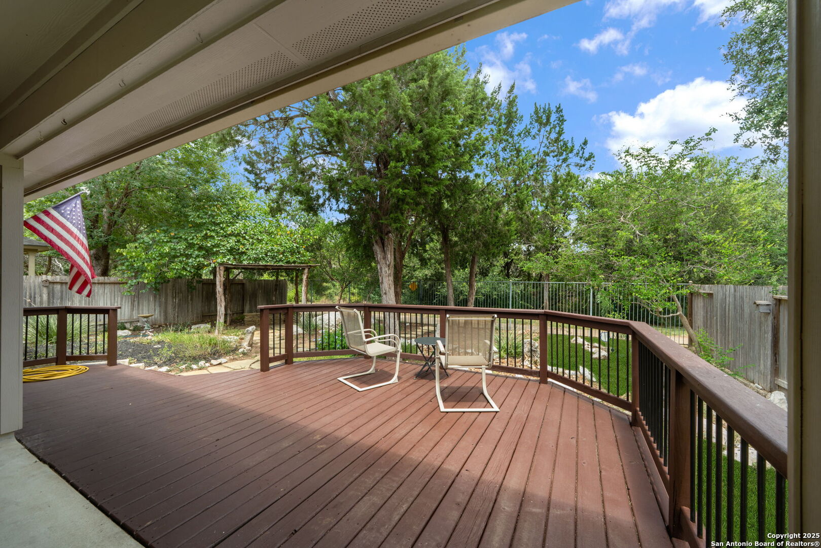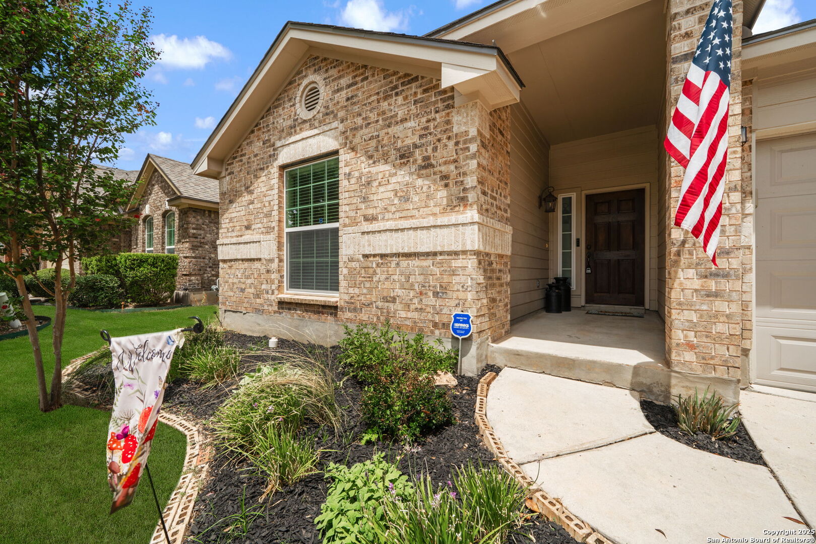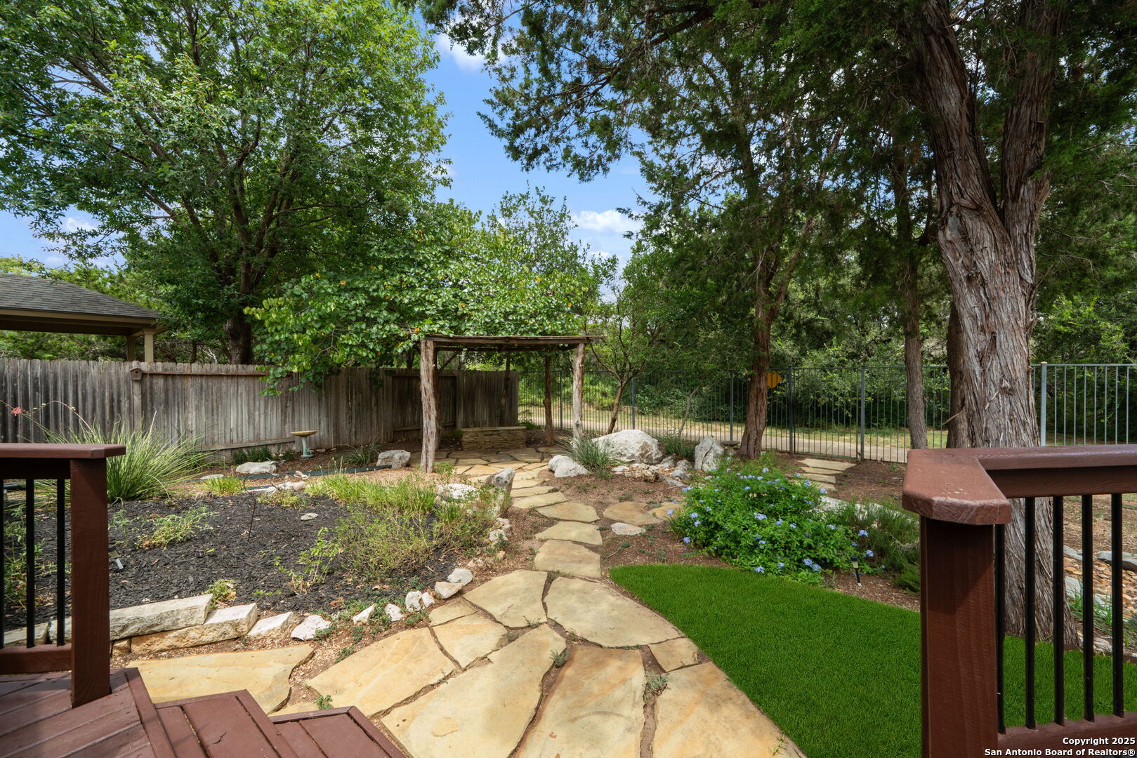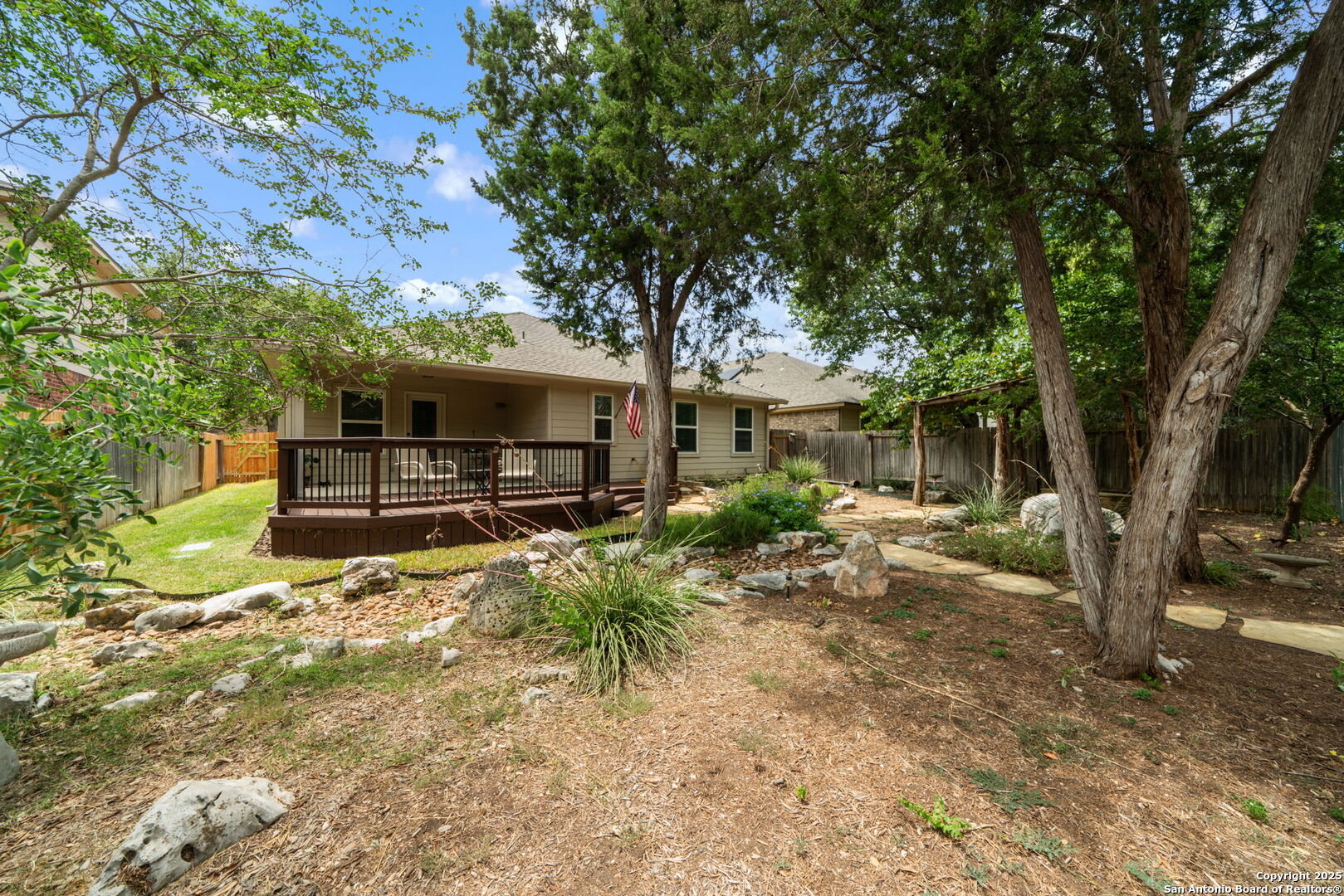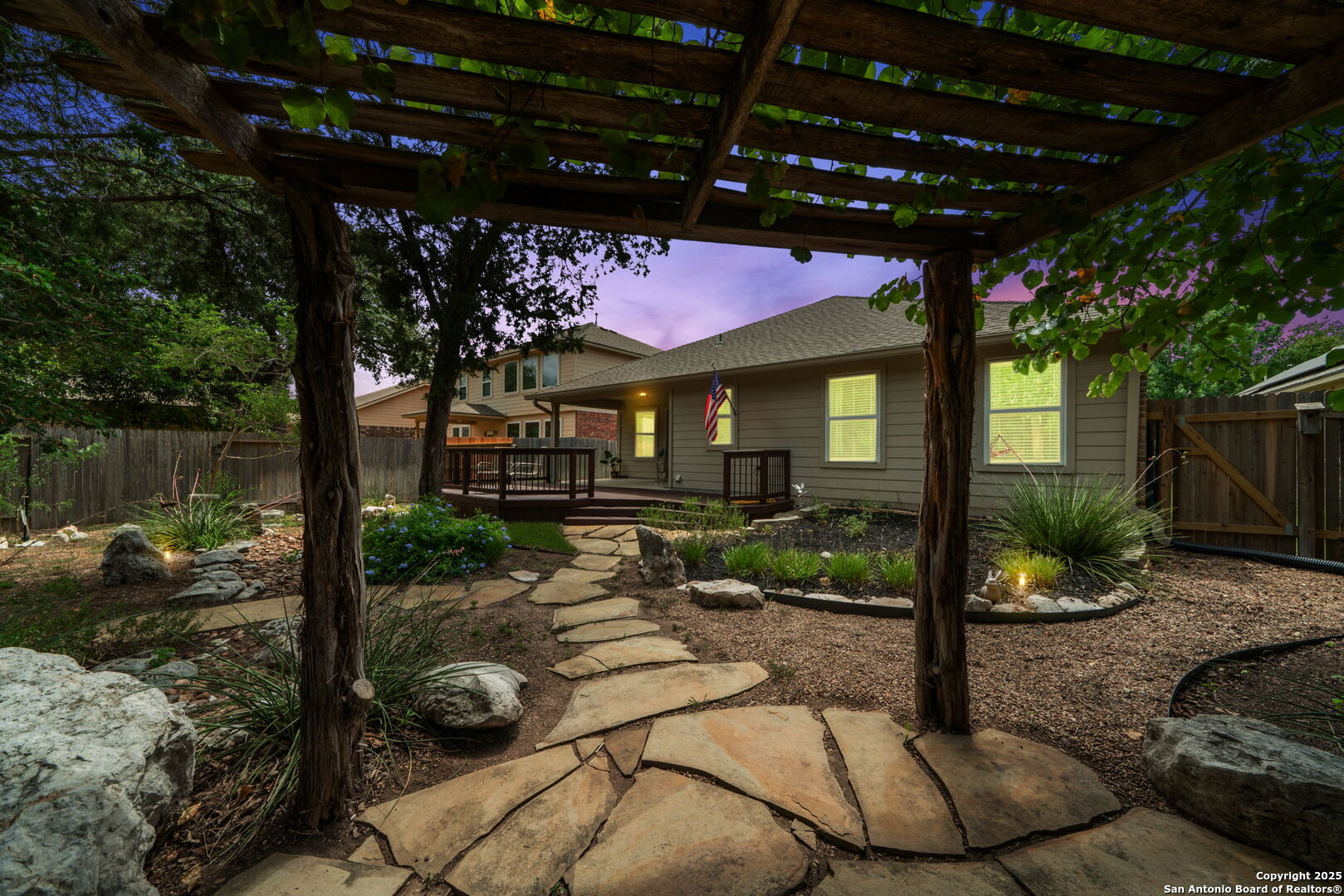 Coveted one story on a greenbelt! Birder's paradise. Watch the wildlife from your extended back deck or the shade of your covered patio. Charming Northside home is gracious and inviting, truly a winner with wood-look luxury vinyl flooring and 18" tile flooring. No carpet whatsoever. Possessing an ideal flow for entertaining, you'll enjoy a large kitchen with island, breakfast bar, and plenty of wonderful maple glazed cabinetry. Microwave (Dec 2024), Water heater (2019). With a 22X21 foot family room you and yours will never be cramped for space. A gas fireplace adds ambiance while high ceilings, natural lighting and a roomy study combine beautifully. Perfect for working from home or having a dedicated hobby room. The primary retreat is located at the back of the home overlooking an attractive arbor with flagstone walk and bench. Iron fencing overlooks the community walking trail beyond the fence. The spa-like primary bath includes double vanity, large walk in closet and separate/shower tub. Utility room /pantry is spacious as well with white pantry cabinets that convey. This is truly a winning plan. The backyard takes advantage of native flora with a xeroscape feel that includes river rock to simulate a hill country creekbed. New roof just installed 2025! Nest learning thermostat. Sprinkler System, water softener and Eufy doorbell round off the package. Fabulous location with highly desirable schools including Brandeis HS. The community offers a pavilion, park/playground and walking trail with exercise stations. Come Home!