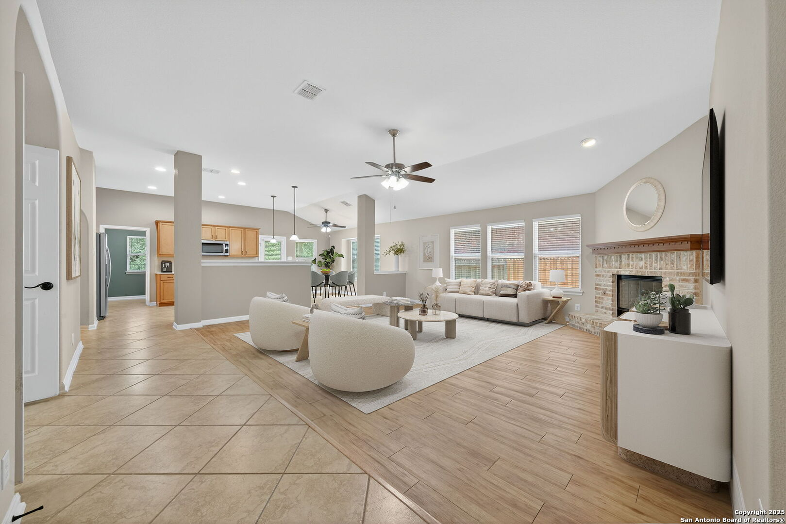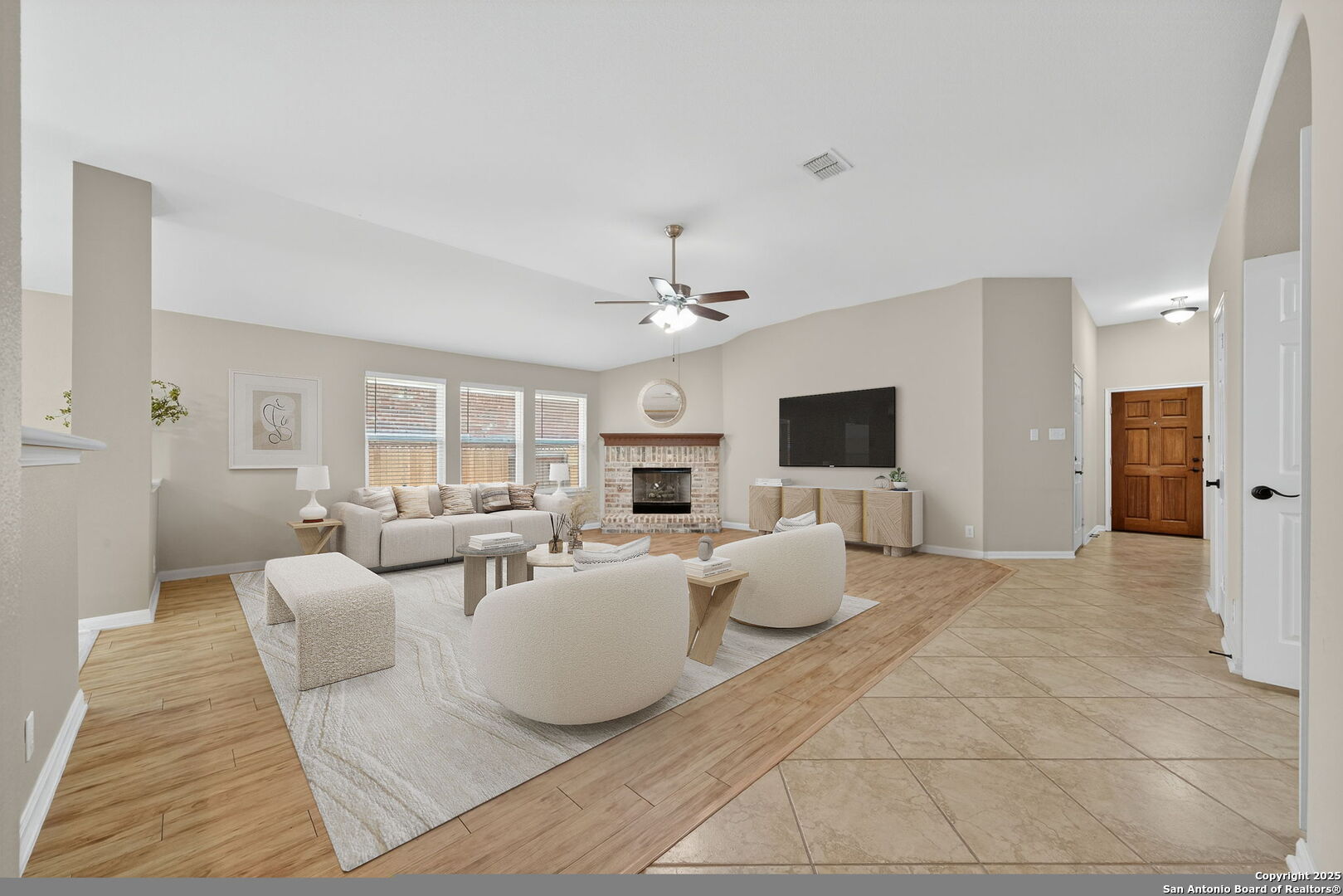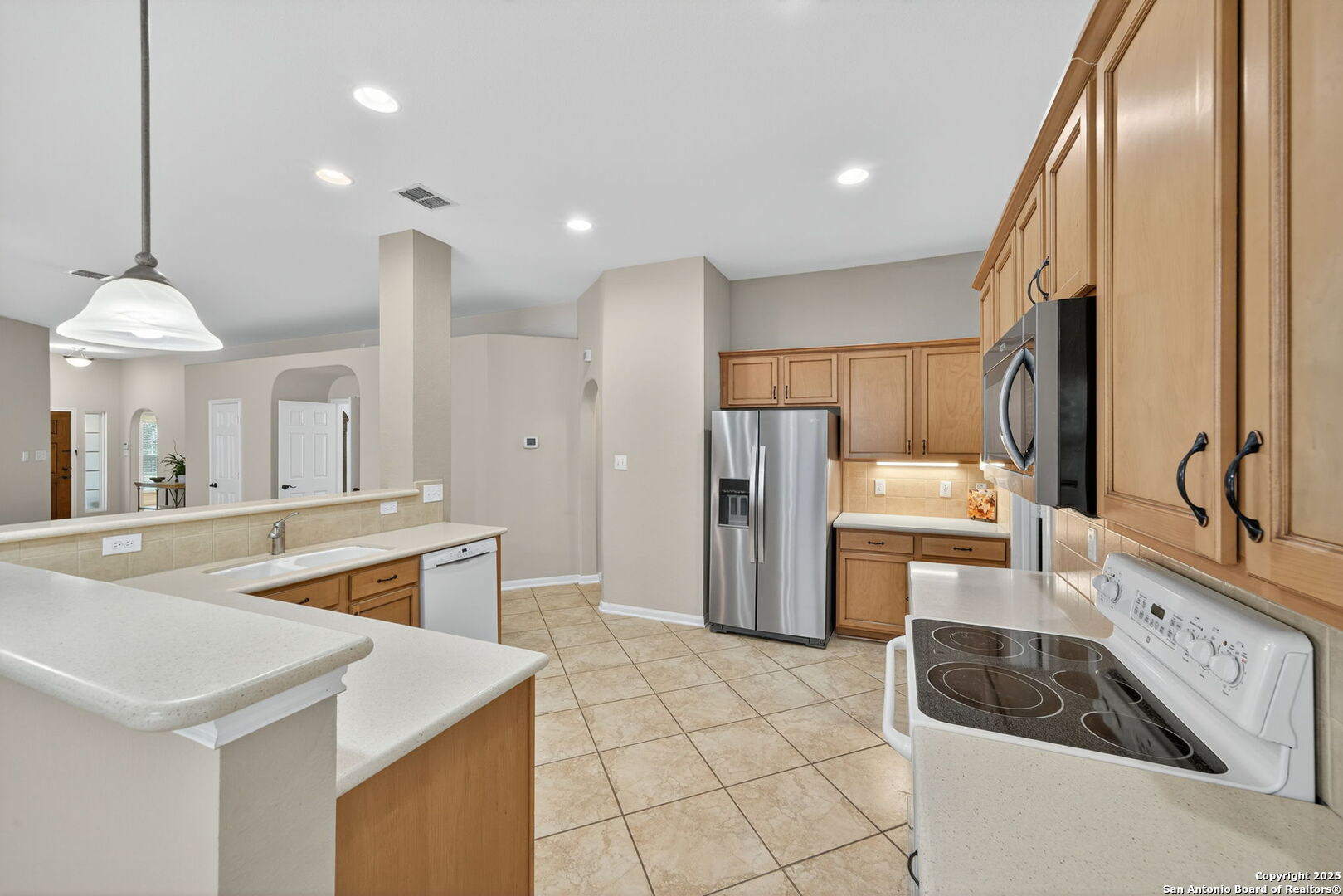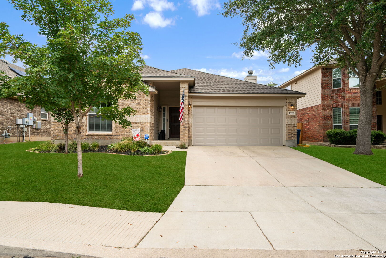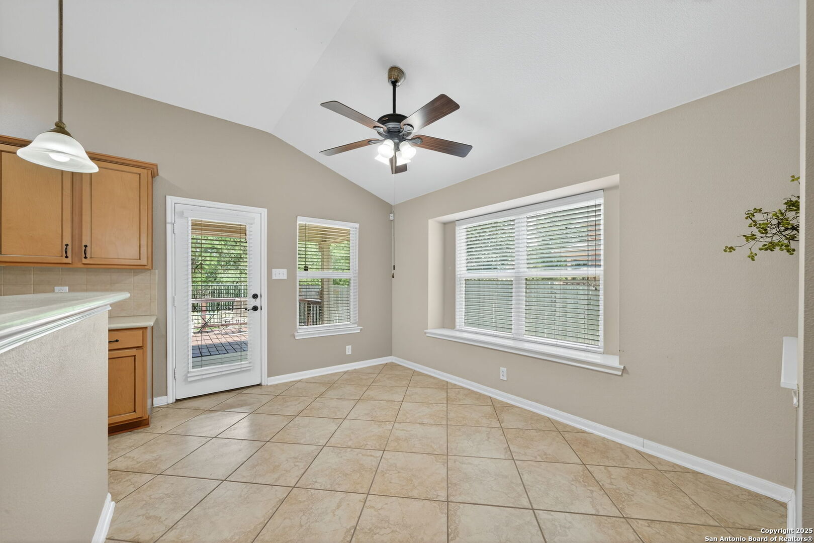 Coveted one story on a greenbelt! Birder's paradise. Watch the wildlife from your extended back deck or the shade of your covered patio. Charming Northside home is gracious and inviting, truly a winner with wood-look luxury vinyl flooring and 18" tile flooring. No carpet whatsoever. Possessing an ideal flow for entertaining, you'll enjoy a large kitchen with island, breakfast bar, and plenty of wonderful maple glazed cabinetry. Microwave (Dec 2024), Water heater (2019). With a 22X21 foot family room you and yours will never be cramped for space. A gas fireplace adds ambiance while high ceilings, natural lighting and a roomy study combine beautifully. Perfect for working from home or having a dedicated hobby room. The primary retreat is located at the back of the home overlooking an attractive arbor with flagstone walk and bench. Iron fencing overlooks the community walking trail beyond the fence. The spa-like primary bath includes double vanity, large walk in closet and separate/shower tub. Utility room /pantry is spacious as well with white pantry cabinets that convey. This is truly a winning plan. The backyard takes advantage of native flora with a xeroscape feel that includes river rock to simulate a hill country creekbed. New roof just installed 2025! Nest learning thermostat. Sprinkler System, water softener and Eufy doorbell round off the package. Fabulous location with highly desirable schools including Brandeis HS. The community offers a pavilion, park/playground and walking trail with exercise stations. Come Home!