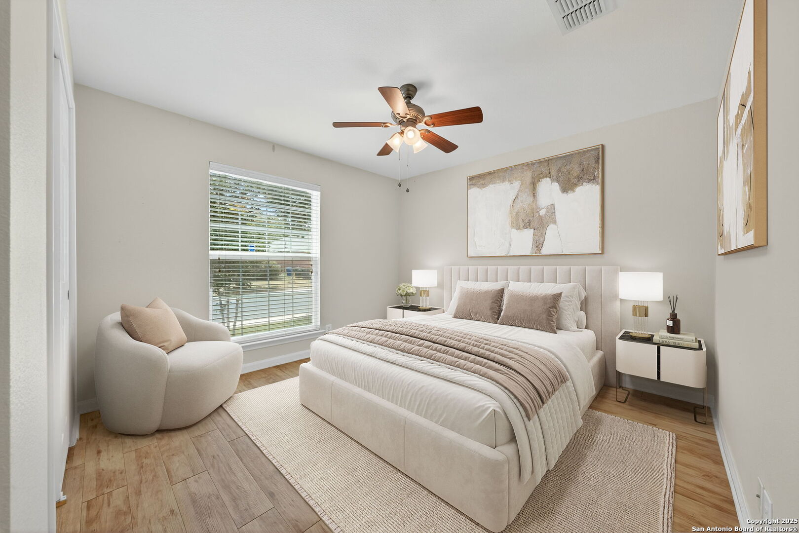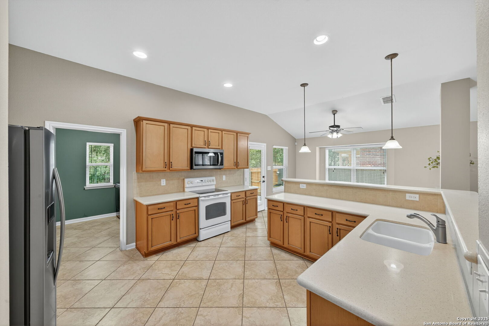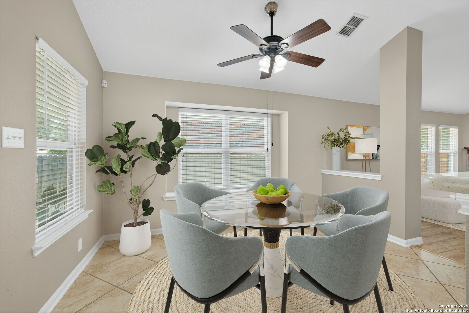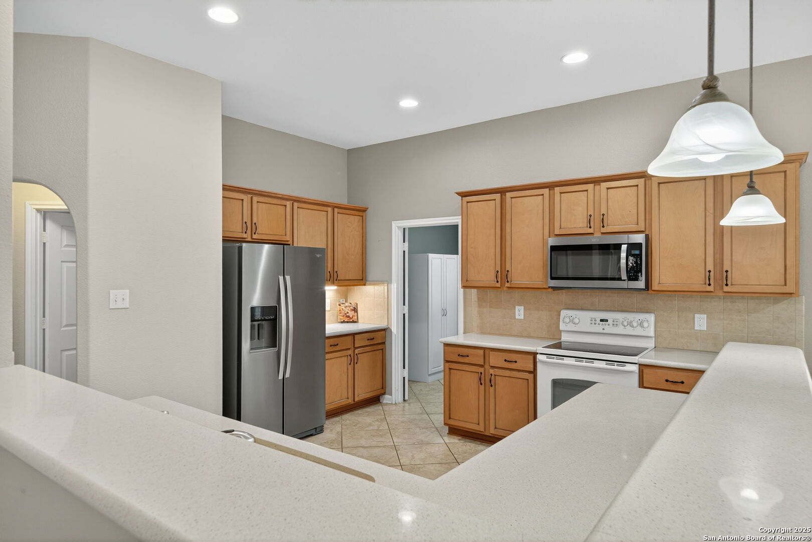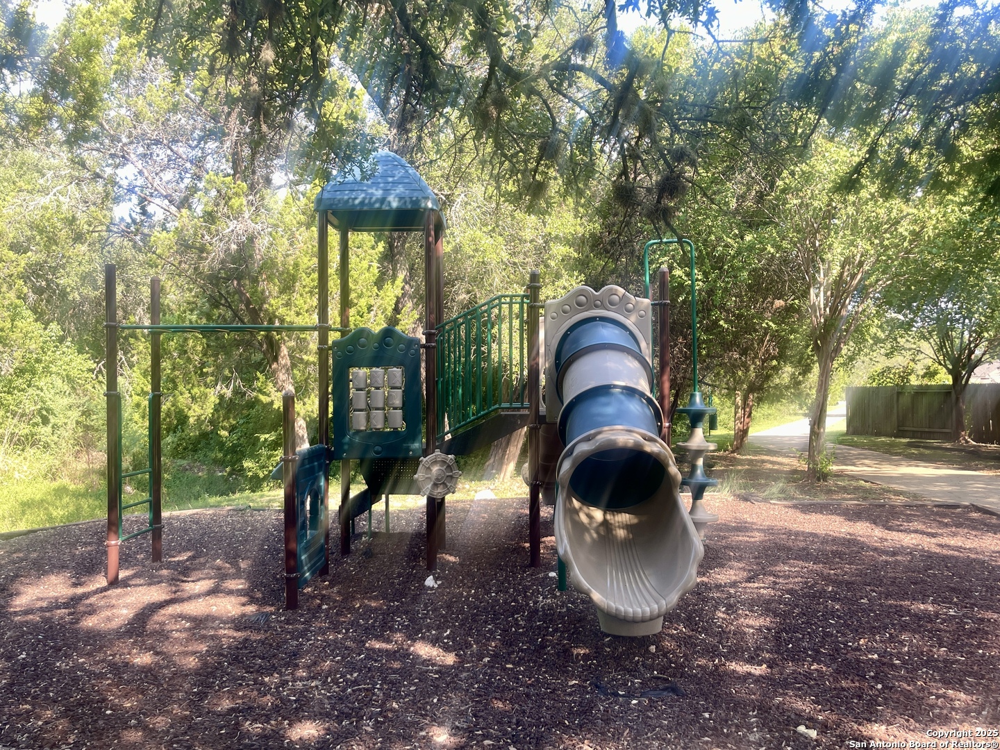 Coveted one story on a greenbelt! Birder's paradise. Watch the wildlife from your extended back deck or the shade of your covered patio. Charming Northside home is gracious and inviting, truly a winner with wood-look luxury vinyl flooring and 18" tile flooring. No carpet whatsoever. Possessing an ideal flow for entertaining, you'll enjoy a large kitchen with island, breakfast bar, and plenty of wonderful maple glazed cabinetry. Microwave (Dec 2024), Water heater (2019). With a 22X21 foot family room you and yours will never be cramped for space. A gas fireplace adds ambiance while high ceilings, natural lighting and a roomy study combine beautifully. Perfect for working from home or having a dedicated hobby room. The primary retreat is located at the back of the home overlooking an attractive arbor with flagstone walk and bench. Iron fencing overlooks the community walking trail beyond the fence. The spa-like primary bath includes double vanity, large walk in closet and separate/shower tub. Utility room /pantry is spacious as well with white pantry cabinets that convey. This is truly a winning plan. The backyard takes advantage of native flora with a xeroscape feel that includes river rock to simulate a hill country creekbed. New roof just installed 2025! Nest learning thermostat. Sprinkler System, water softener and Eufy doorbell round off the package. Fabulous location with highly desirable schools including Brandeis HS. The community offers a pavilion, park/playground and walking trail with exercise stations. Come Home!