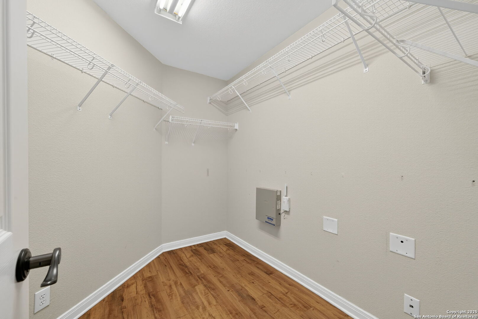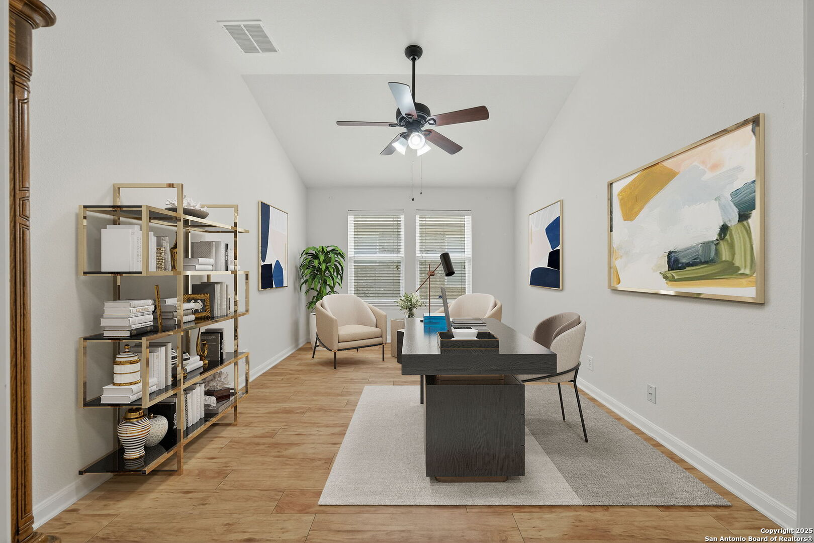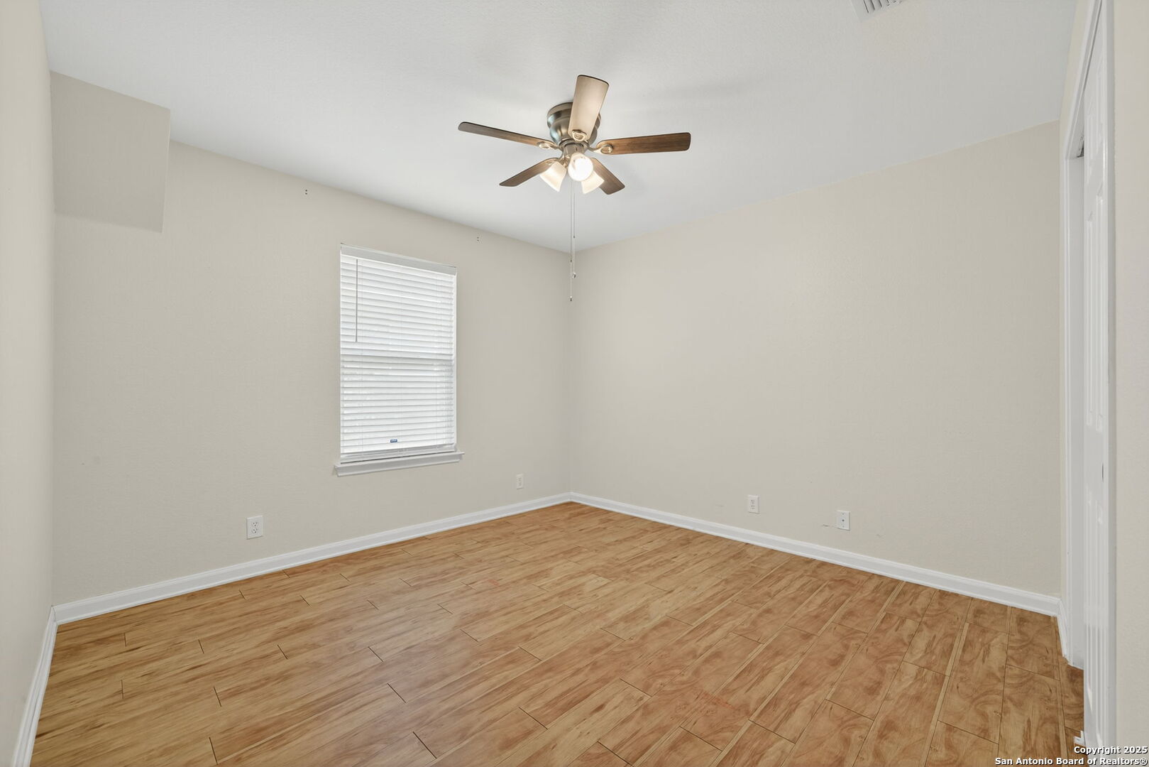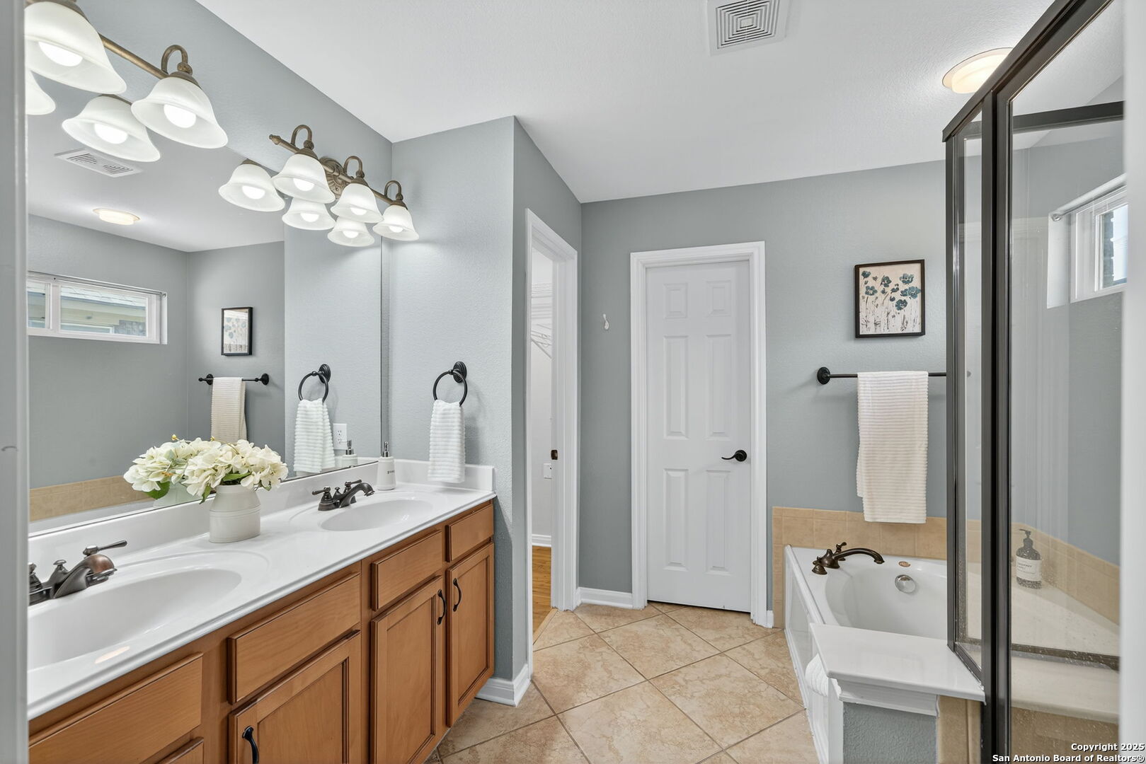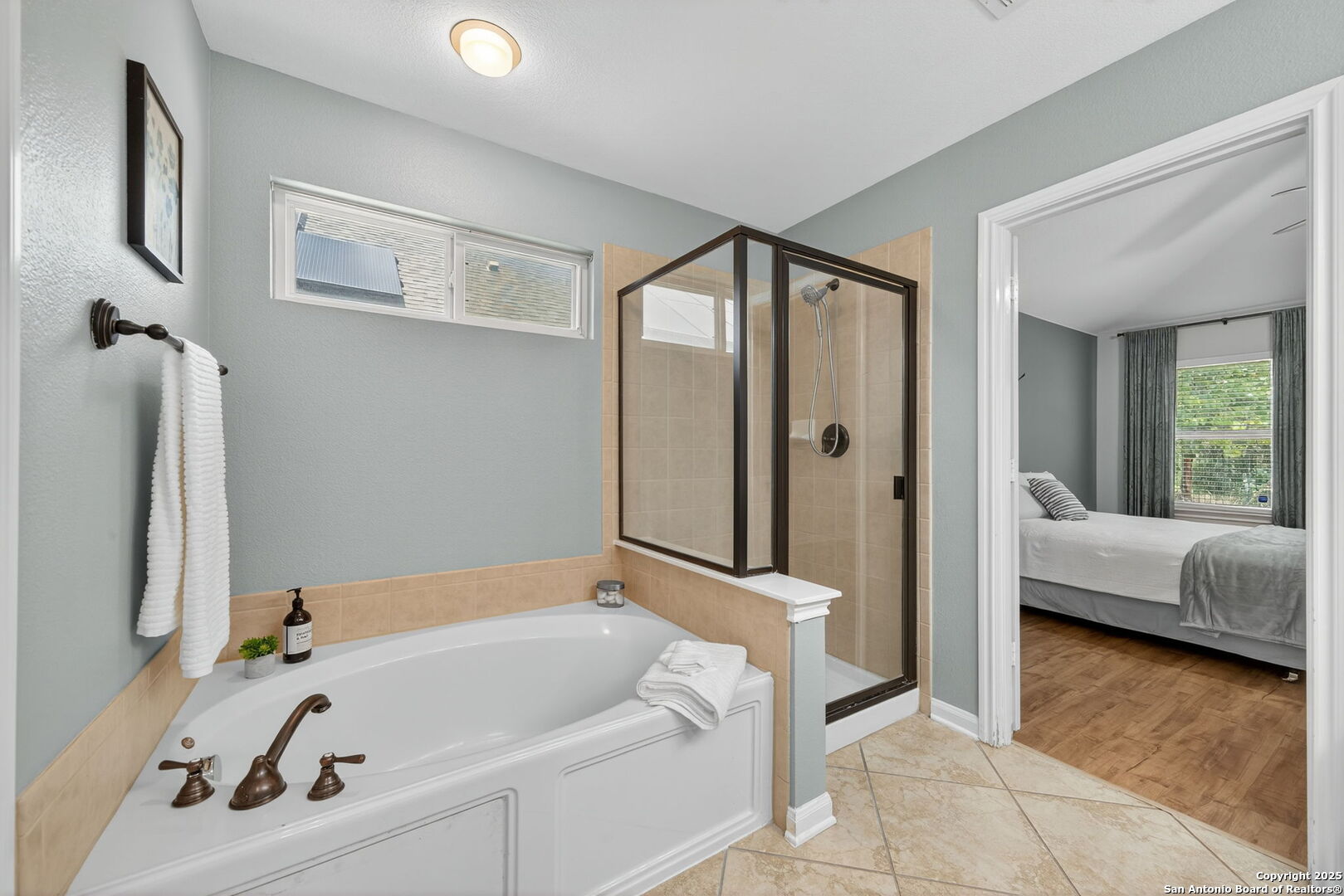Coveted one story on a greenbelt! Birder's paradise. Watch the wildlife from your extended back deck or the shade of your covered patio. Charming Northside home is gracious and inviting, truly a winner with wood-look luxury vinyl flooring and 18" tile flooring. No carpet whatsoever. Possessing an ideal flow for entertaining, you'll enjoy a large kitchen with island, breakfast bar, and plenty of wonderful maple glazed cabinetry. Microwave (Dec 2024), Water heater (2019). With a 22X21 foot family room you and yours will never be cramped for space. A gas fireplace adds ambiance while high ceilings, natural lighting and a roomy study combine beautifully. Perfect for working from home or having a dedicated hobby room. The primary retreat is located at the back of the home overlooking an attractive arbor with flagstone walk and bench. Iron fencing overlooks the community walking trail beyond the fence. The spa-like primary bath includes double vanity, large walk in closet and separate/shower tub. Utility room /pantry is spacious as well with white pantry cabinets that convey. This is truly a winning plan. The backyard takes advantage of native flora with a xeroscape feel that includes river rock to simulate a hill country creekbed. New roof just installed 2025! Nest learning thermostat. Sprinkler System, water softener and Eufy doorbell round off the package. Fabulous location with highly desirable schools including Brandeis HS. The community offers a pavilion, park/playground and walking trail with exercise stations. Come Home!