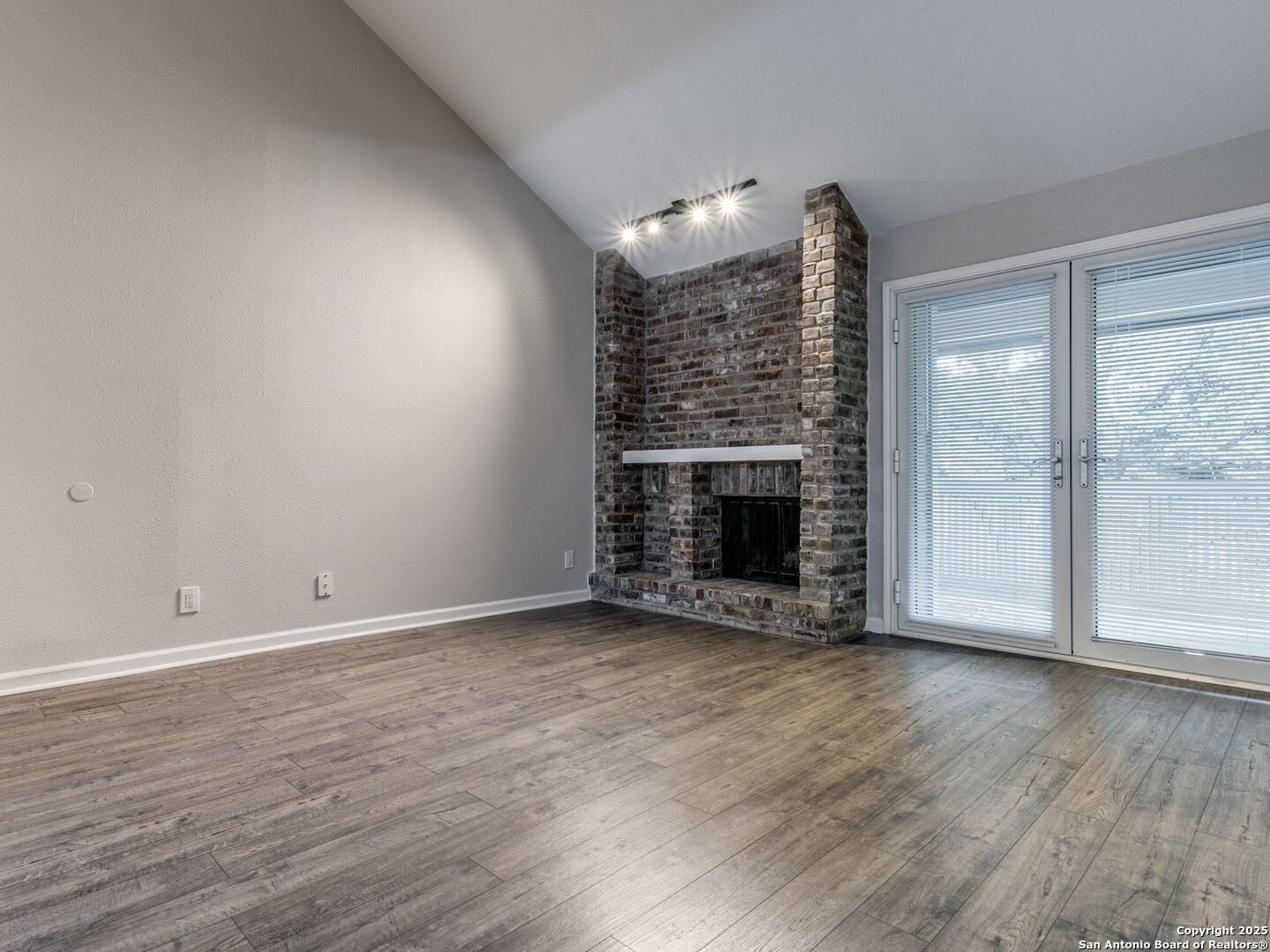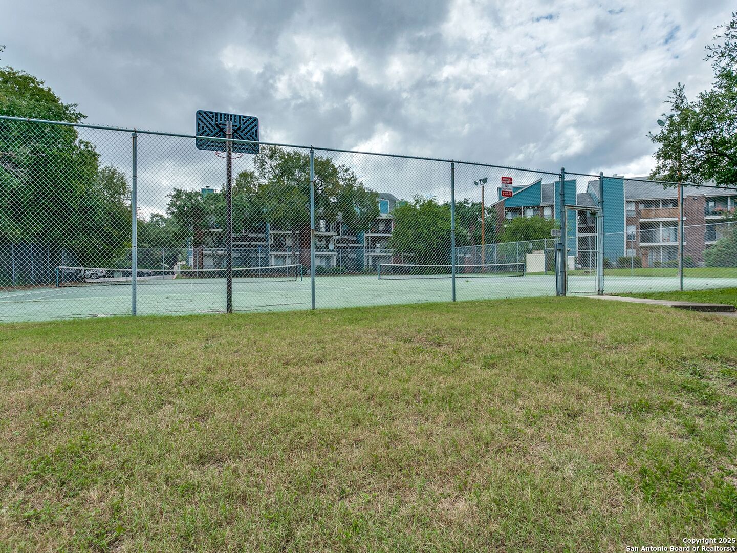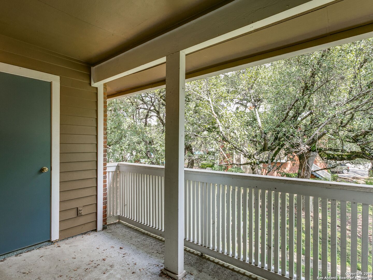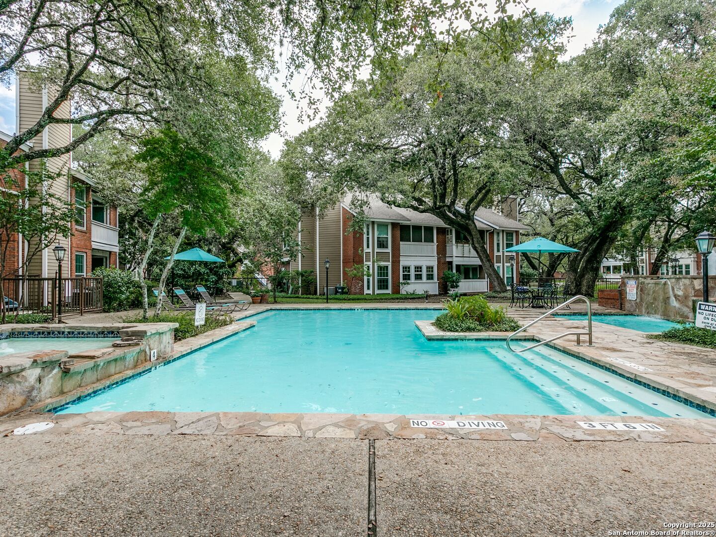 This beautifully updated condominium in the sought--after Chesapeake Condo gated community is a true gem. Recently upgraded with a new HVAC system, washer, dryer, and storm doors (all purchased in May 2022), this 1-bedroom, 1-bath home offers modern comfort and style. The interior features sleek quartz countertops in the kitchen and bathroom, a contemporary vanity with a stylish mirror, a modern sink, and updated light fixtures. The bathroom is enhanced with modern tile surrounds and a bathtub. In the master bedrooms, a brushed nickel ceiling fan with a light fixture adds elegance, while the living and kitchen areas benefit from modern track lighting. Additional updated light fixtures are found in the laundry area and master closet. The living room boasts high ceilings and an impressive brick wood-burning fireplace. Both the living room and master bedroom open through double patio doors onto a covered patio with a scenic view of lush, oak studded green area. The doors and windows throughout the home have been replaces with acoustically treated options for enhanced tranquility. The community offers a pristine pool with an adjoining spa, a water feature, and a patio area with ample seating and beautiful landscaping. The adjacent clubhouse, featuring a gran fireplace, provides ample space for gatherings. Mature oak trees throughout the community offer privacy and serenity, and residents have direct access to the Salado Creek Greenway for walking or jogging, leading to Hardberger Park.