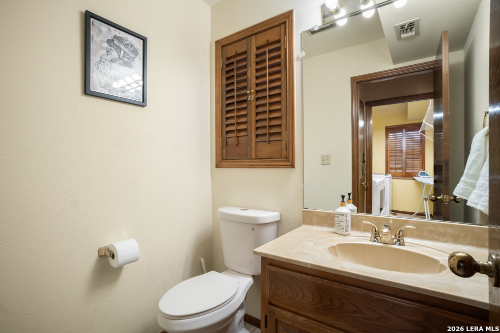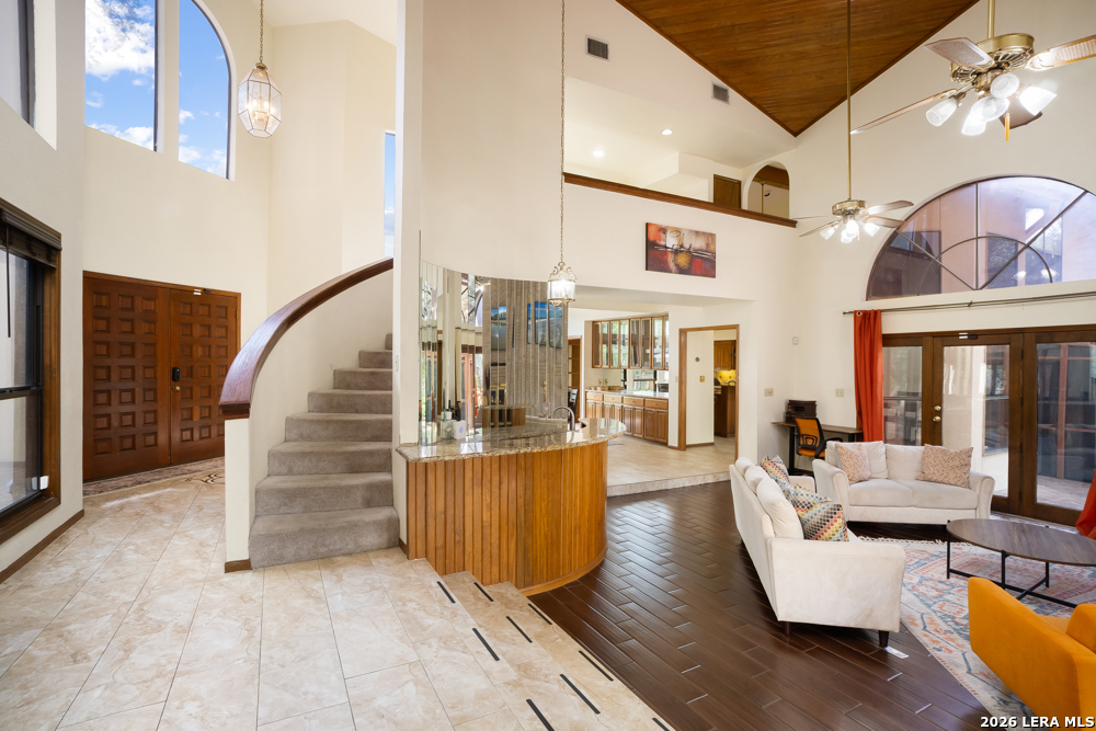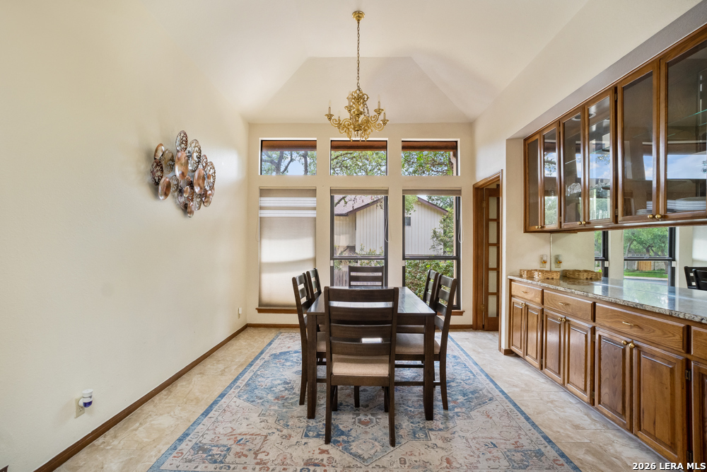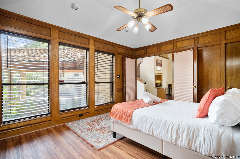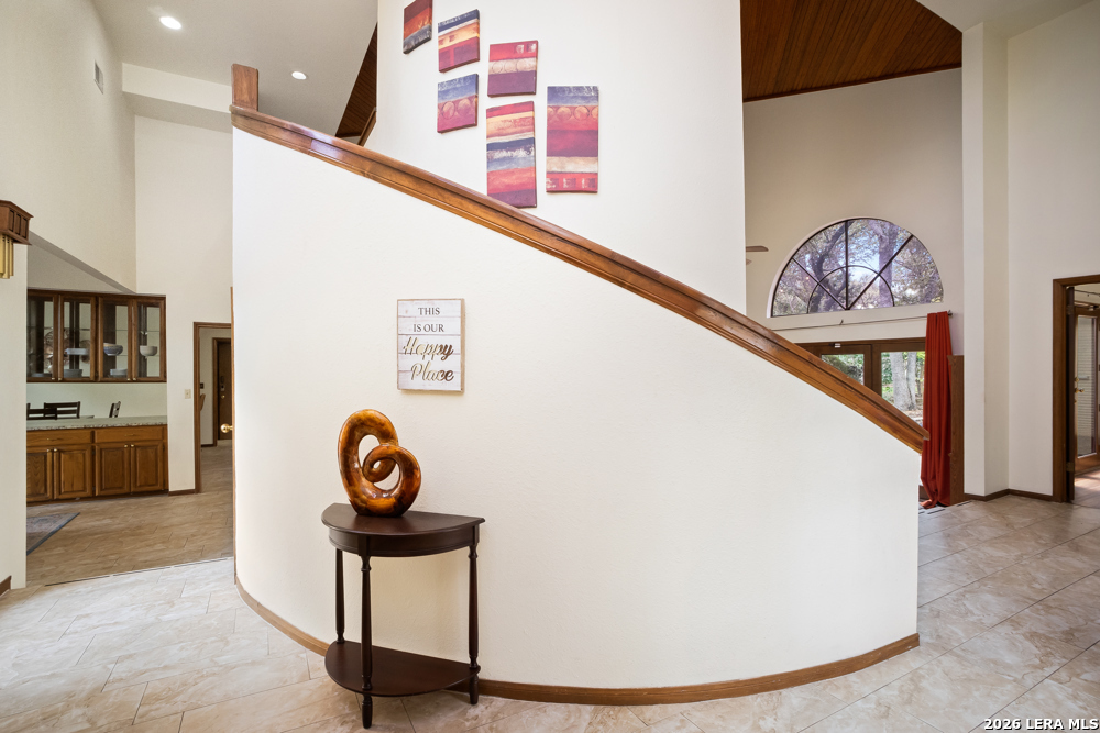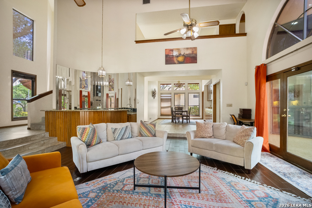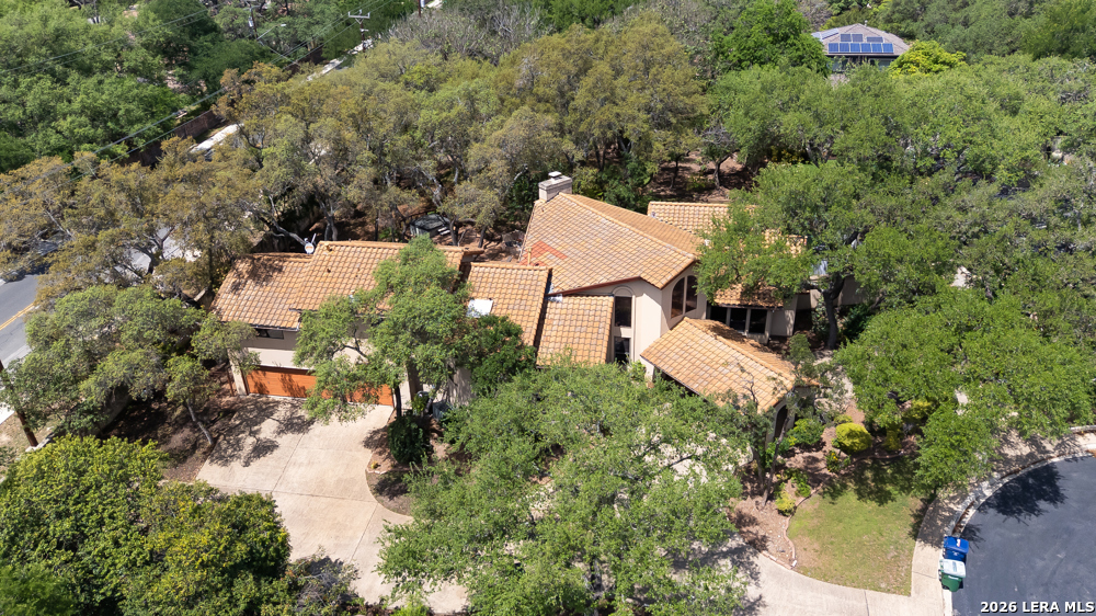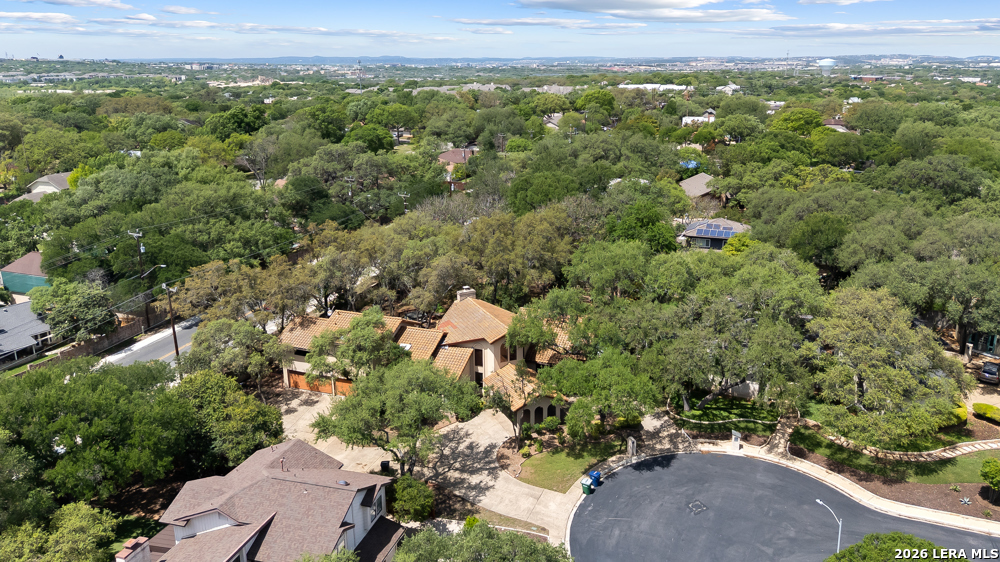 Nestled in the desirable Hunters Creek neighborhood, this home offers access to highly regarded NEISD schools and a prime location near major highways for easy commuting. Enjoy close proximity to shopping, dining, The Rim, La Cantera, North Star Mall, USAA, UTSA, the Medical Center, and easy access to downtown. This stunning Mediterranean-style stucco home with a tile roof sits on a partial cul-de-sac and features a beautiful oak-studded lot of over half an acre. Mature trees and a hot tub create a peaceful outdoor setting, enhanced by both open and covered Saltillo tile patios-perfect for relaxing and taking in the views. Inside, the home is filled with natural light and showcases a built-in bar area, buffet and china cabinet, soaring ceilings, a fireplace, and unique architecture. Additional highlights include large kitchen with granite, ample cabinets and a Sub-Zero refrigerator. The spacious primary suite features a garden tub overlooking a private patio. A secondary oak-paneled room offers versatility as a second primary suite, office, or fitness space. Upstairs, three bedrooms provide breathtaking backyard views. The property also includes a three-car garage, with one bay converted into additional living space. The neighborhood also offers a non-mandatory HOA with optional membership to the neighborhood association and Racquet and Swim Club. So much more! Make this beautiful home yours!
