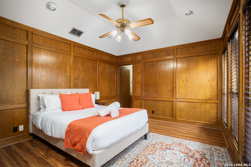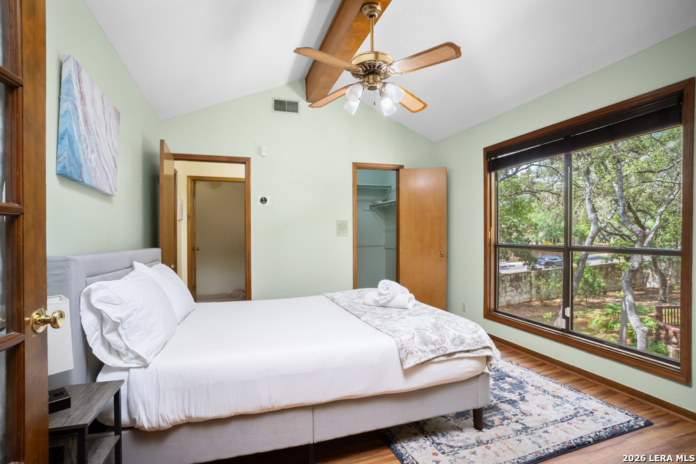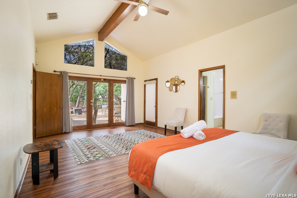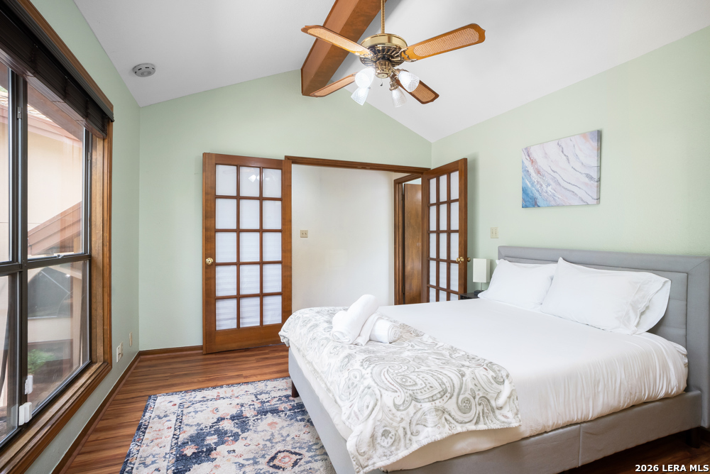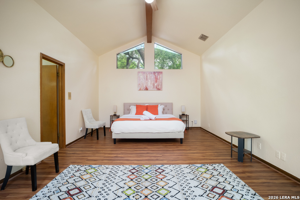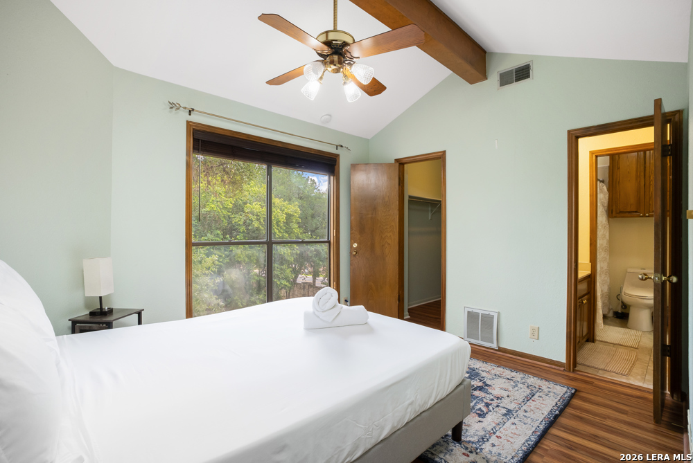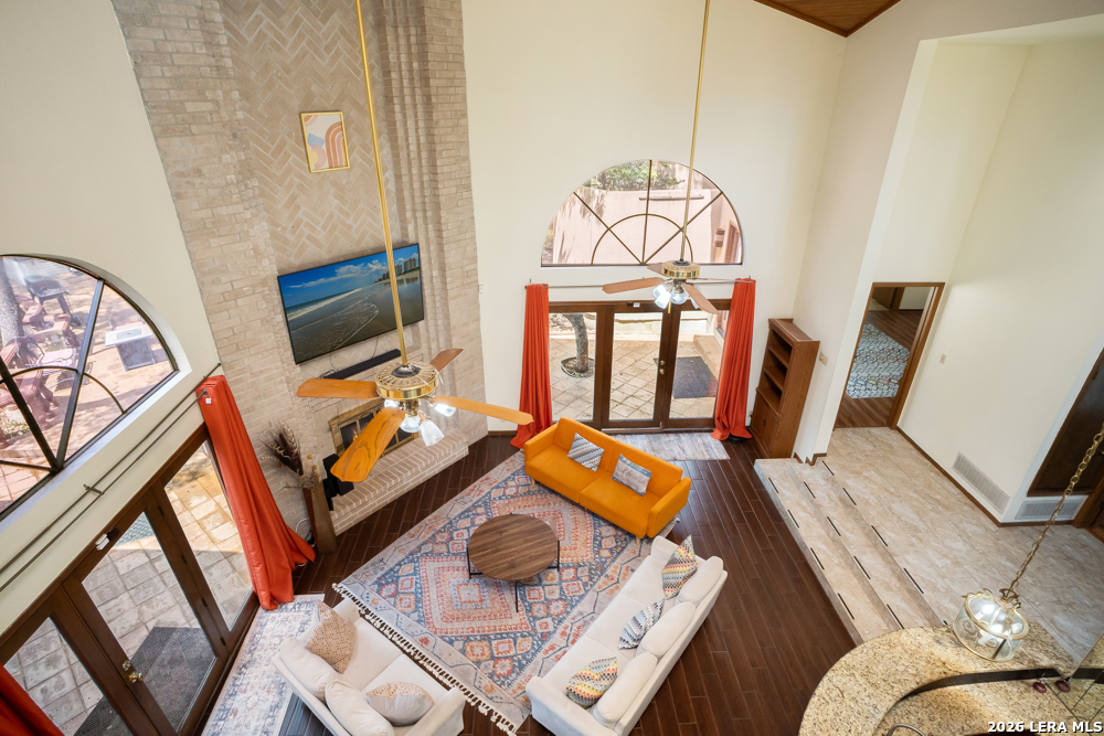Nestled in the desirable Hunters Creek neighborhood, this home offers access to highly regarded NEISD schools and a prime location near major highways for easy commuting. Enjoy close proximity to shopping, dining, The Rim, La Cantera, North Star Mall, USAA, UTSA, the Medical Center, and easy access to downtown. This stunning Mediterranean-style stucco home with a tile roof sits on a partial cul-de-sac and features a beautiful oak-studded lot of over half an acre. Mature trees and a hot tub create a peaceful outdoor setting, enhanced by both open and covered Saltillo tile patios-perfect for relaxing and taking in the views. Inside, the home is filled with natural light and showcases a built-in bar area, buffet and china cabinet, soaring ceilings, a fireplace, and unique architecture. Additional highlights include large kitchen with granite, ample cabinets and a Sub-Zero refrigerator. The spacious primary suite features a garden tub overlooking a private patio. A secondary oak-paneled room offers versatility as a second primary suite, office, or fitness space. Upstairs, three bedrooms provide breathtaking backyard views. The property also includes a three-car garage, with one bay converted into additional living space. The neighborhood also offers a non-mandatory HOA with optional membership to the neighborhood association and Racquet and Swim Club. So much more! Make this beautiful home yours!