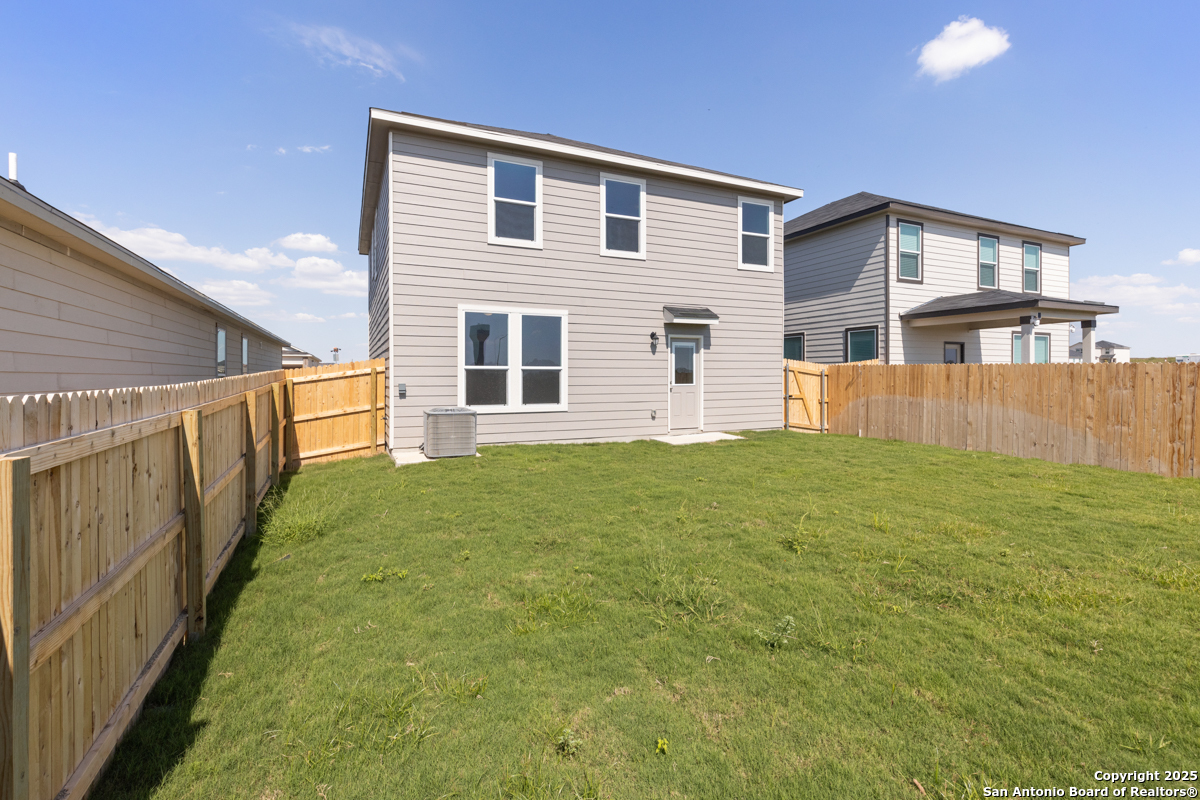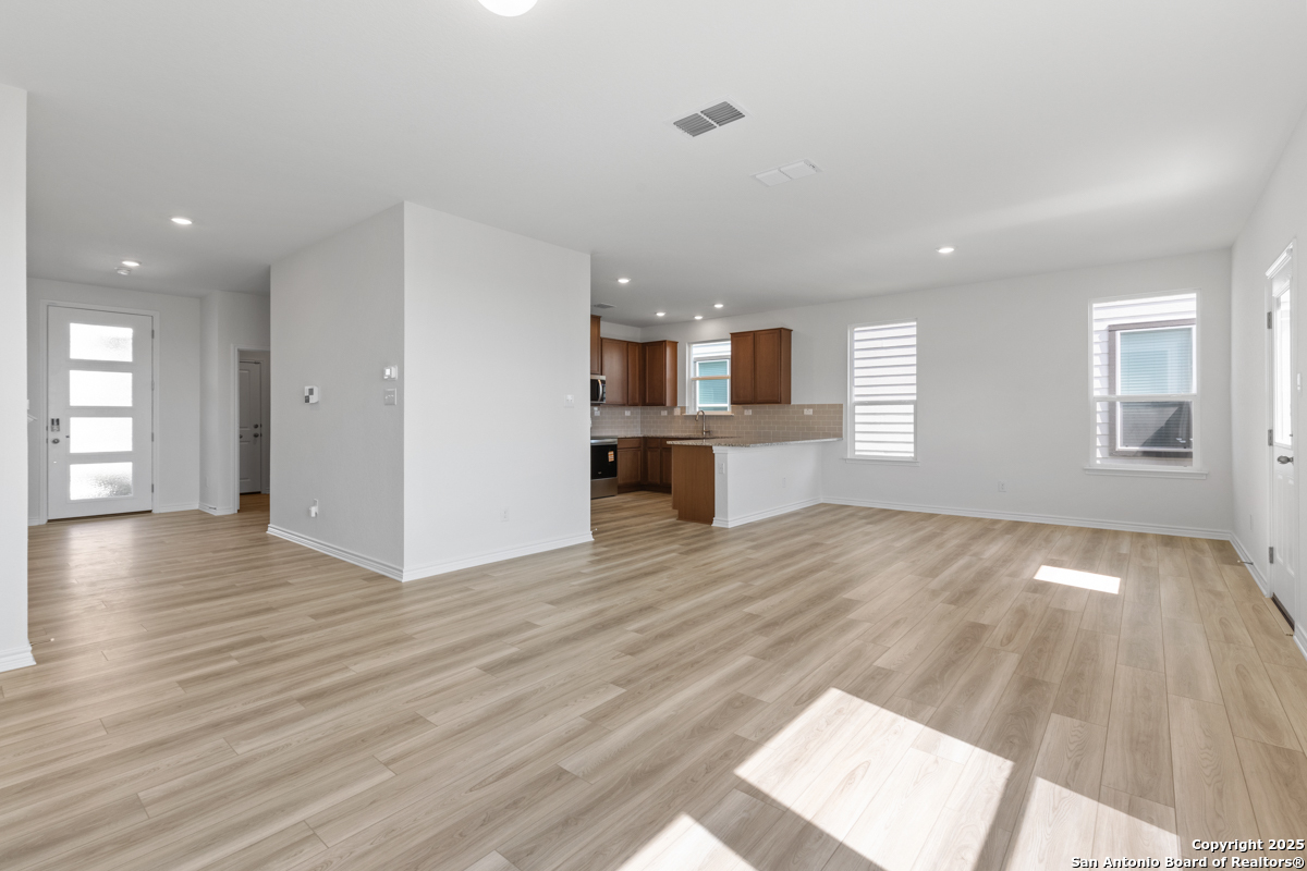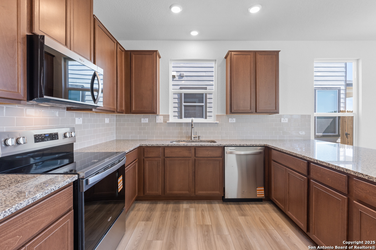 Enjoy stylish living in this thoughtfully designed home featuring 9-ft. first-floor ceilings and a versatile den with double doors. The kitchen shines with Whirlpool stainless steel appliances, Woodmont Cody 42-in. upper cabinets, a Daltile tile backsplash, granite countertops in Barcelona, and an extended breakfast bar. The primary bath offers a raised vanity, upgraded cabinets, and a 42-in. garden tub/shower with Daltile tile surround. Decorative touches include a 4-lite Continental entry door, Kwikset Polo interior knobs, and vinyl plank flooring in the bathrooms, kitchen, and great room. Additional features include a wireless security system, automatic sprinkler system, and a fully sodded yard.
