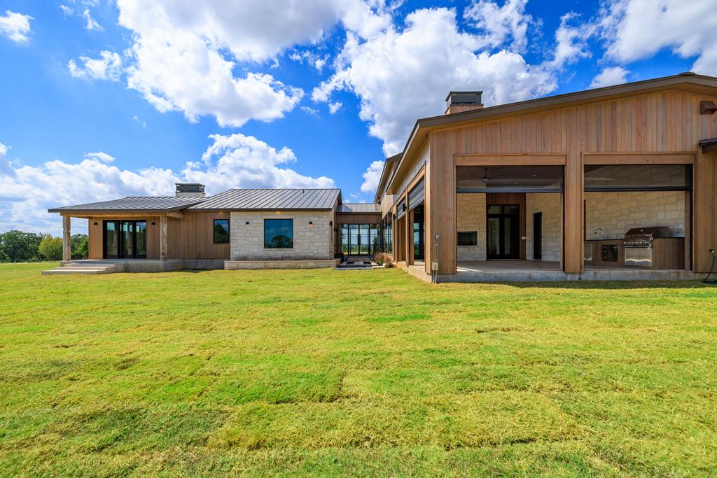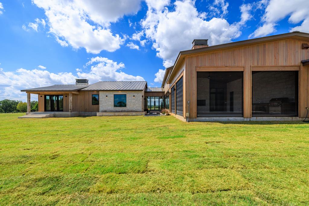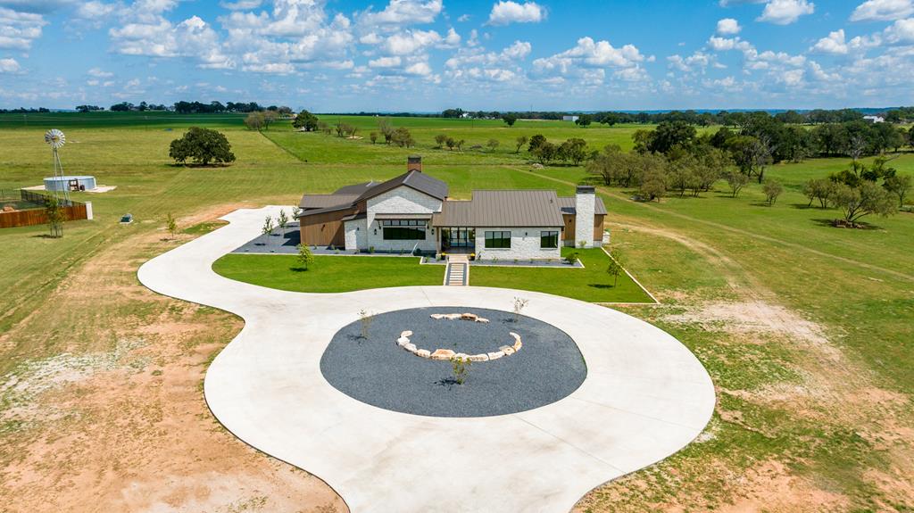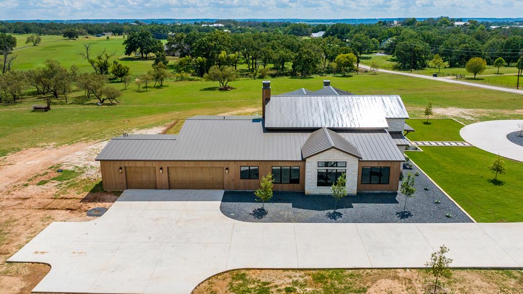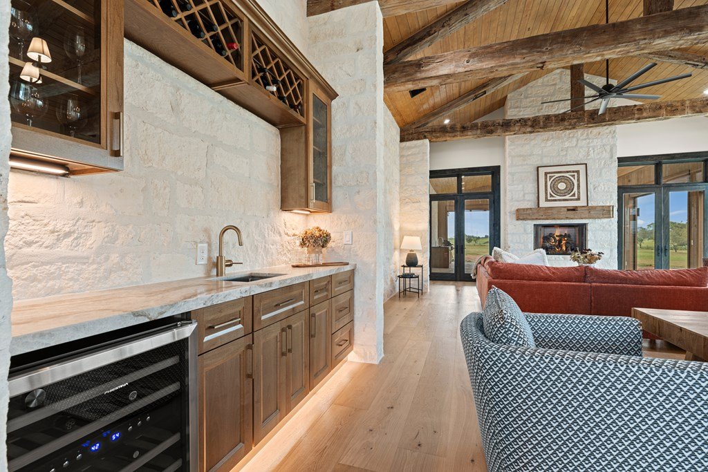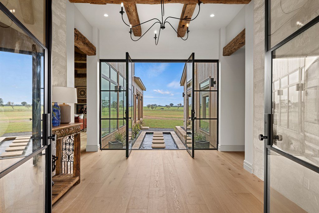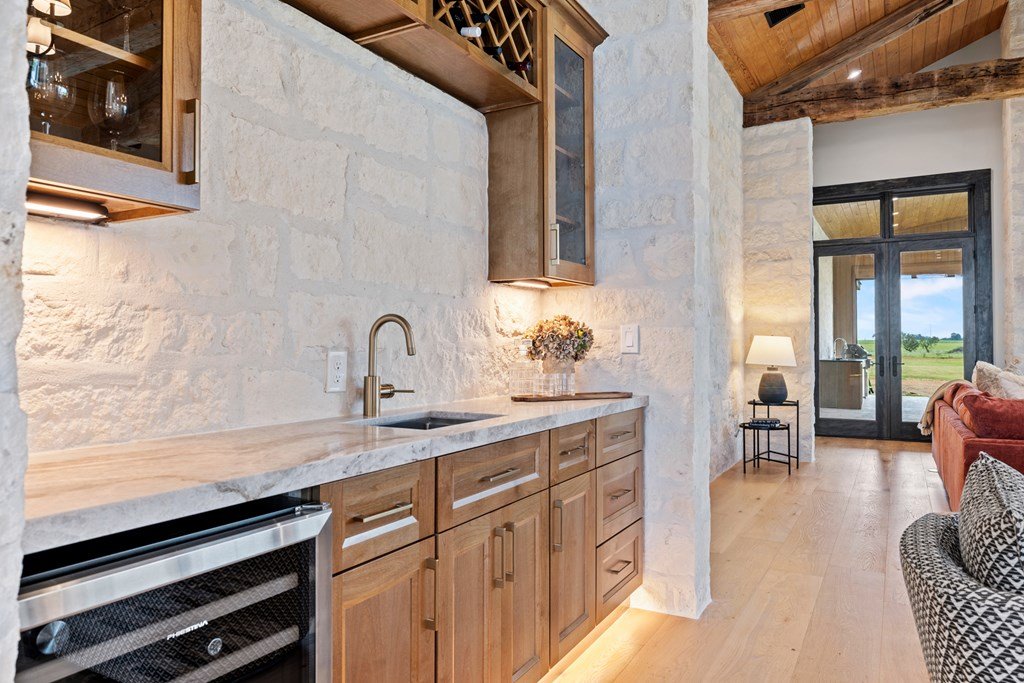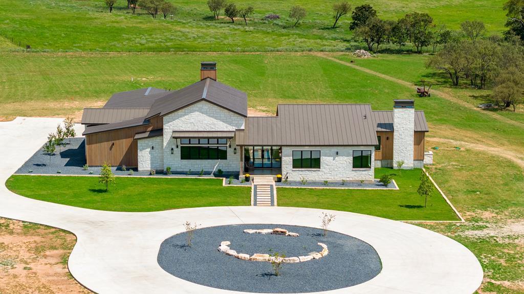 Rare Gem in Fredericksburg. Nestled just 1.5 miles from the vibrant heart of Main Street and outside the city limits, this extraordinary property offers a unique blend of luxury and ranch-style living, with no HOA restrictions, short-term rentals allowed, and additional structures permitted. 4854 SF, set on 3.54 ag-exempt acres, this home boasts serene views of a neighboring cattle farm and is perfectly positioned to enjoy the Southeast breeze from a spacious 24 x 30 motorized screened patio. Thoughtfully designed to complement its lot, this home showcases nearly every luxury you could imagine. Step into a grand double entry foyer leading to an open, light-filled space with features that include 10" French oak flooring, floor to ceiling limestone walls and 200 year old hand-hewn beams. A chef's dream kitchen with limestone floors, cabinet-panel Bosch appliances, double dishwashers, an Italian stove range, honed quartzite countertops - backsplash, toe kick and under-counter lighting, alongside a stylish wine bar for all your Fredericksburg favorites. Wood and stone accents, a butler's pantry, designer-tiled bathrooms, and versatile rooms.