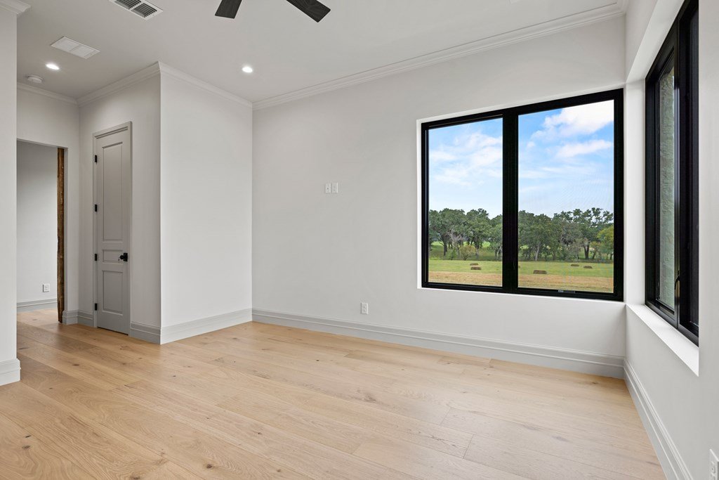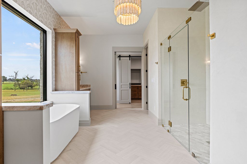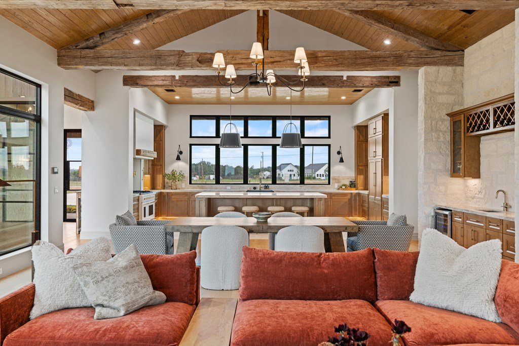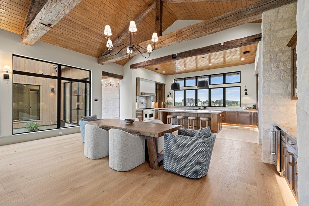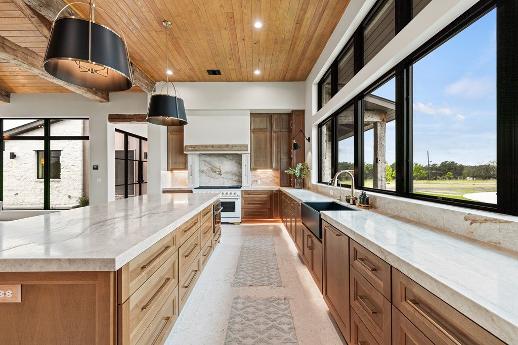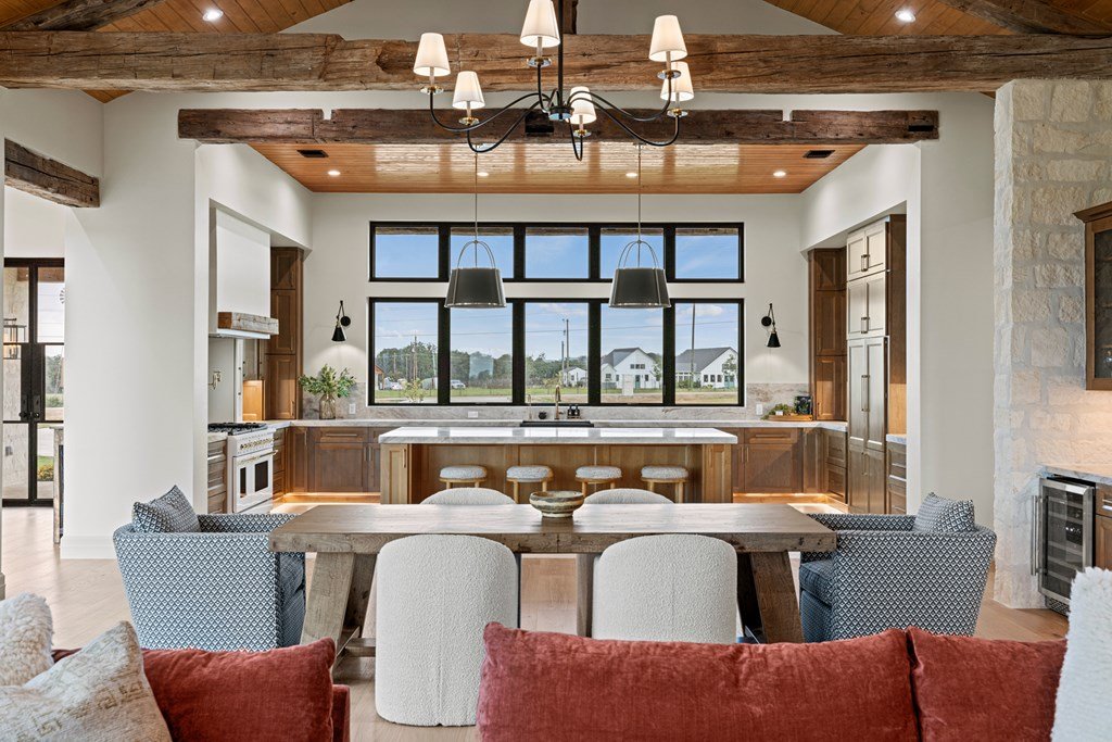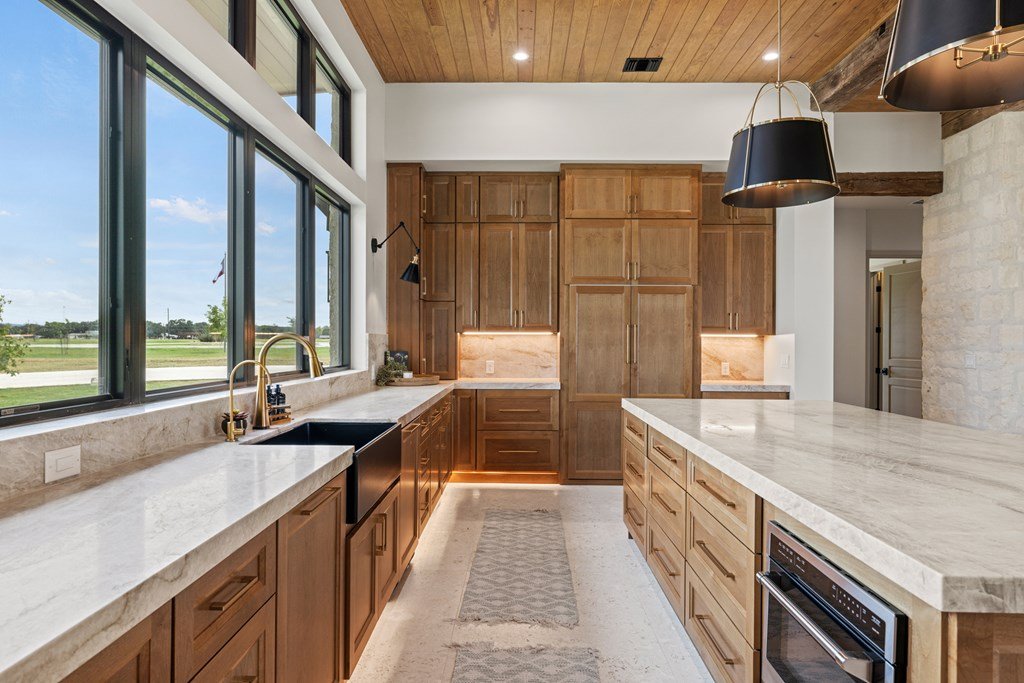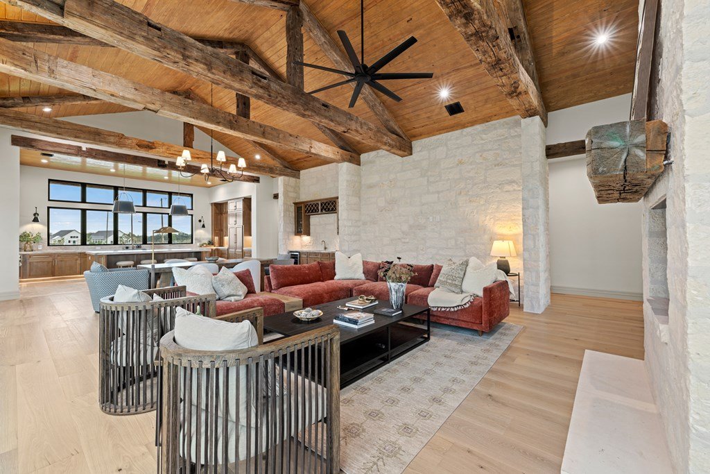 Rare Gem in Fredericksburg. Nestled just 1.5 miles from the vibrant heart of Main Street and outside the city limits, this extraordinary property offers a unique blend of luxury and ranch-style living, with no HOA restrictions, short-term rentals allowed, and additional structures permitted. 4854 SF, set on 3.54 ag-exempt acres, this home boasts serene views of a neighboring cattle farm and is perfectly positioned to enjoy the Southeast breeze from a spacious 24 x 30 motorized screened patio. Thoughtfully designed to complement its lot, this home showcases nearly every luxury you could imagine. Step into a grand double entry foyer leading to an open, light-filled space with features that include 10" French oak flooring, floor to ceiling limestone walls and 200 year old hand-hewn beams. A chef's dream kitchen with limestone floors, cabinet-panel Bosch appliances, double dishwashers, an Italian stove range, honed quartzite countertops - backsplash, toe kick and under-counter lighting, alongside a stylish wine bar for all your Fredericksburg favorites. Wood and stone accents, a butler's pantry, designer-tiled bathrooms, and versatile rooms.
