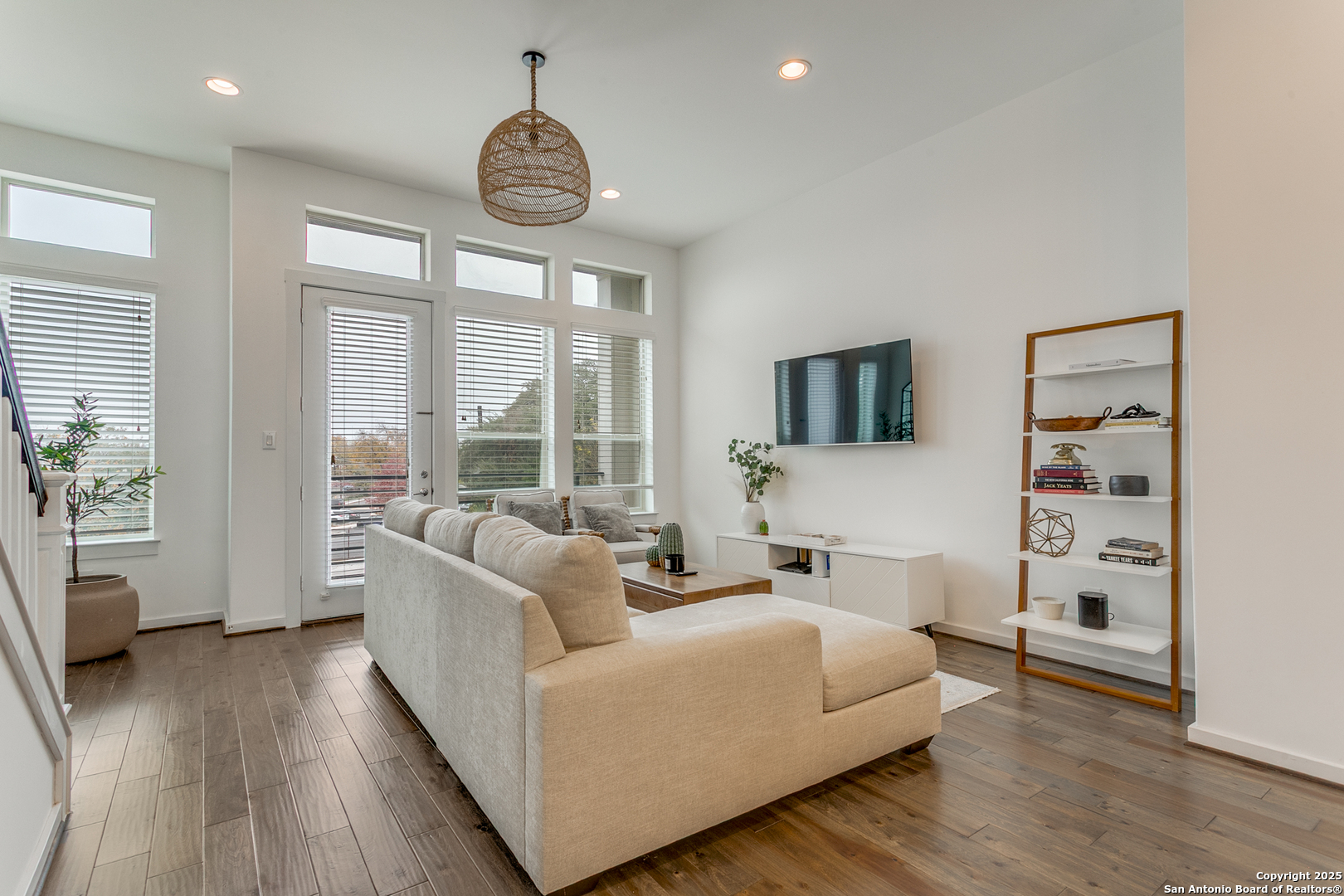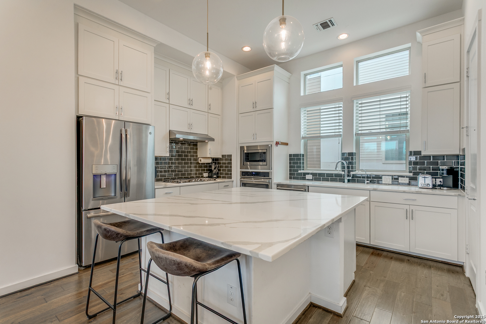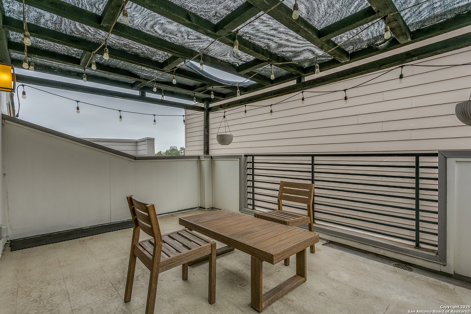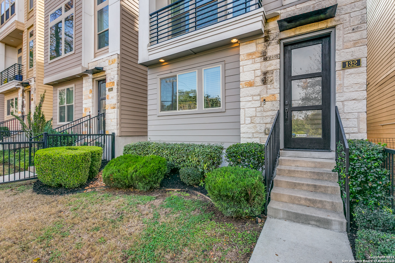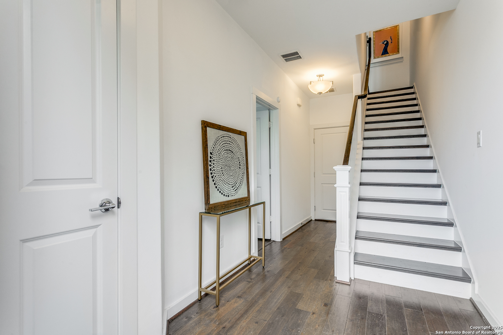 This 3 bedroom energy efficient home with 3 and a half baths was built in 2017 and is located within walking distance of The Doseum, Breckenridge Park and the San Antonio Zoo. As you approach the residence, you immediately notice the curb appeal of the manicured lawns that are maintained by the HOA as well as the modern design and inviting 8 foot front entry door. You enter to gorgeous hardwood floors leading to the first floor bedroom with walk in closet, ceiling fan, 2" faux wood blinds and full on-suite bath. You head up stairs to the open main living space with high ceilings, natural light, smooth texture walls and neutral paint and more hardwood floors. The gourmet island kitchen boasts abundant white cabinets, 5 burner gas cooking, matching GE Cafe Stainless Steel Appliances including the refrigerator that conveys, upgraded granite countertops, subway tile backsplash, breakfast bar filtered drinking water at the double undercount sink and corner pantry. Just off the large living room is your private balcony with views. There's also a well appointed half bath for entertaining guests. The third level features two more bedrooms including the spacious master suite with tray ceiling, and spa like bath boasting ceramic tile floors, super mud set shower with dual Moen fixtures and frameless glass. There are dual vanities, granite counters, all chrome fixtures, trimmed vanity mirror, linen closet and ample walk in closet with built ins. The third bedroom also features walk in-closet, ceiling fan and full bath. The utility room is conveniently located just off the master and includes matching GE washer and dryer. The fourth level features a 7x6 flex or storage space as well as access to the private shaded rooftop terrace with gas stub out and more views. The energy efficient David Weekley home also includes radiant barrier, cellulose insulation and high-efficiency Trane HVAC system. Finally, there's a rear entry 2 car garage with built in storage, wifi enabled sprinkler system, eco water systems water softener, EV charger and tankless gas water heater. Come enjoy city living in 78209 with easy access to all this great city has to offer.