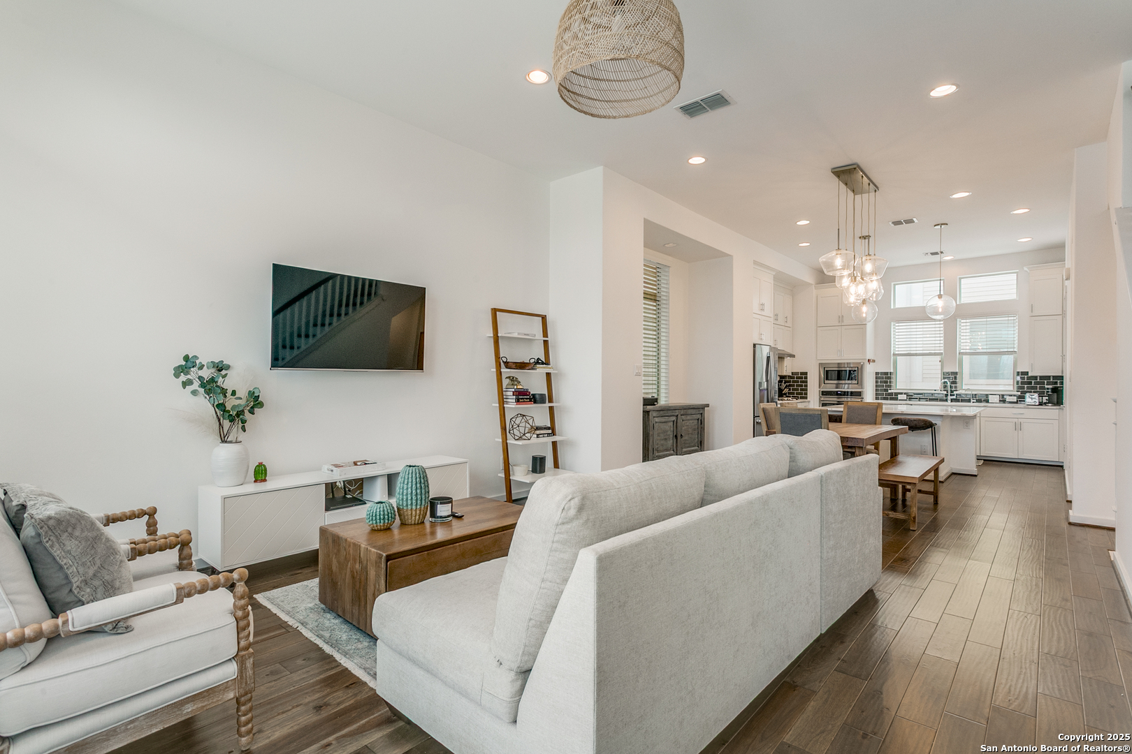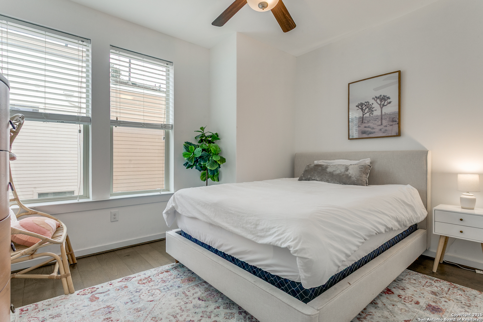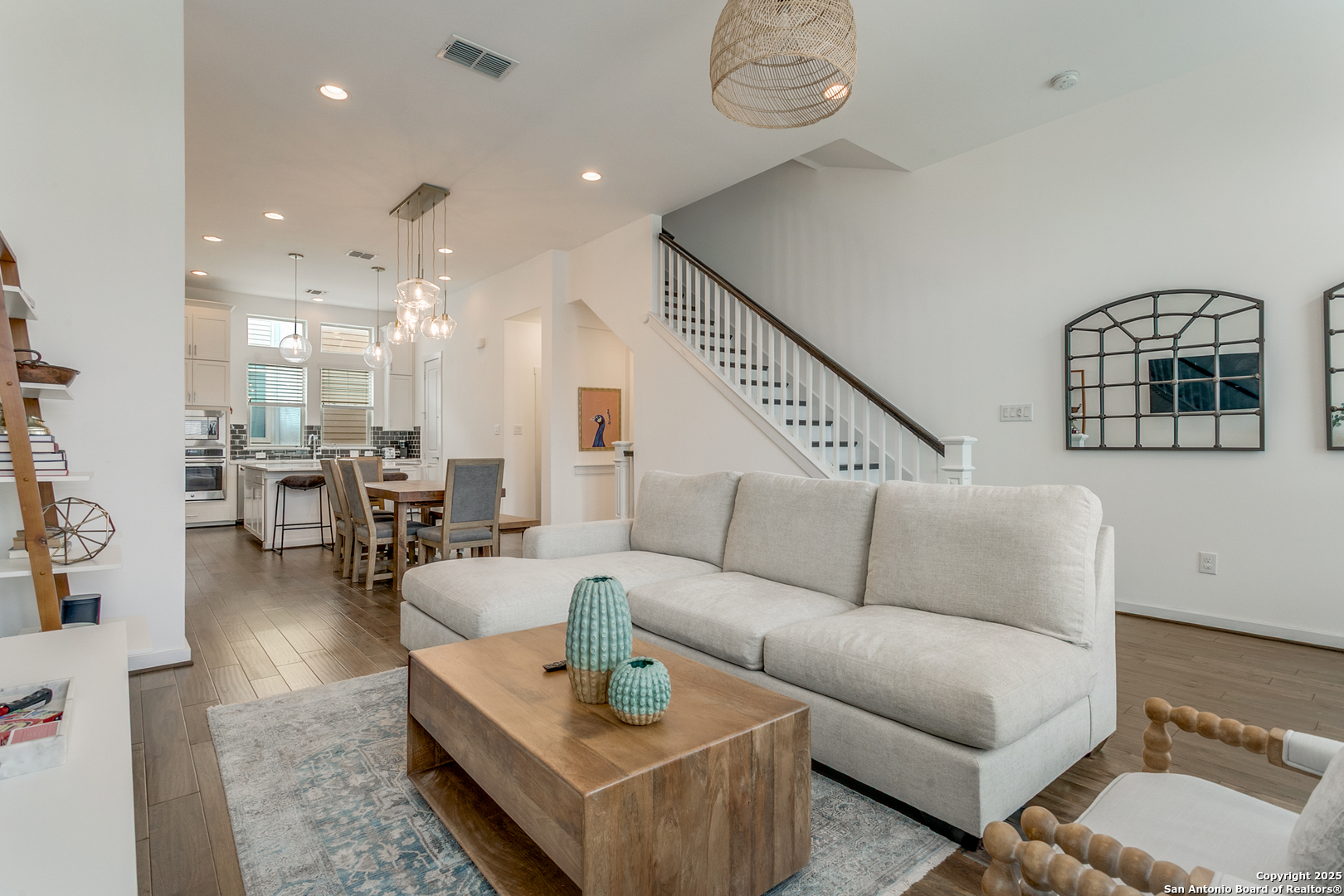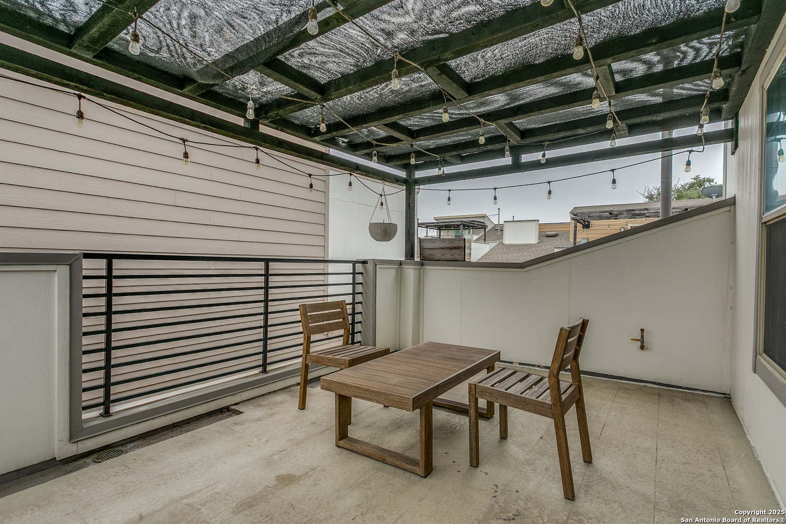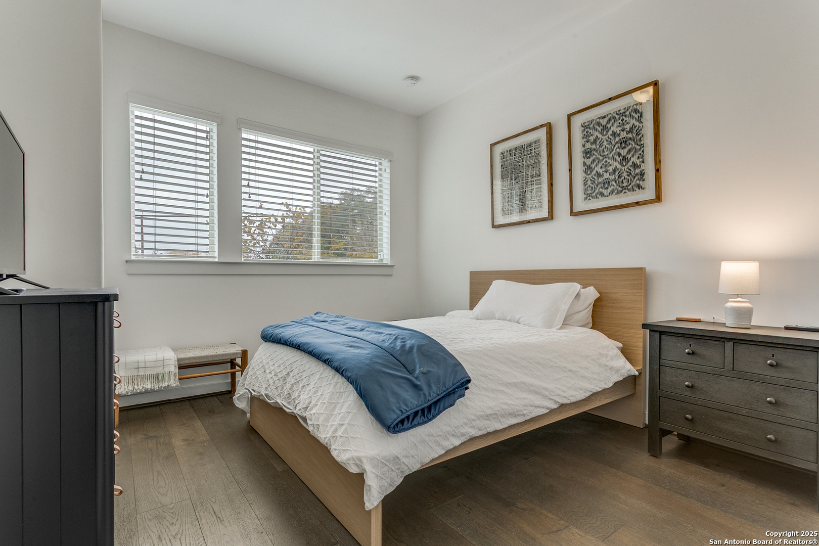 This 3 bedroom energy efficient home with 3 and a half baths was built in 2017 and is located within walking distance of The Doseum, Breckenridge Park and the San Antonio Zoo. As you approach the residence, you immediately notice the curb appeal of the manicured lawns that are maintained by the HOA as well as the modern design and inviting 8 foot front entry door. You enter to gorgeous hardwood floors leading to the first floor bedroom with walk in closet, ceiling fan, 2" faux wood blinds and full on-suite bath. You head up stairs to the open main living space with high ceilings, natural light, smooth texture walls and neutral paint and more hardwood floors. The gourmet island kitchen boasts abundant white cabinets, 5 burner gas cooking, matching GE Cafe Stainless Steel Appliances including the refrigerator that conveys, upgraded granite countertops, subway tile backsplash, breakfast bar filtered drinking water at the double undercount sink and corner pantry. Just off the large living room is your private balcony with views. There's also a well appointed half bath for entertaining guests. The third level features two more bedrooms including the spacious master suite with tray ceiling, and spa like bath boasting ceramic tile floors, super mud set shower with dual Moen fixtures and frameless glass. There are dual vanities, granite counters, all chrome fixtures, trimmed vanity mirror, linen closet and ample walk in closet with built ins. The third bedroom also features walk in-closet, ceiling fan and full bath. The utility room is conveniently located just off the master and includes matching GE washer and dryer. The fourth level features a 7x6 flex or storage space as well as access to the private shaded rooftop terrace with gas stub out and more views. The energy efficient David Weekley home also includes radiant barrier, cellulose insulation and high-efficiency Trane HVAC system. Finally, there's a rear entry 2 car garage with built in storage, wifi enabled sprinkler system, eco water systems water softener, EV charger and tankless gas water heater. Come enjoy city living in 78209 with easy access to all this great city has to offer.