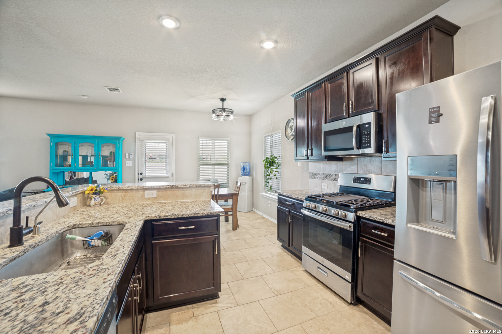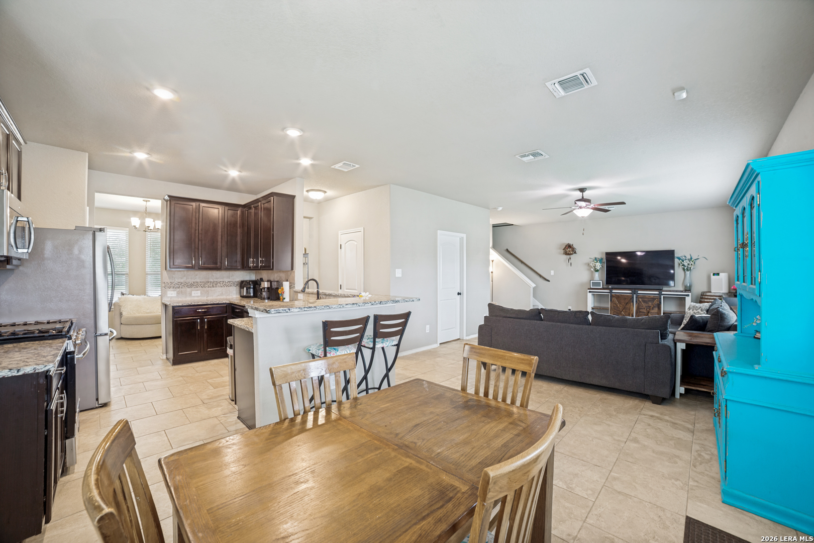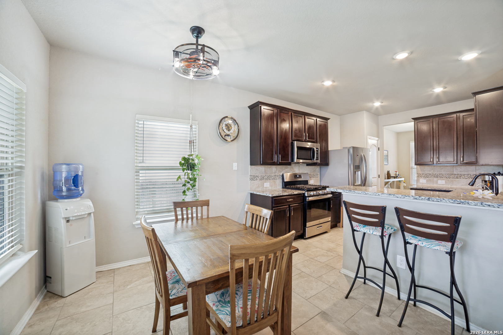 Bright, open, and designed for everyday living and entertaining, this two-story home offers space, flexibility, and an unbeatable location. Tucked into a partial cul-de-sac and conveniently situated right next to the community pool, you'll enjoy easy access to neighborhood amenities while still having a sense of privacy. Inside, the inviting floor plan features a spacious eat-in kitchen with granite countertops, stainless steel appliances, and a breakfast bar that flows seamlessly into the family room-perfect for gathering with friends and family. The breakfast area overlooks the oversize backyard and connects to a covered patio, creating the ideal spot to relax with your morning coffee or unwind in the evenings. Just off the kitchen, a separate dining area with views of the covered front porch offers versatility-use it as a formal dining space, home office, craft room, or flex space to suit your needs. Upstairs, a large loft provides endless possibilities for a game room, media space, or home theater. Step outside to a huge backyard with plenty of room to play, garden, or design your own outdoor oasis. This home combines comfort, functionality, and location-ready for you to move in and make it your own.
