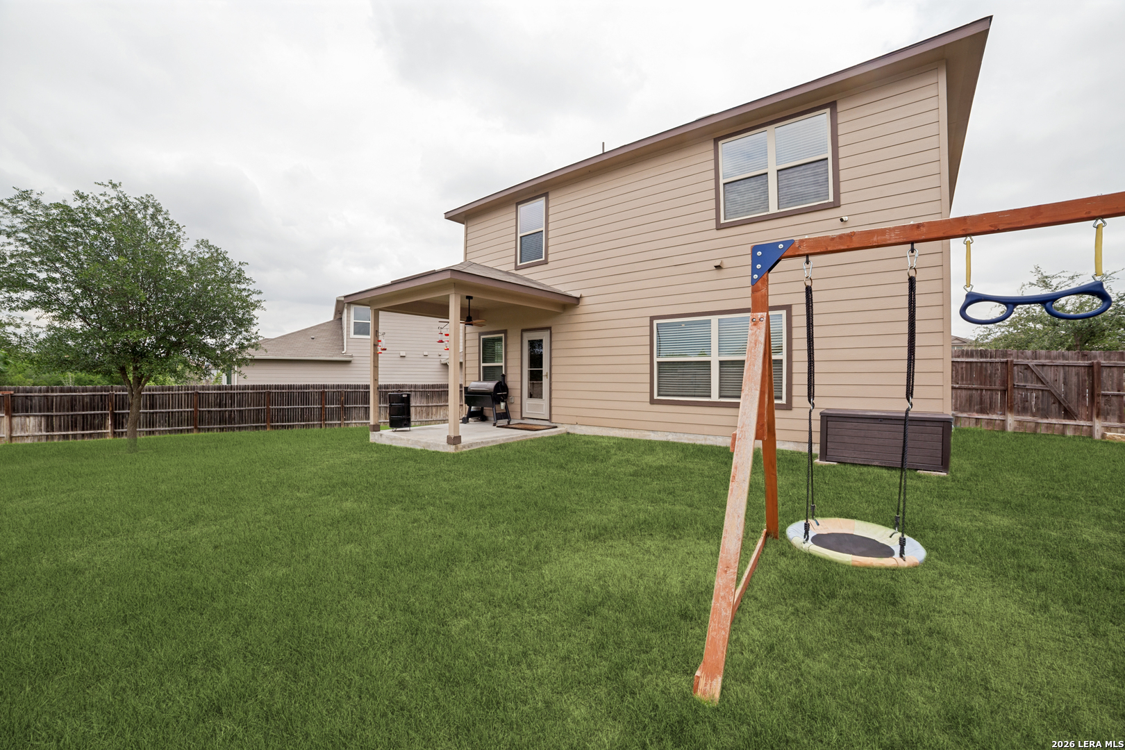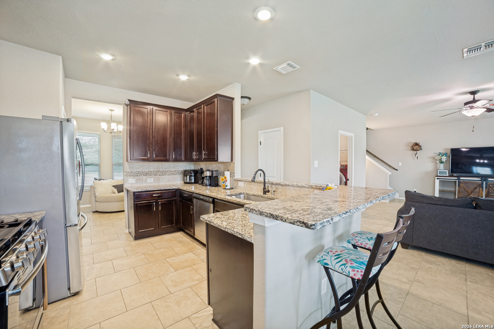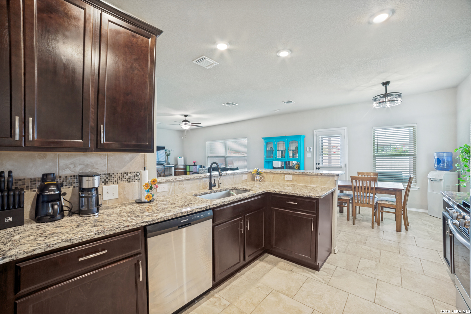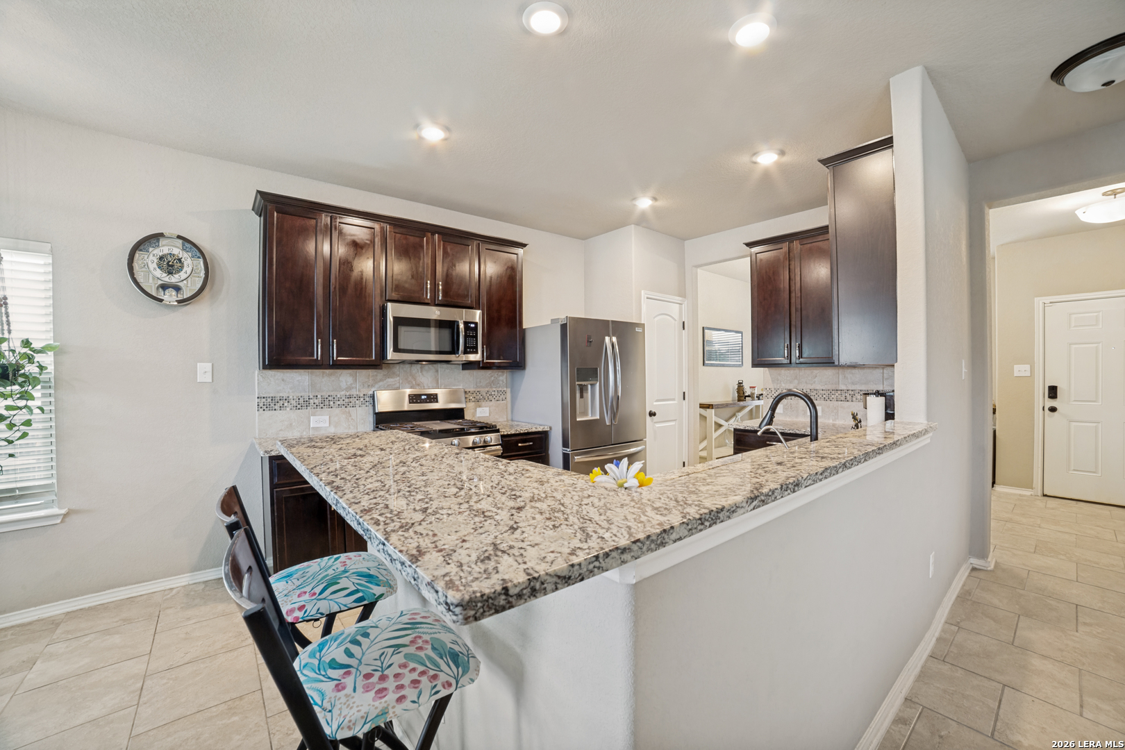 Bright, open, and designed for everyday living and entertaining, this two-story home offers space, flexibility, and an unbeatable location. Tucked into a partial cul-de-sac and conveniently situated right next to the community pool, you'll enjoy easy access to neighborhood amenities while still having a sense of privacy. Inside, the inviting floor plan features a spacious eat-in kitchen with granite countertops, stainless steel appliances, and a breakfast bar that flows seamlessly into the family room-perfect for gathering with friends and family. The breakfast area overlooks the oversize backyard and connects to a covered patio, creating the ideal spot to relax with your morning coffee or unwind in the evenings. Just off the kitchen, a separate dining area with views of the covered front porch offers versatility-use it as a formal dining space, home office, craft room, or flex space to suit your needs. Upstairs, a large loft provides endless possibilities for a game room, media space, or home theater. Step outside to a huge backyard with plenty of room to play, garden, or design your own outdoor oasis. This home combines comfort, functionality, and location-ready for you to move in and make it your own.