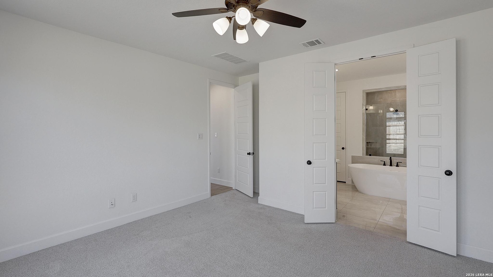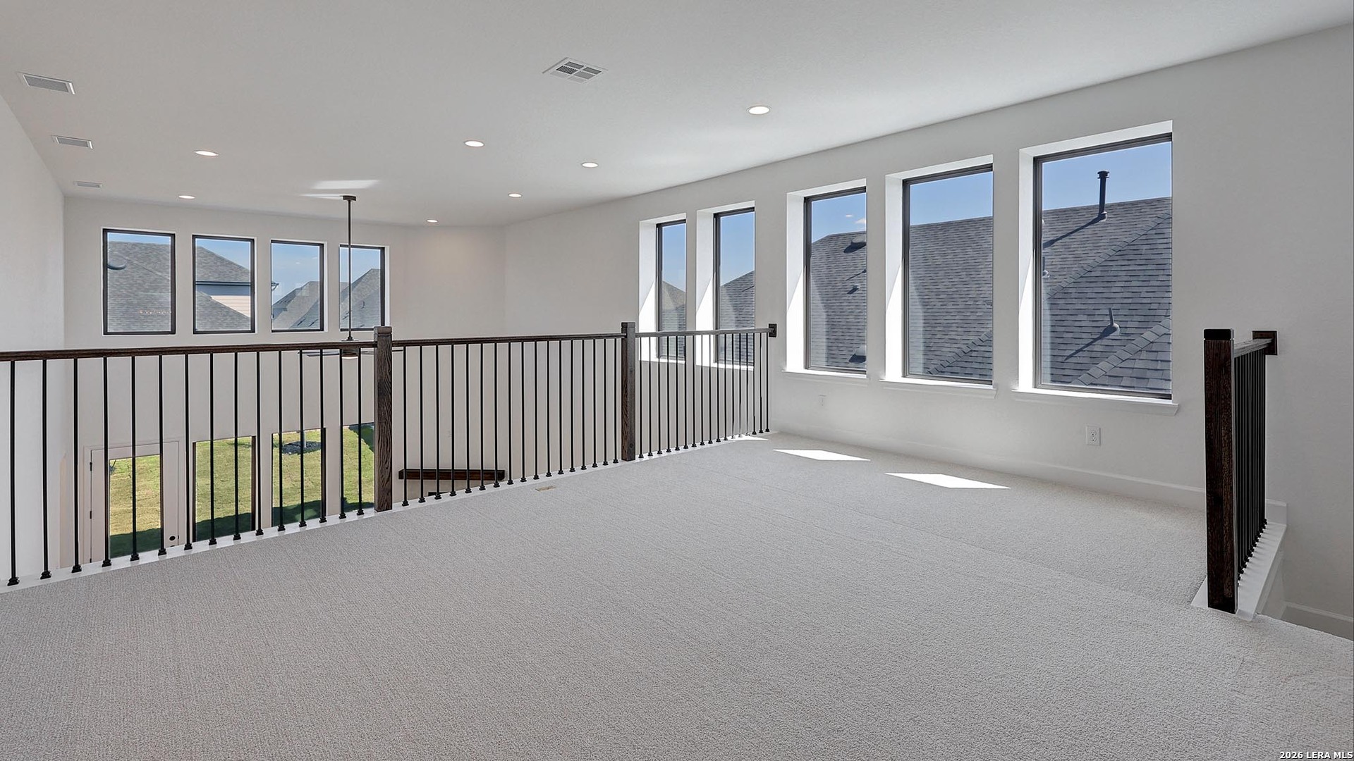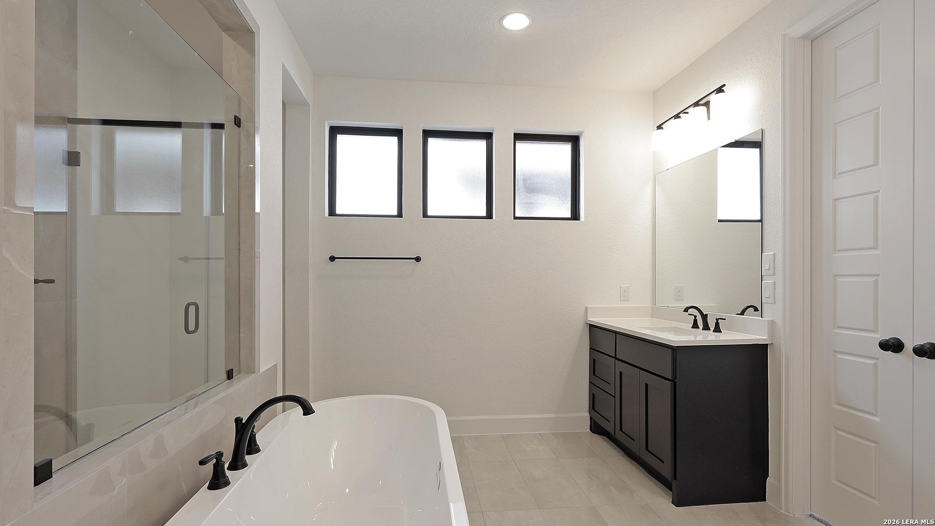 Home office with French doors set at two-story entry. Open kitchen offers deep walk-in pantry, a 5-burner gas cooktop and generous island with built-in seating space. Dining area opens to two-story family room with a wood mantel fireplace and wall of windows. Primary suite with 10-foot ceiling. Dual vanities, freestanding tub, separate glass-enclosed shower and large walk-in closet in primary bath. A second bedroom is downstairs. A game room and secondary bedrooms are upstairs. Covered backyard patio. Mud room off two-car garage.